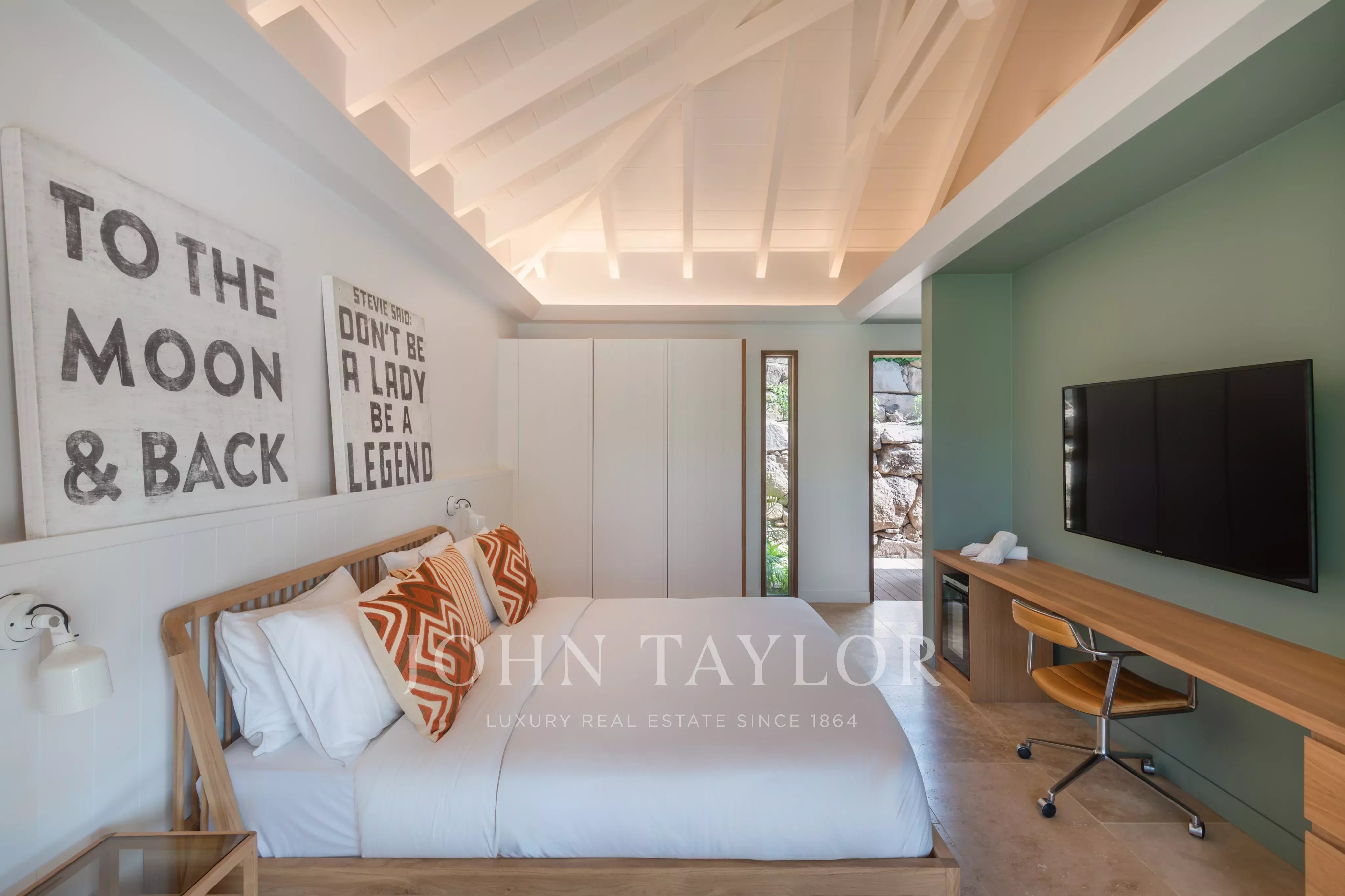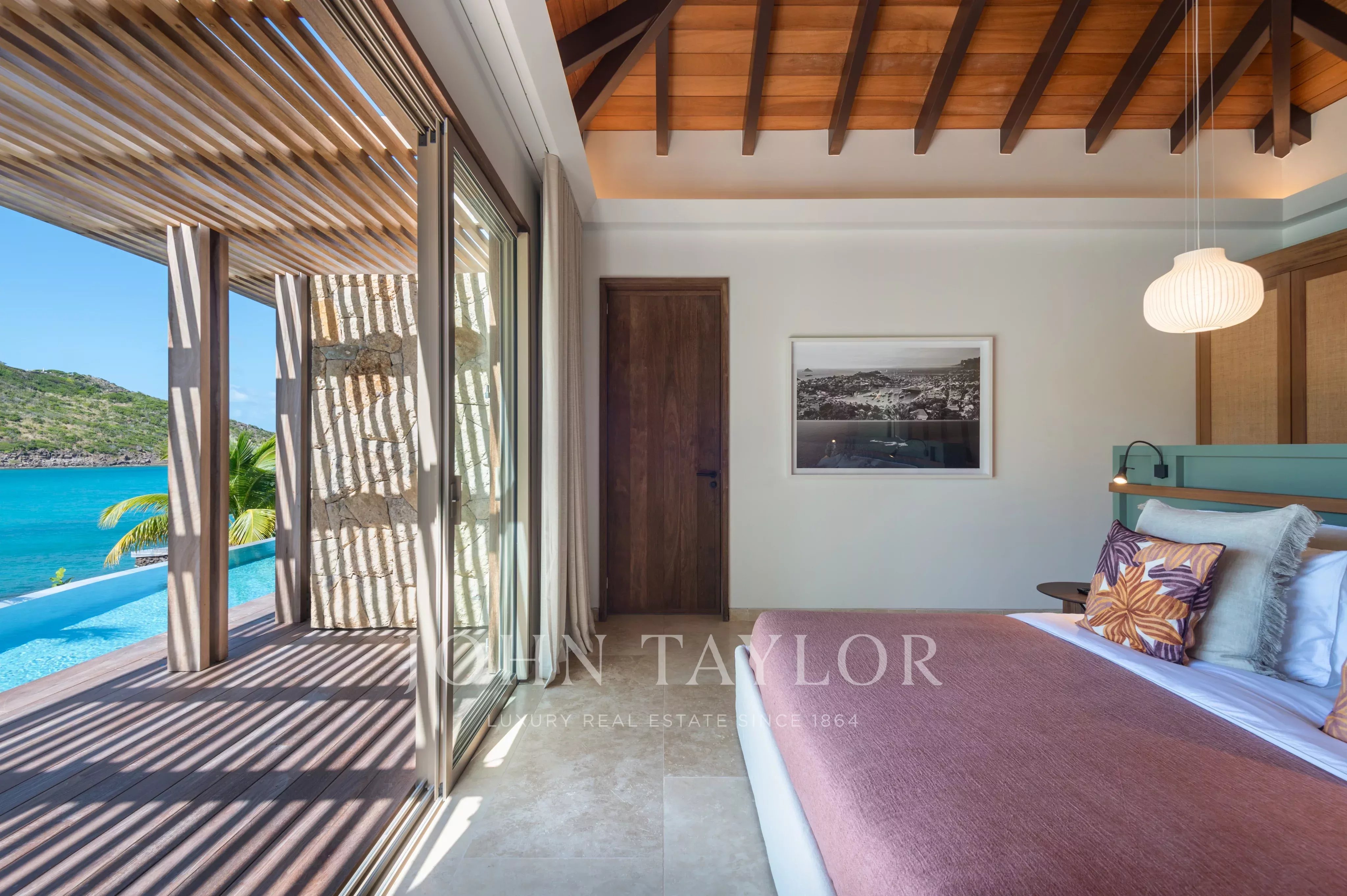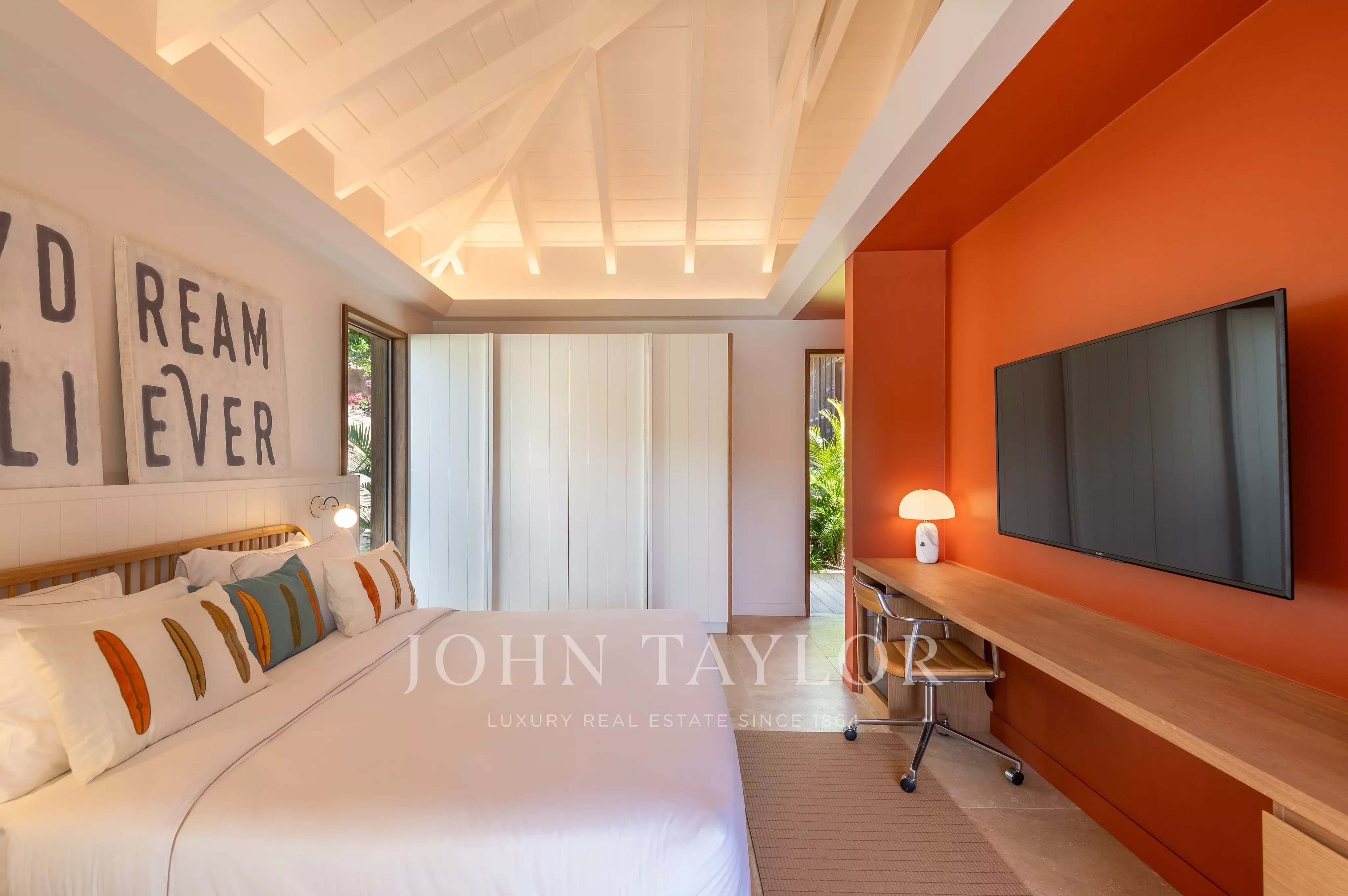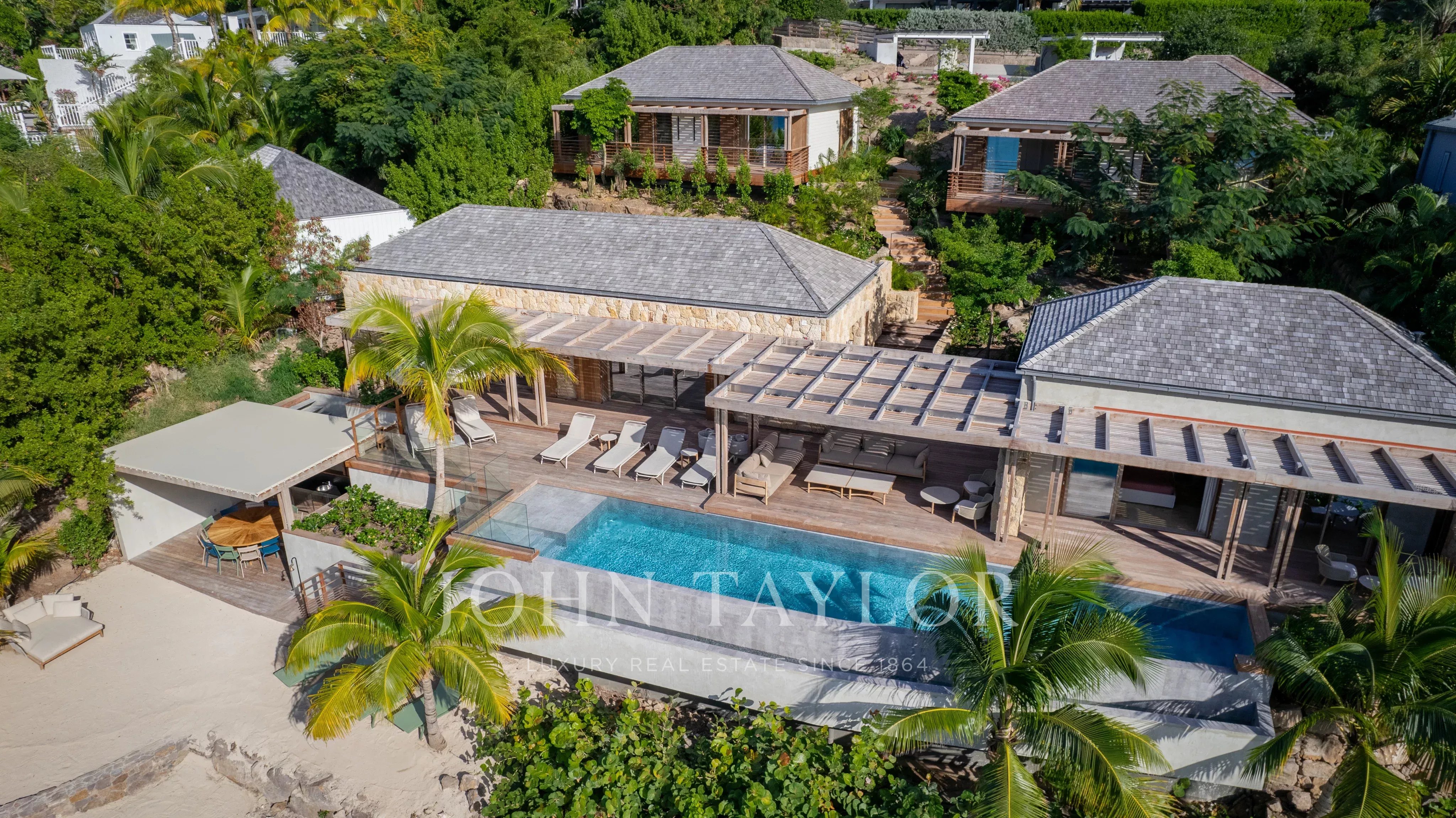 Nestled in a unique location on the island, facing the bay of Marigot and featuring its own private beach, discover this sumptuous villa designed by architect Nicolas Gessat. This achievement, with a Caribbean and contemporary style, offers incredible elegance.