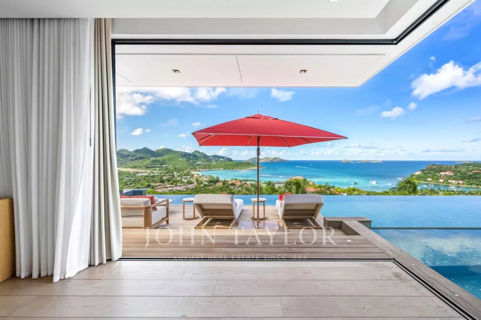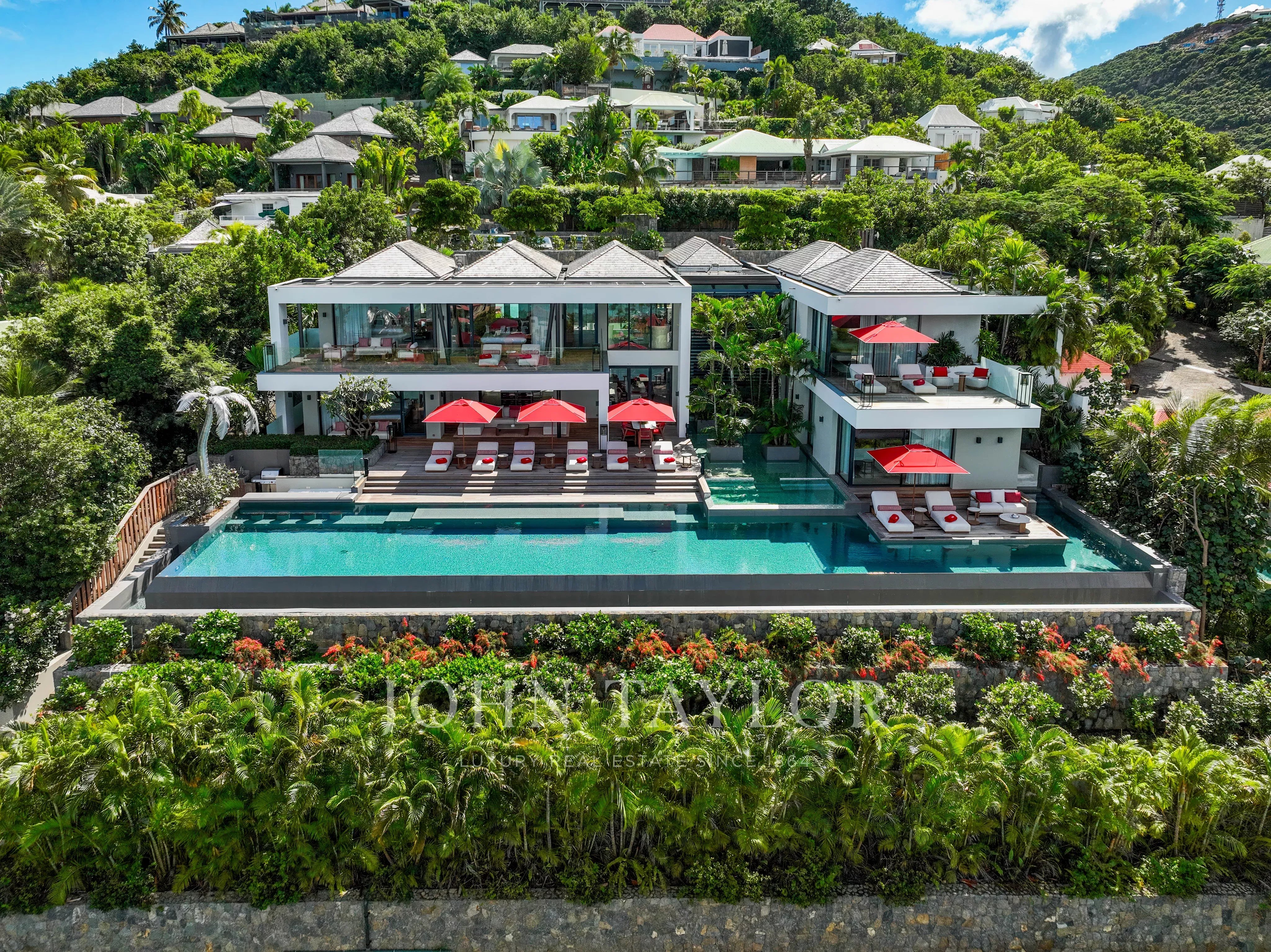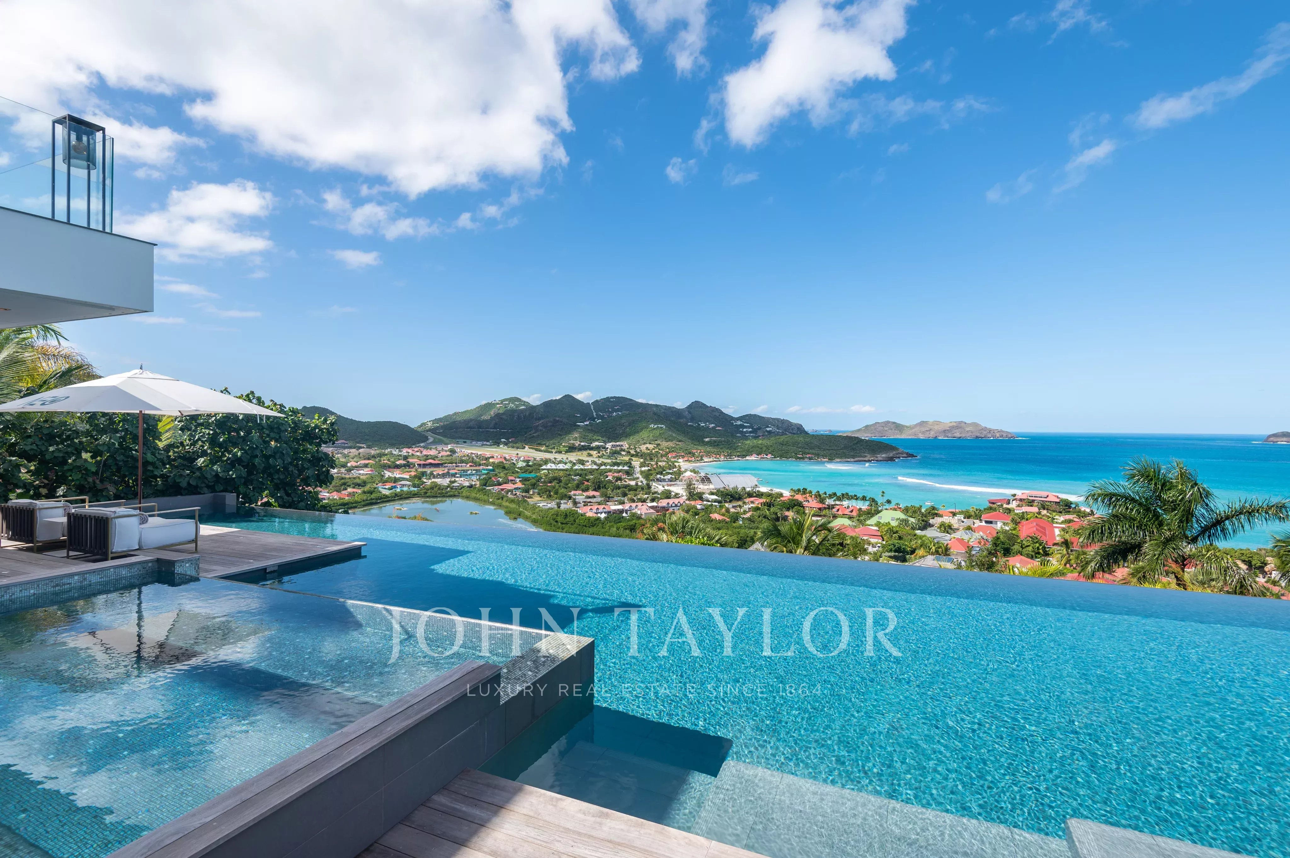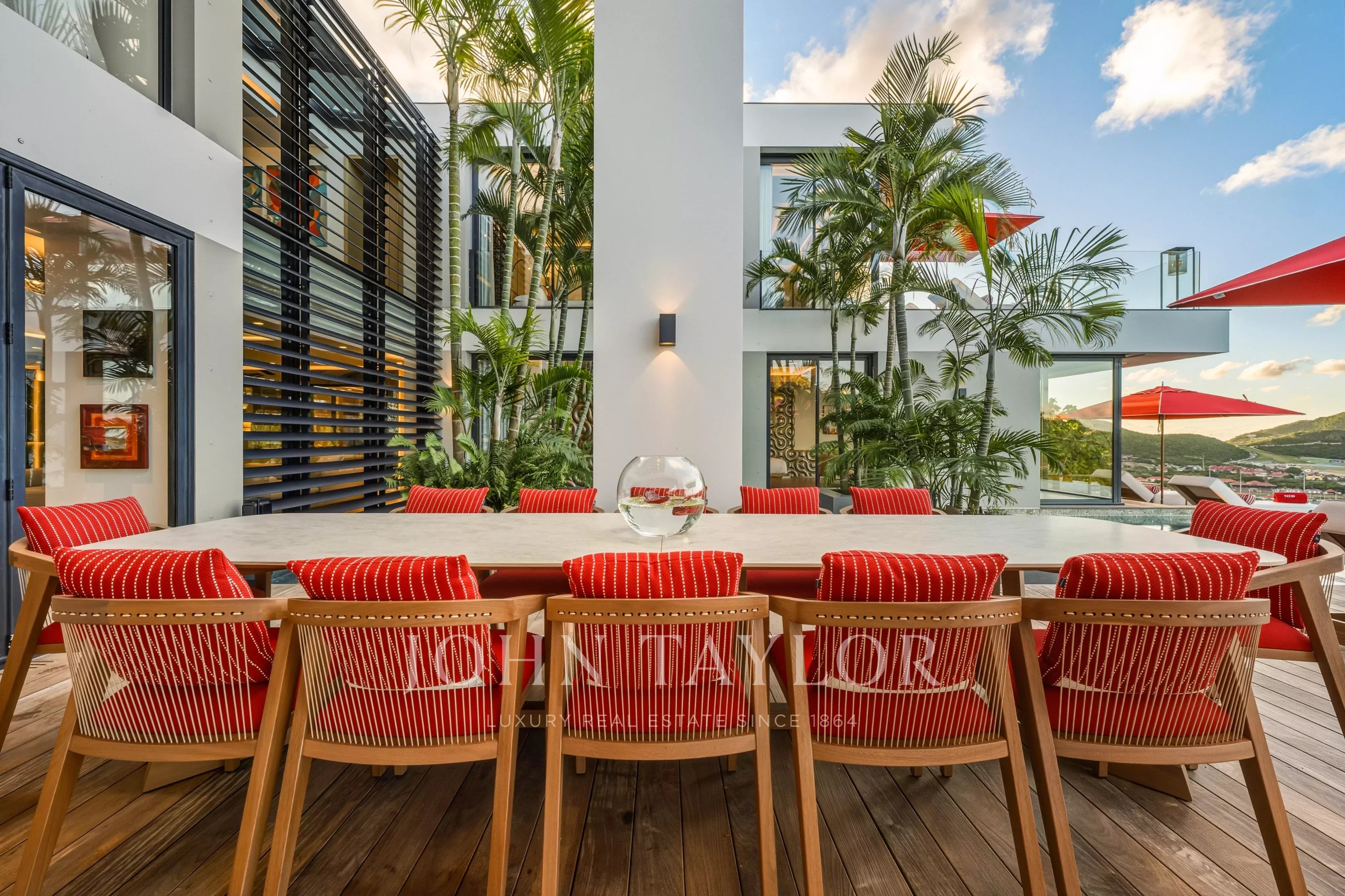 The outdoor areas match the elegance of the interiors: a spectacular terrace featuring a 30-meter heated infinity pool opens onto sweeping views over Saint-Jean Bay. The exterior also includes a lounge area and an open-air dining space.