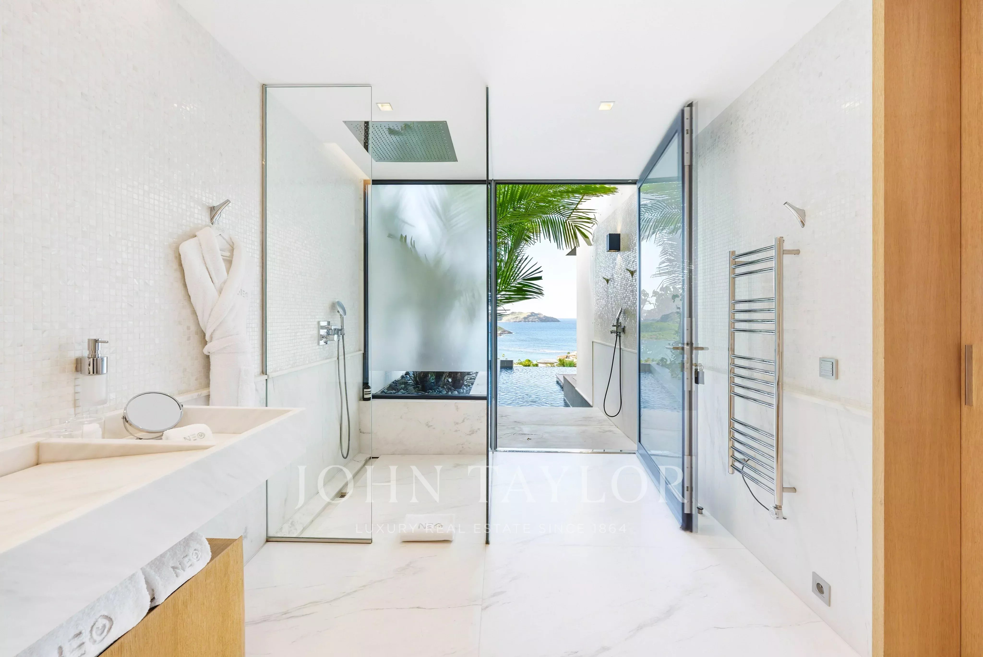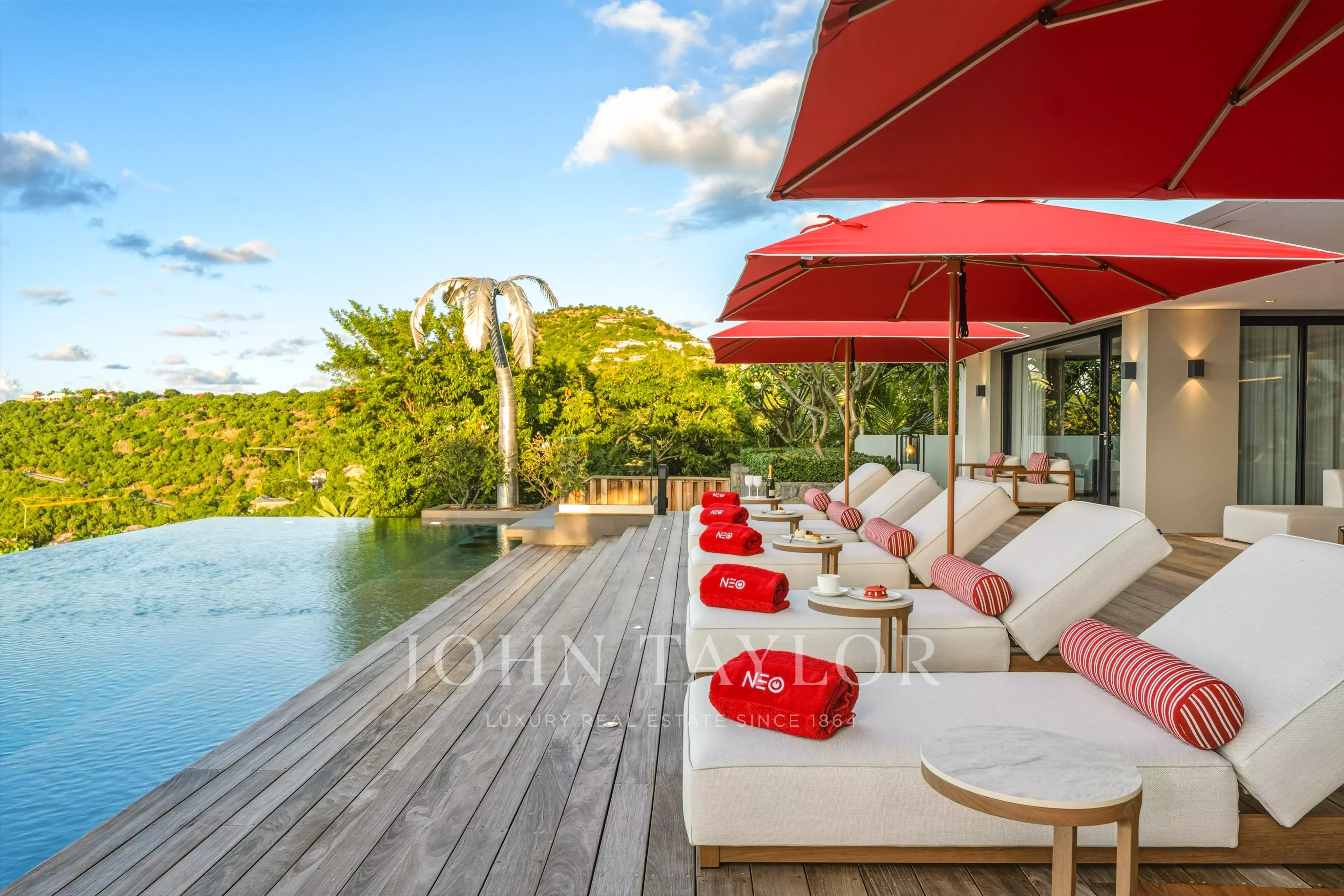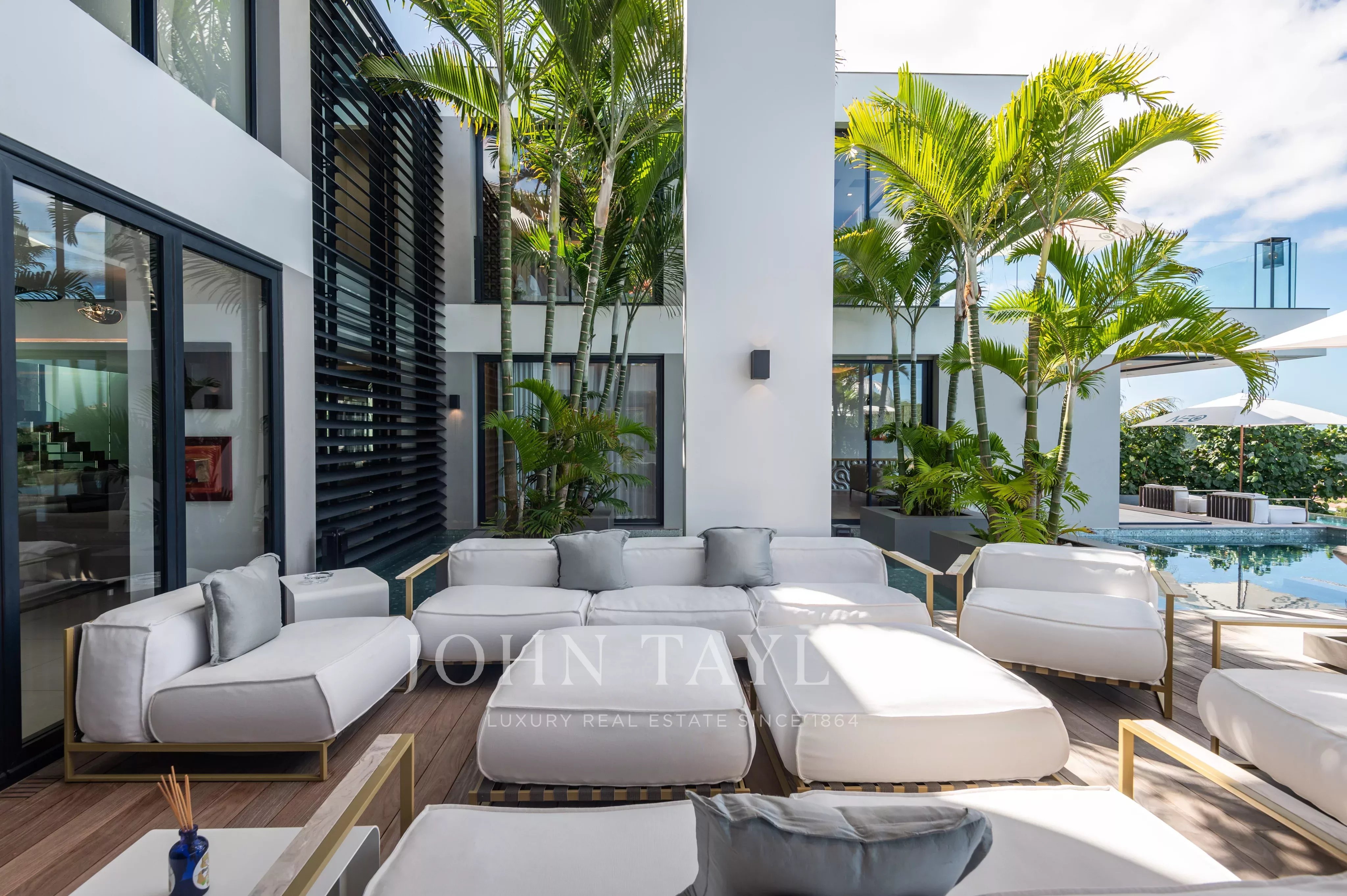 The outdoor areas match the elegance of the interiors: a spectacular terrace featuring a 30-meter heated infinity pool opens onto sweeping views over Saint-Jean Bay. The exterior also includes a lounge area and an open-air dining space.