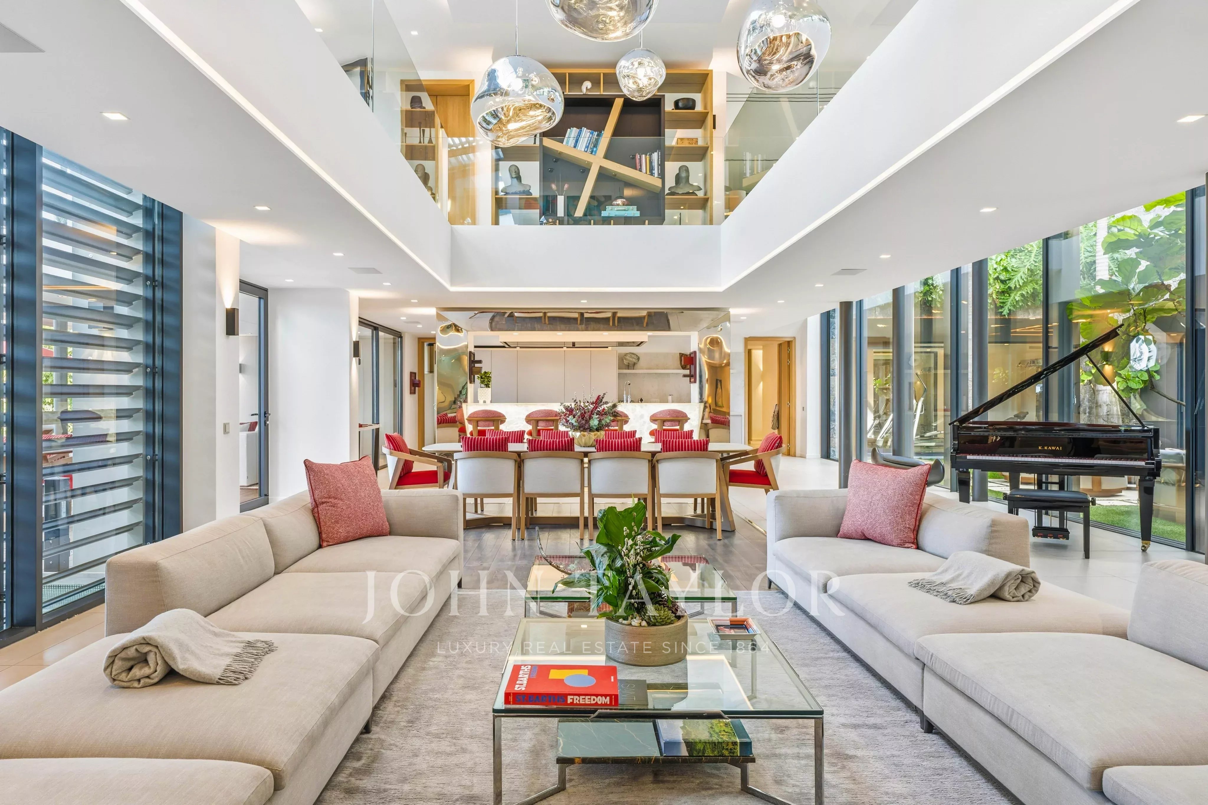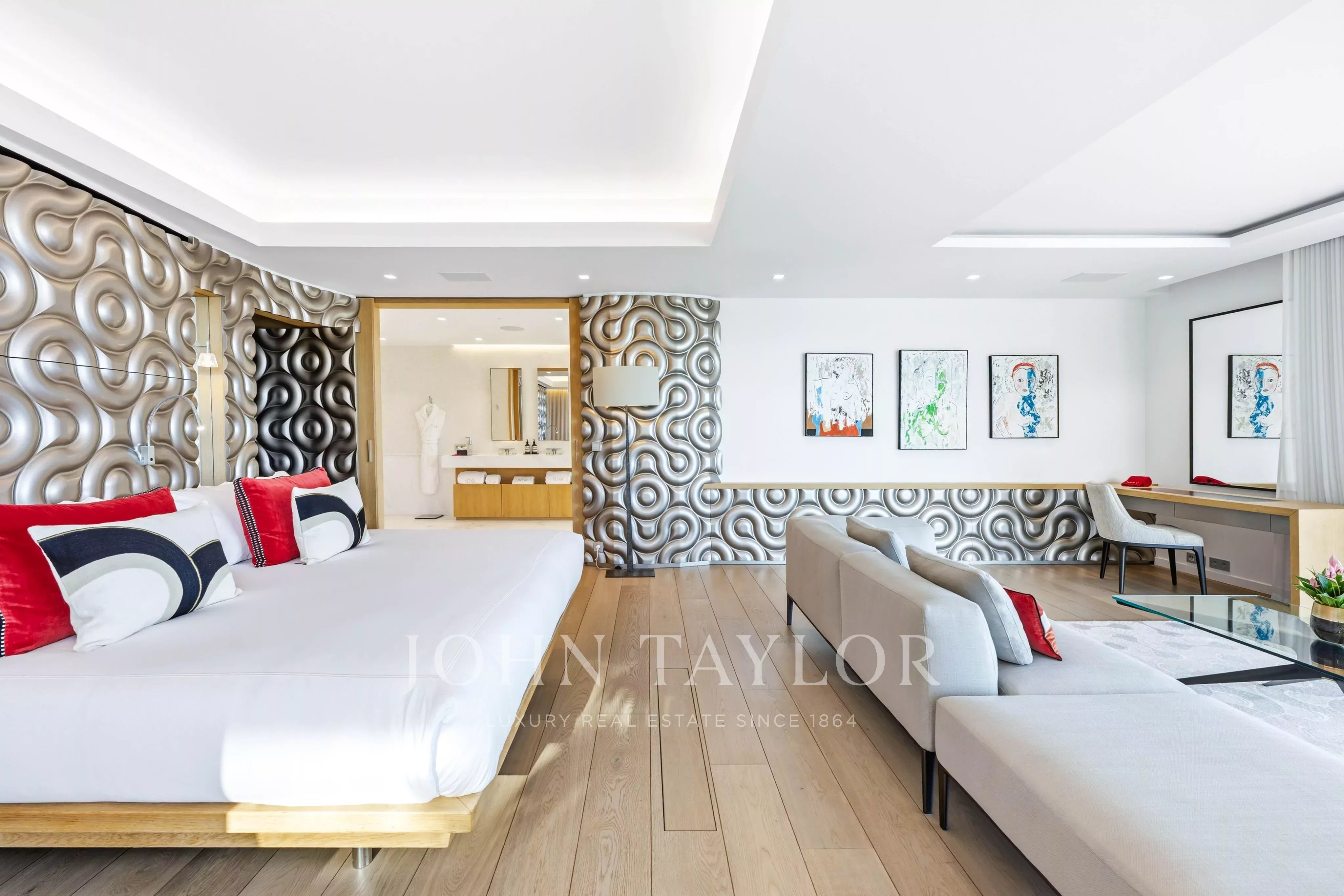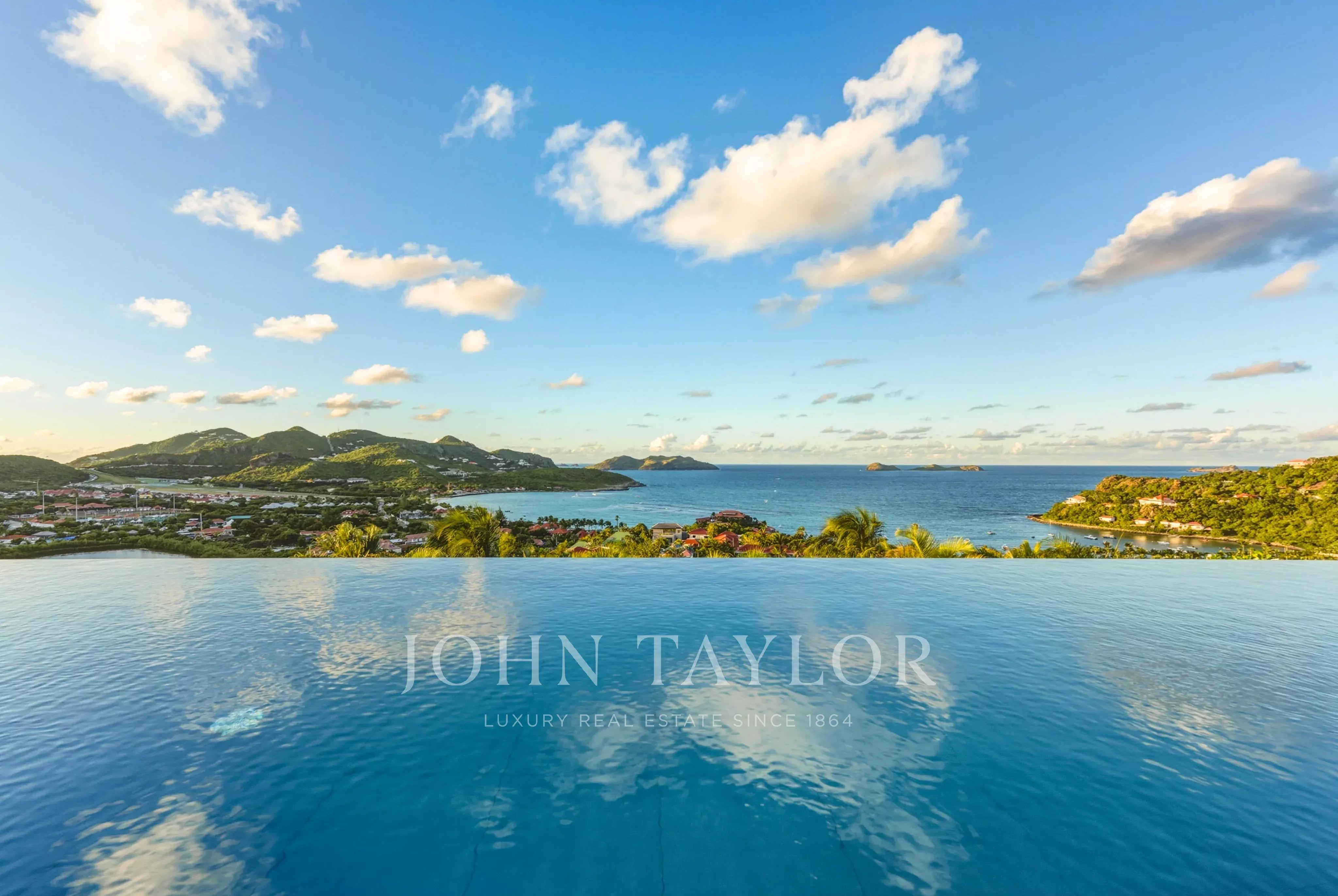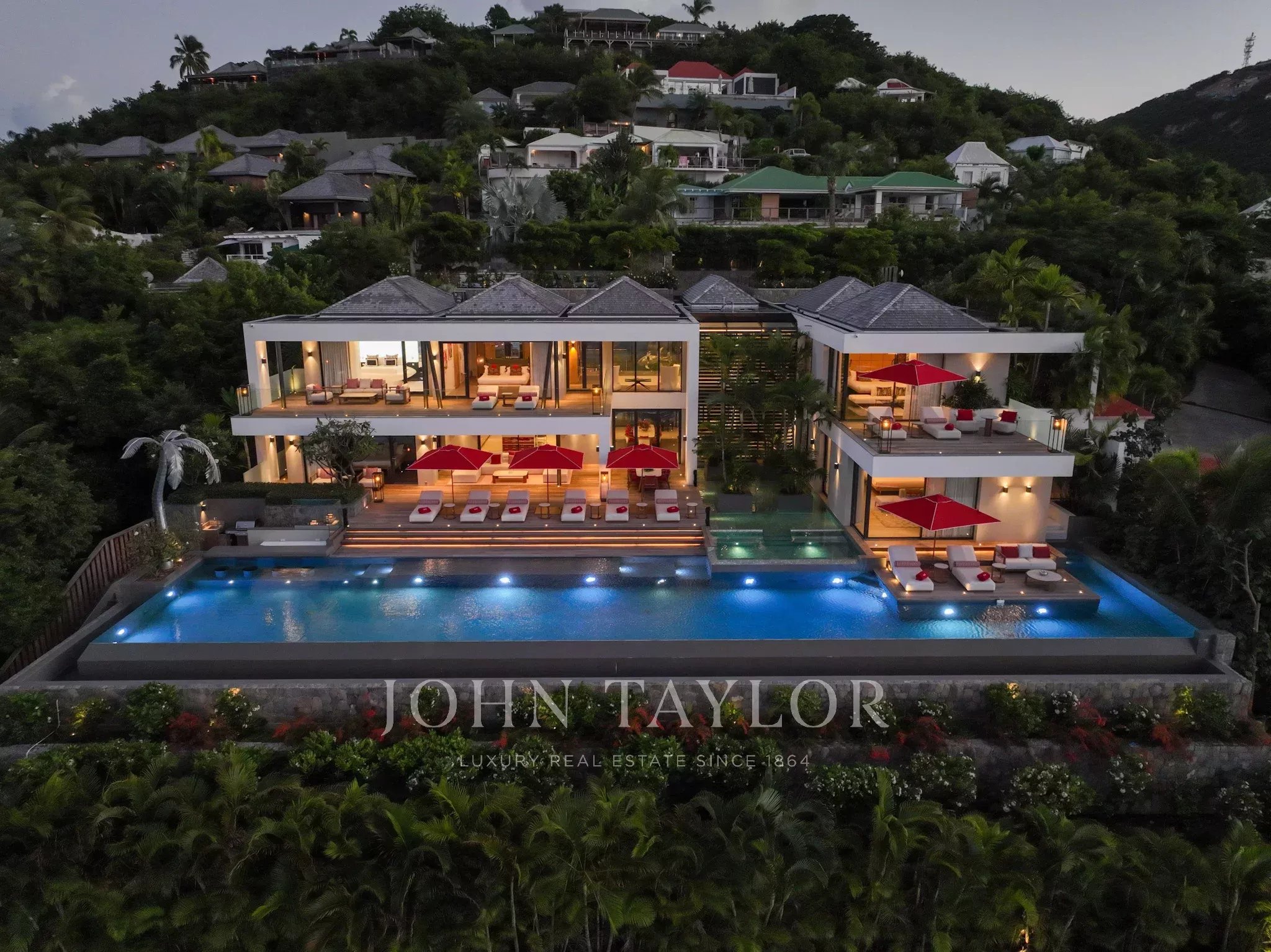 The outdoor areas match the elegance of the interiors: a spectacular terrace featuring a 30-meter heated infinity pool opens onto sweeping views over Saint-Jean Bay. The exterior also includes a lounge area and an open-air dining space.