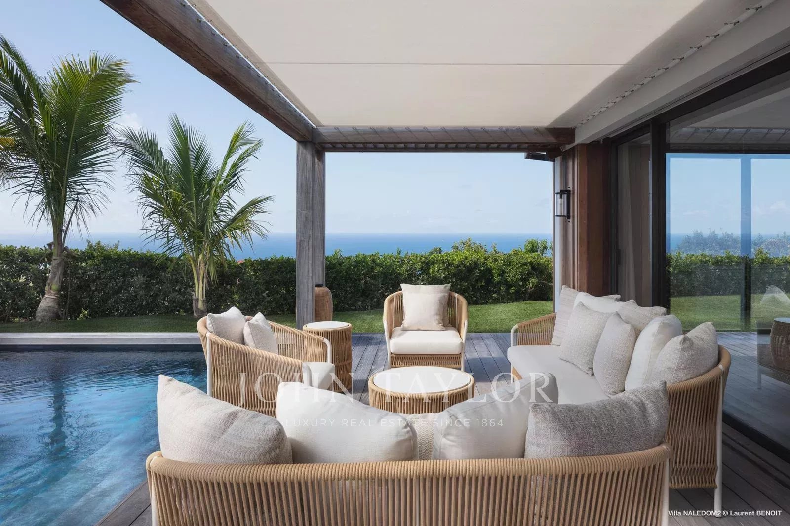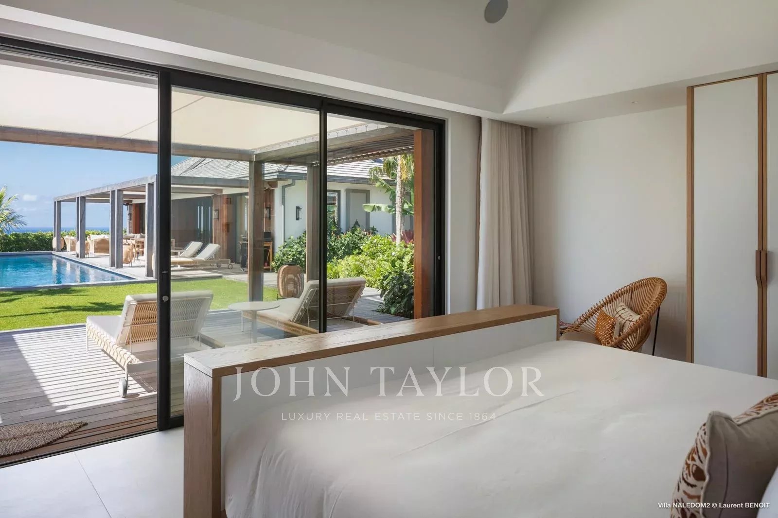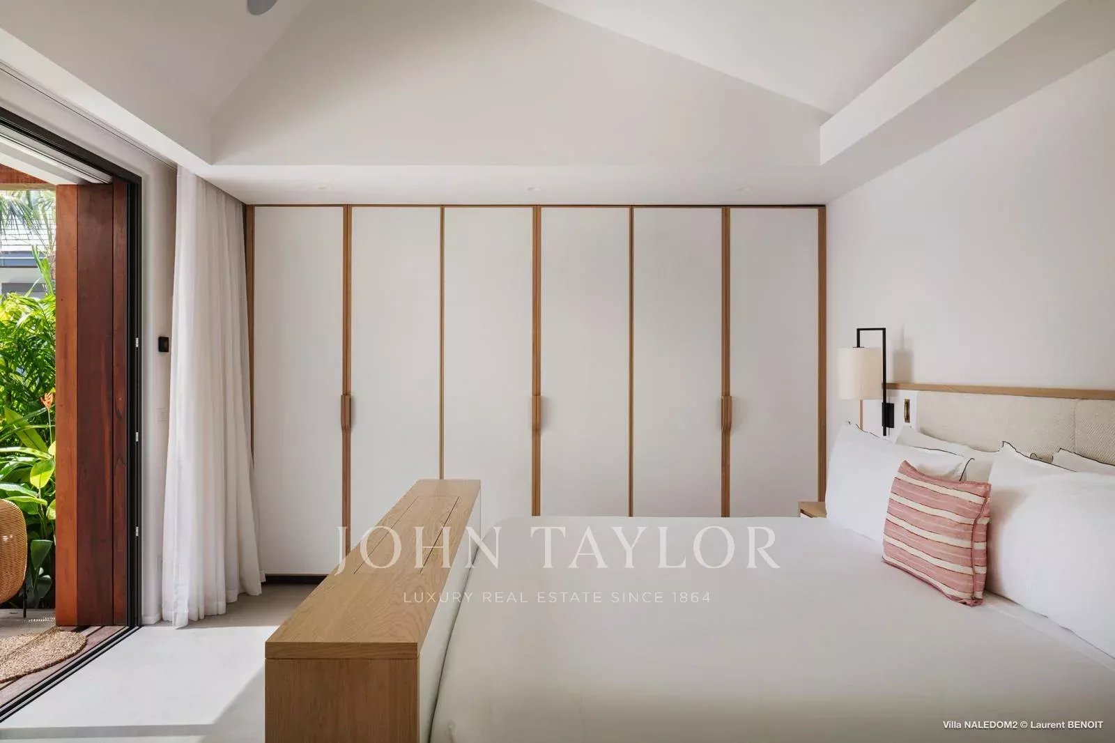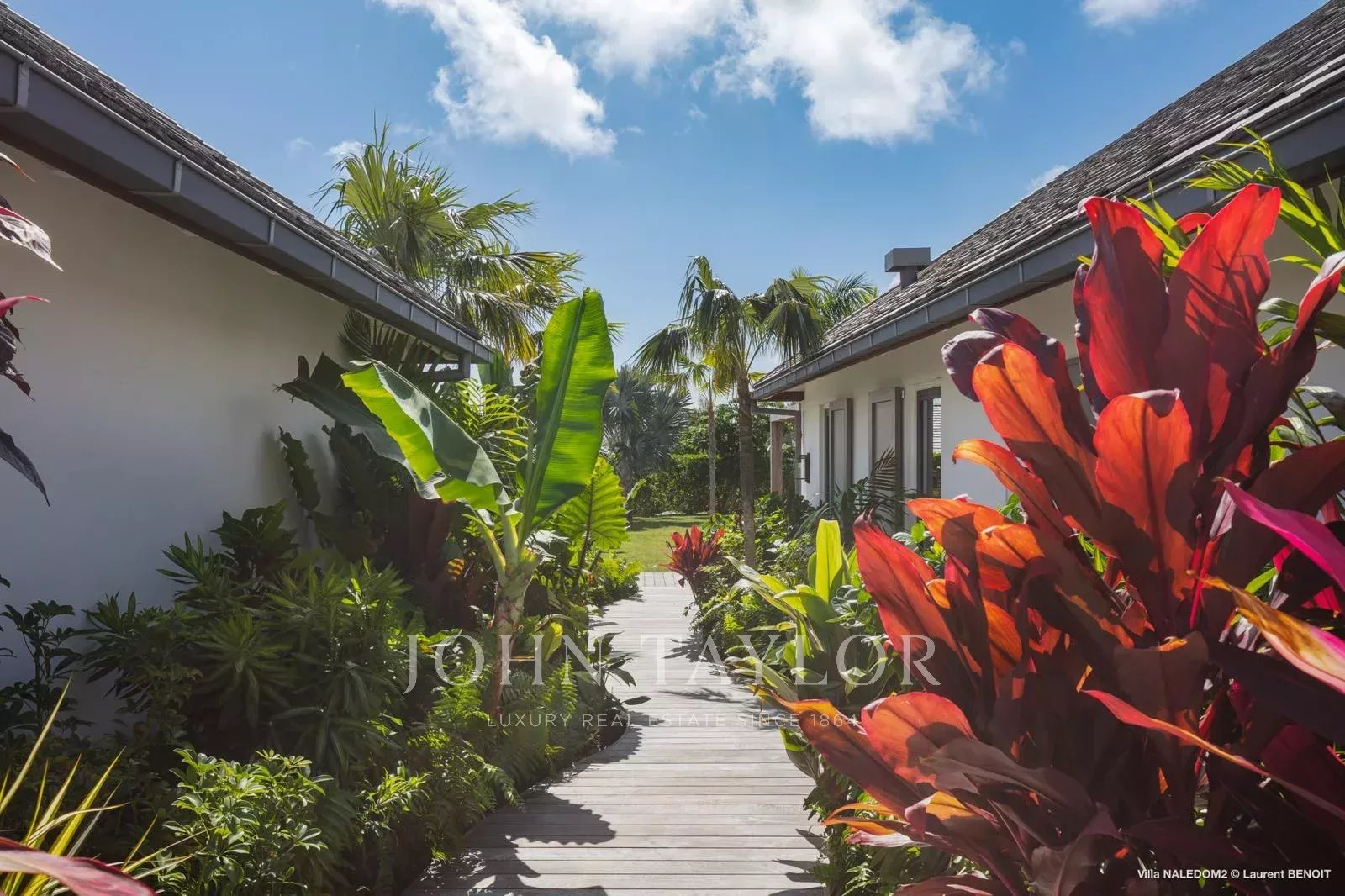 Access to the villa is via a wooden walkway, set within a lush tropical garden, gradually opening onto a serene setting where sea views unfold progressively, immediately inviting a sense of calm.