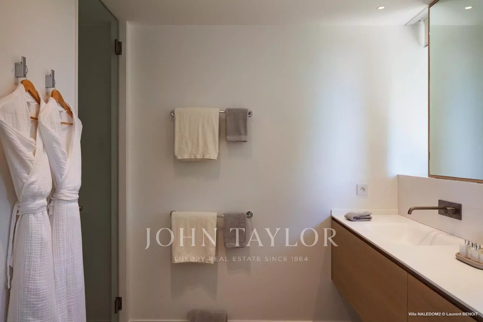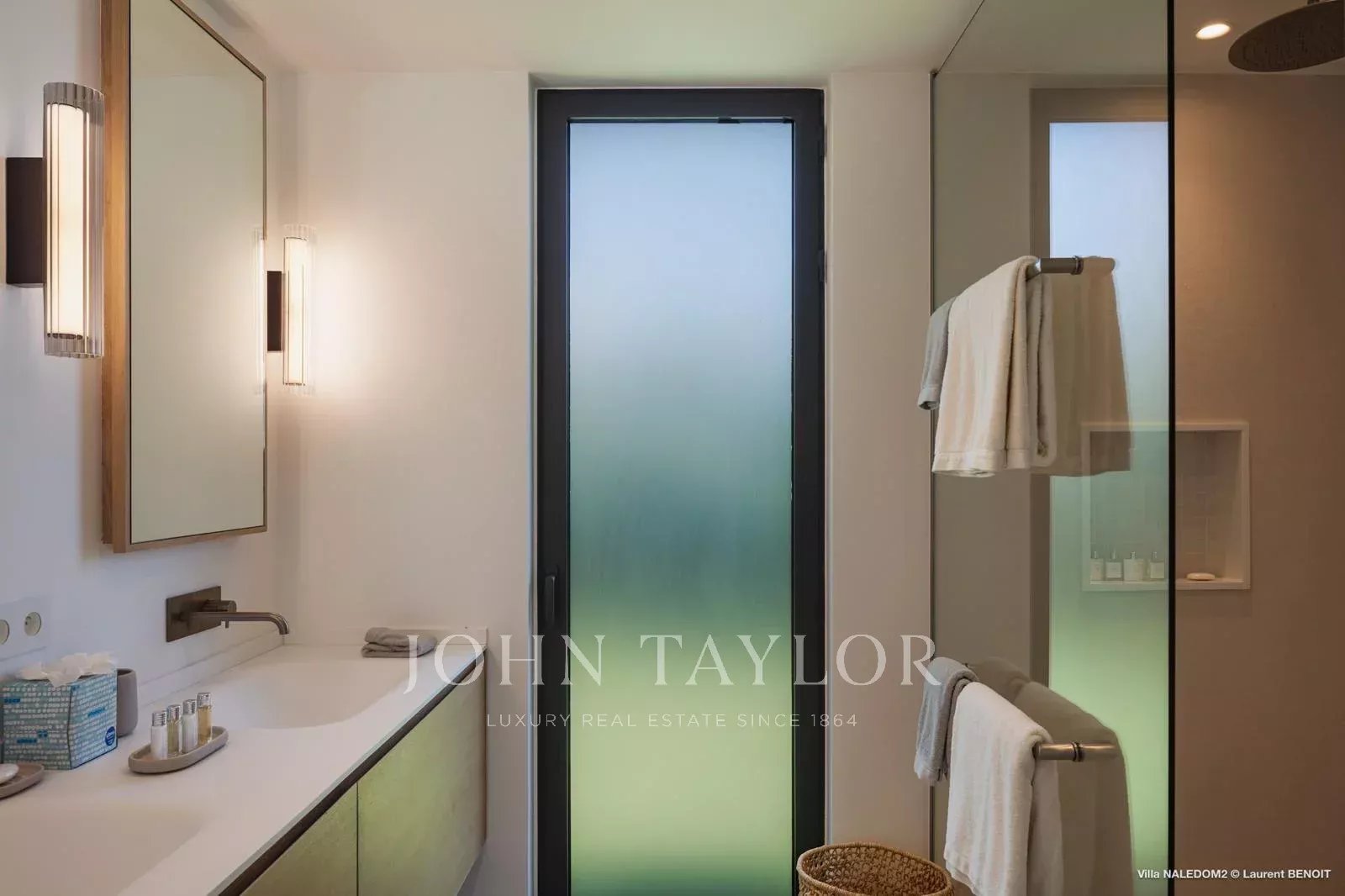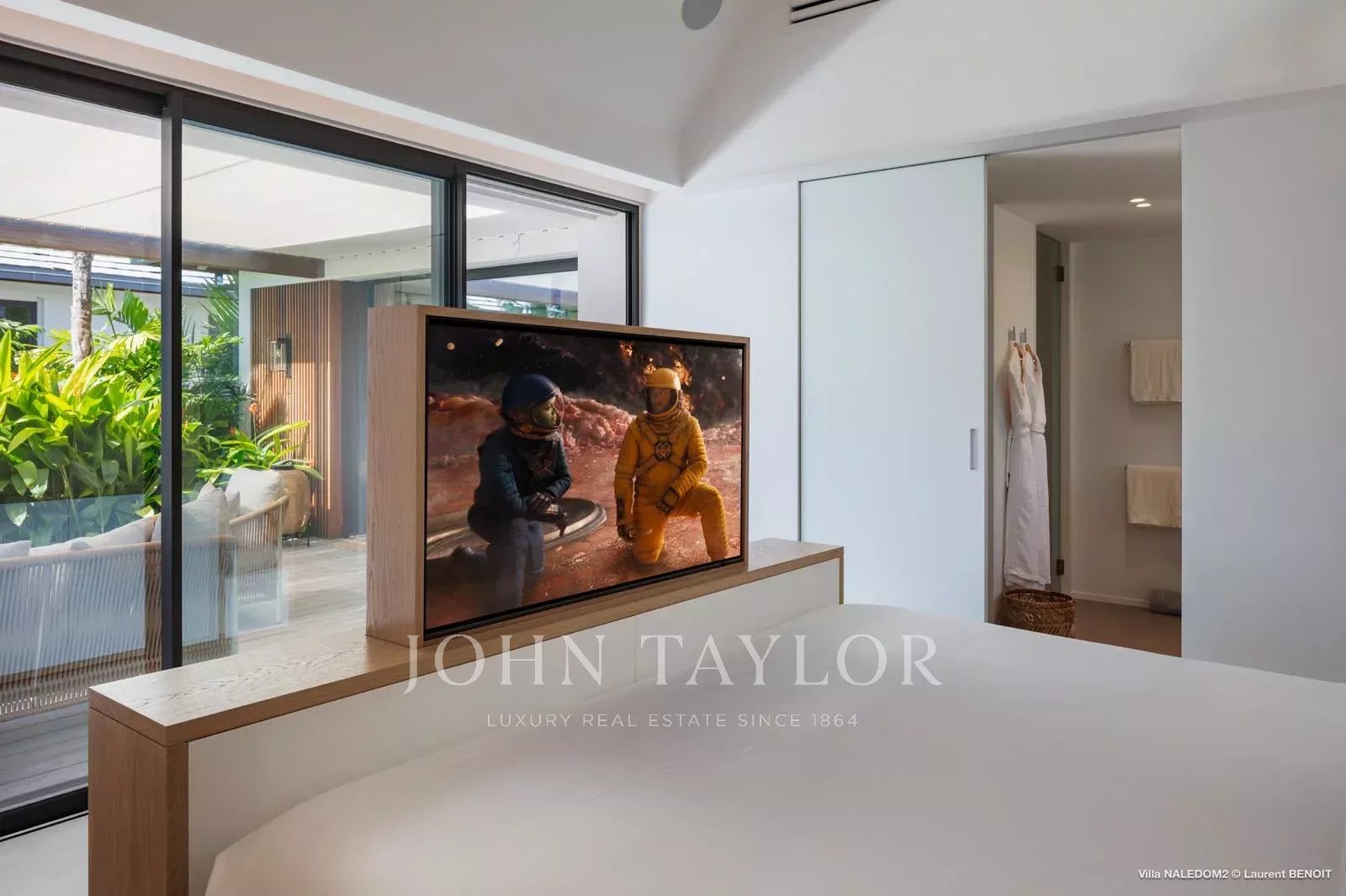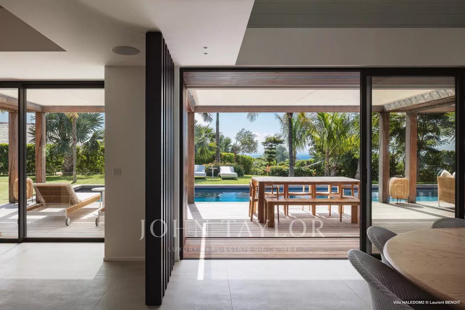 Access to the villa is via a wooden walkway, set within a lush tropical garden, gradually opening onto a serene setting where sea views unfold progressively, immediately inviting a sense of calm.