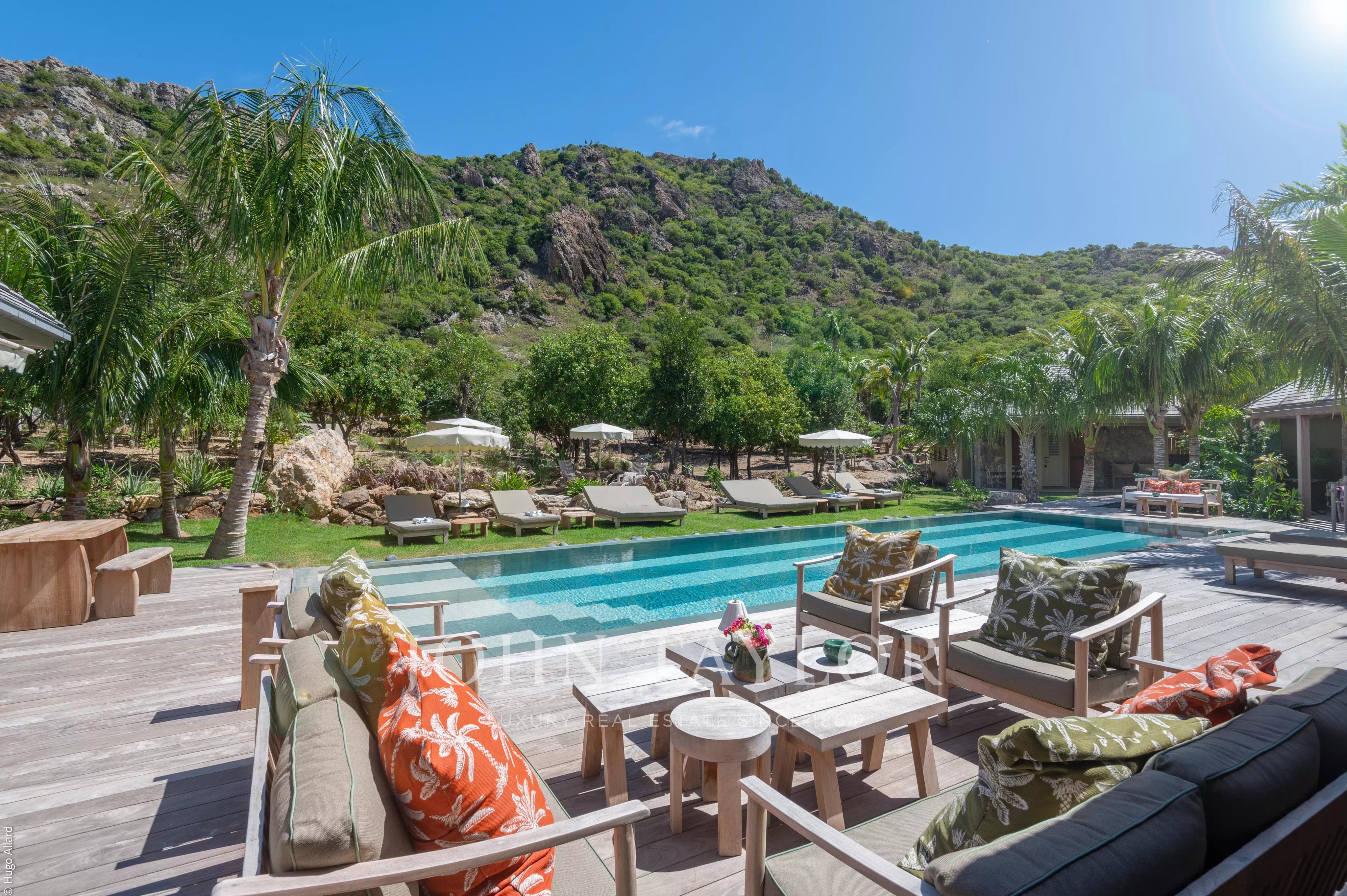 At the heart of the property, the heated swimming pool terrace serves as a true focal point, surrounded by lush tropical vegetation and framed by the green hills of Saline, offering an immersive and tranquil environment.