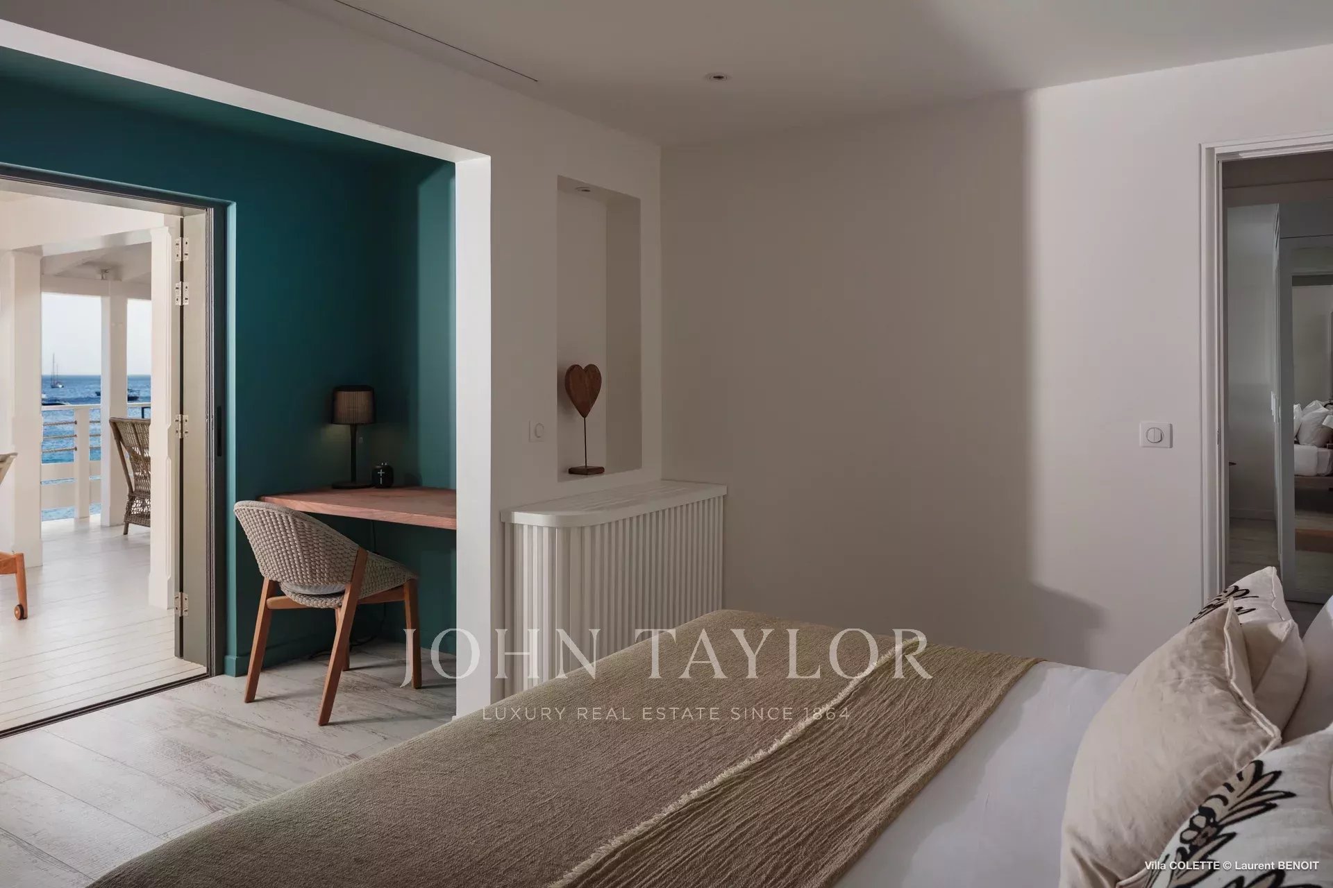 Villa COLETTE has six air-conditioned bedrooms, all with en-suite bathrooms. Four rooms are located in the main building, three of which have sea views, while two additional rooms occupy an independent pavilion, ideal for families.