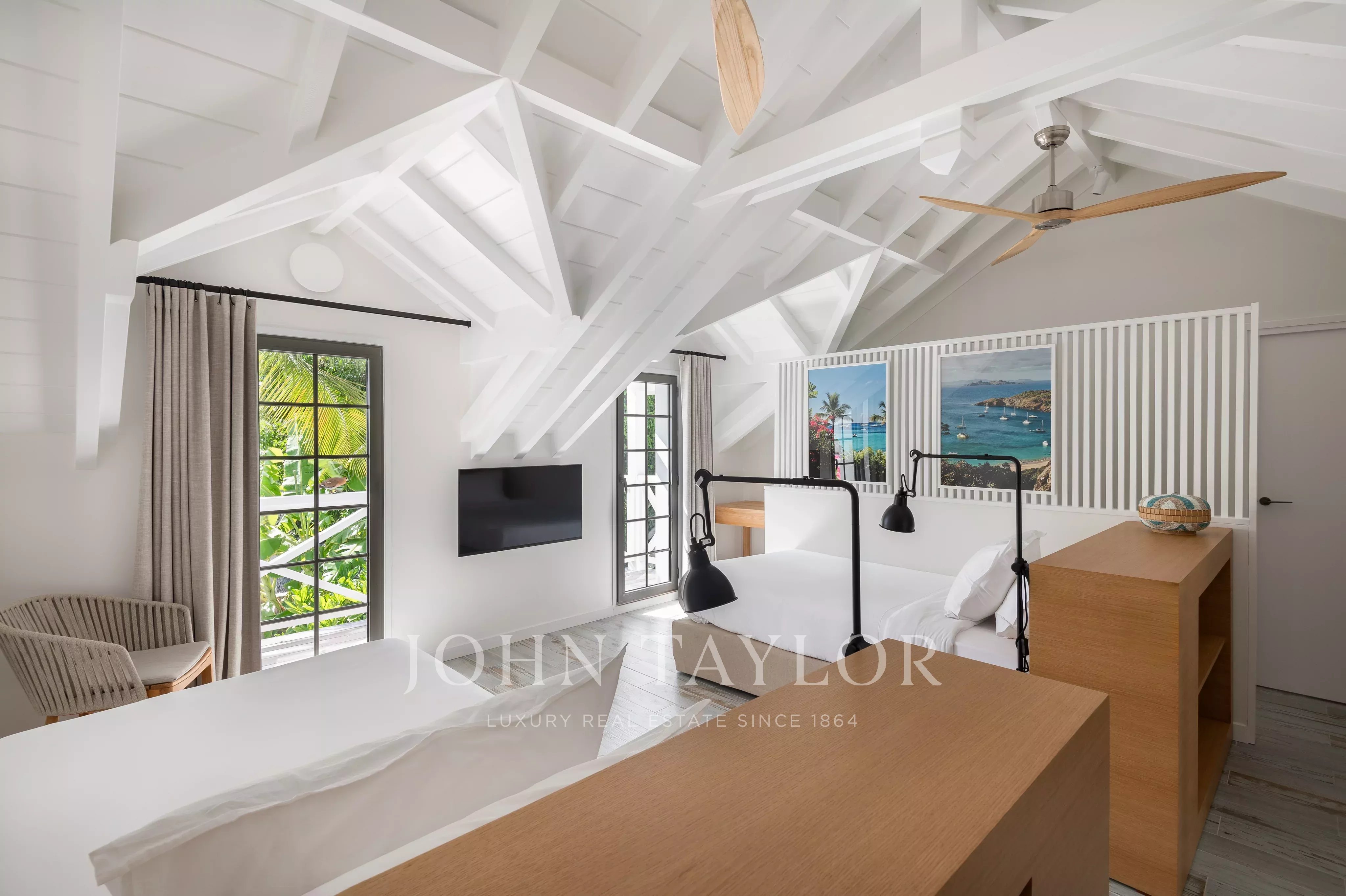 Exterior spaces are particularly well cared for, with several terraces offering unobstructed views of the harbor and ocean. A covered dining room lets you enjoy meals al fresco, while sun loungers and deckchairs invite you to relax and watch the sun set. A second terrace features a bar and dining area around the pool.
