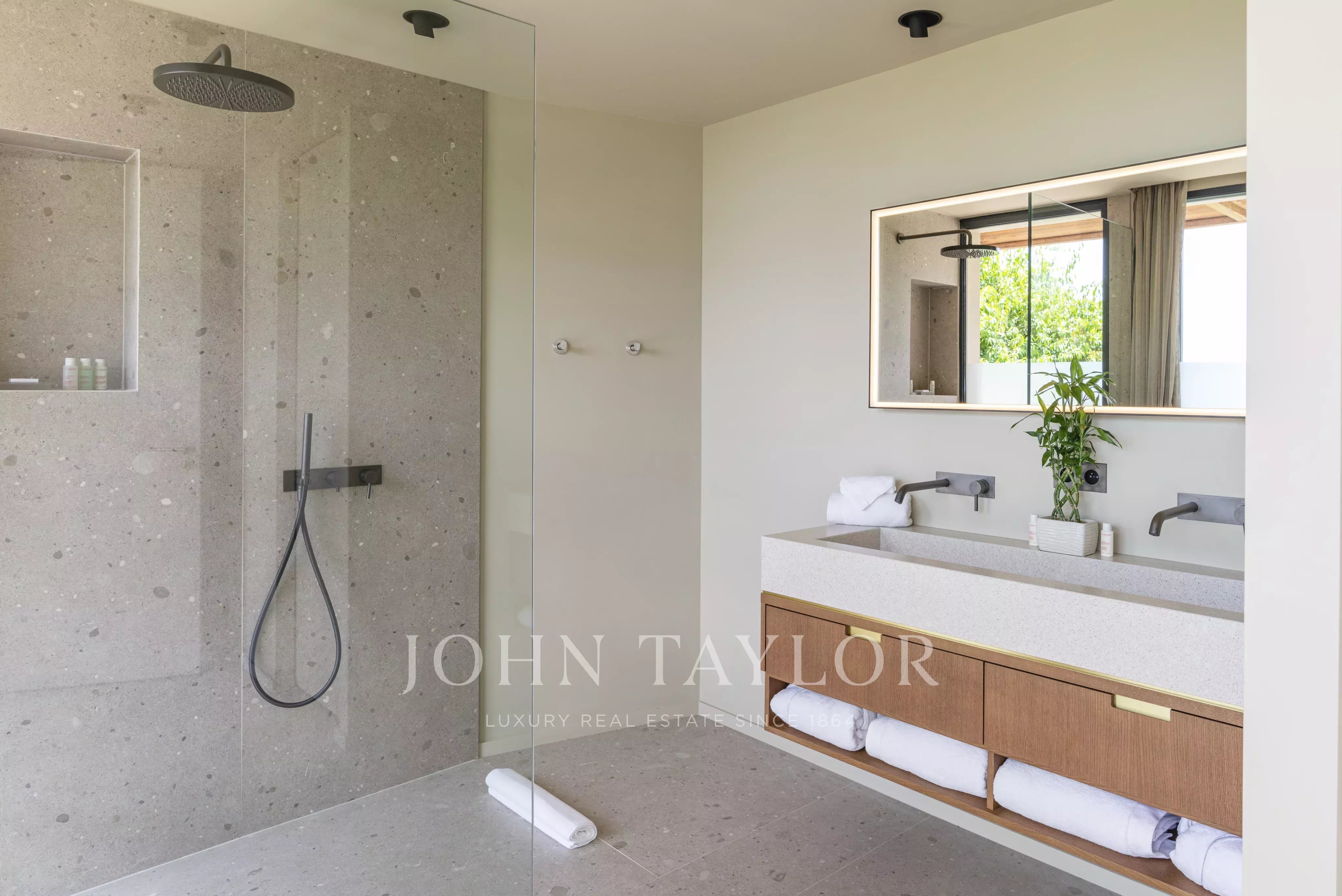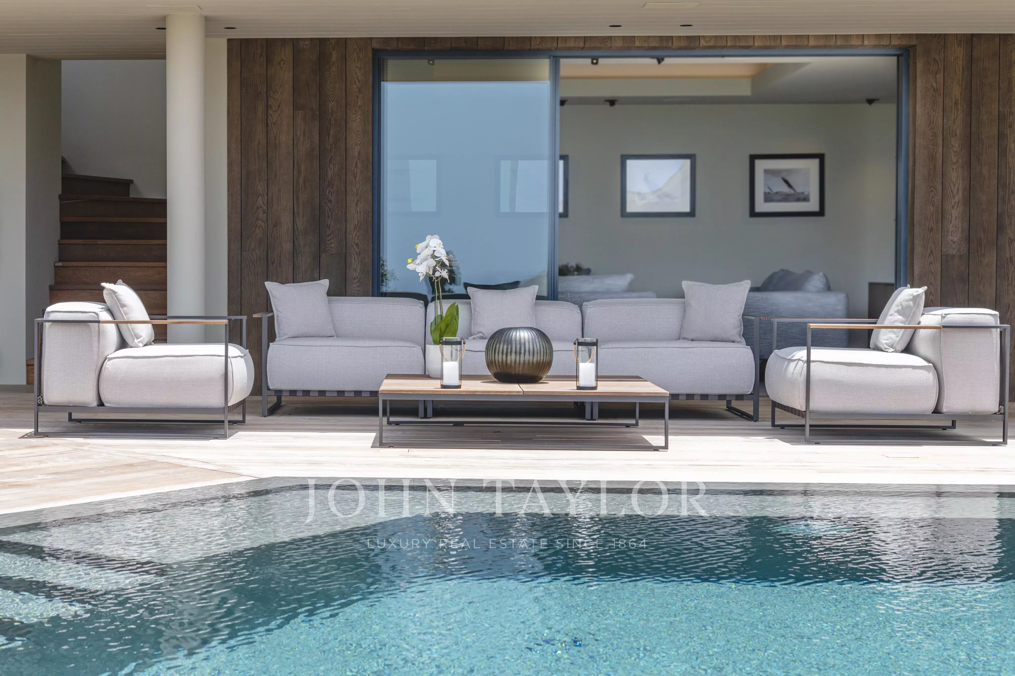 The villa features a bright and soothing atmosphere, with open living spaces extending seamlessly onto a terrace facing the horizon. The swimming pool, ideally positioned with sea views, invites relaxation throughout the day.