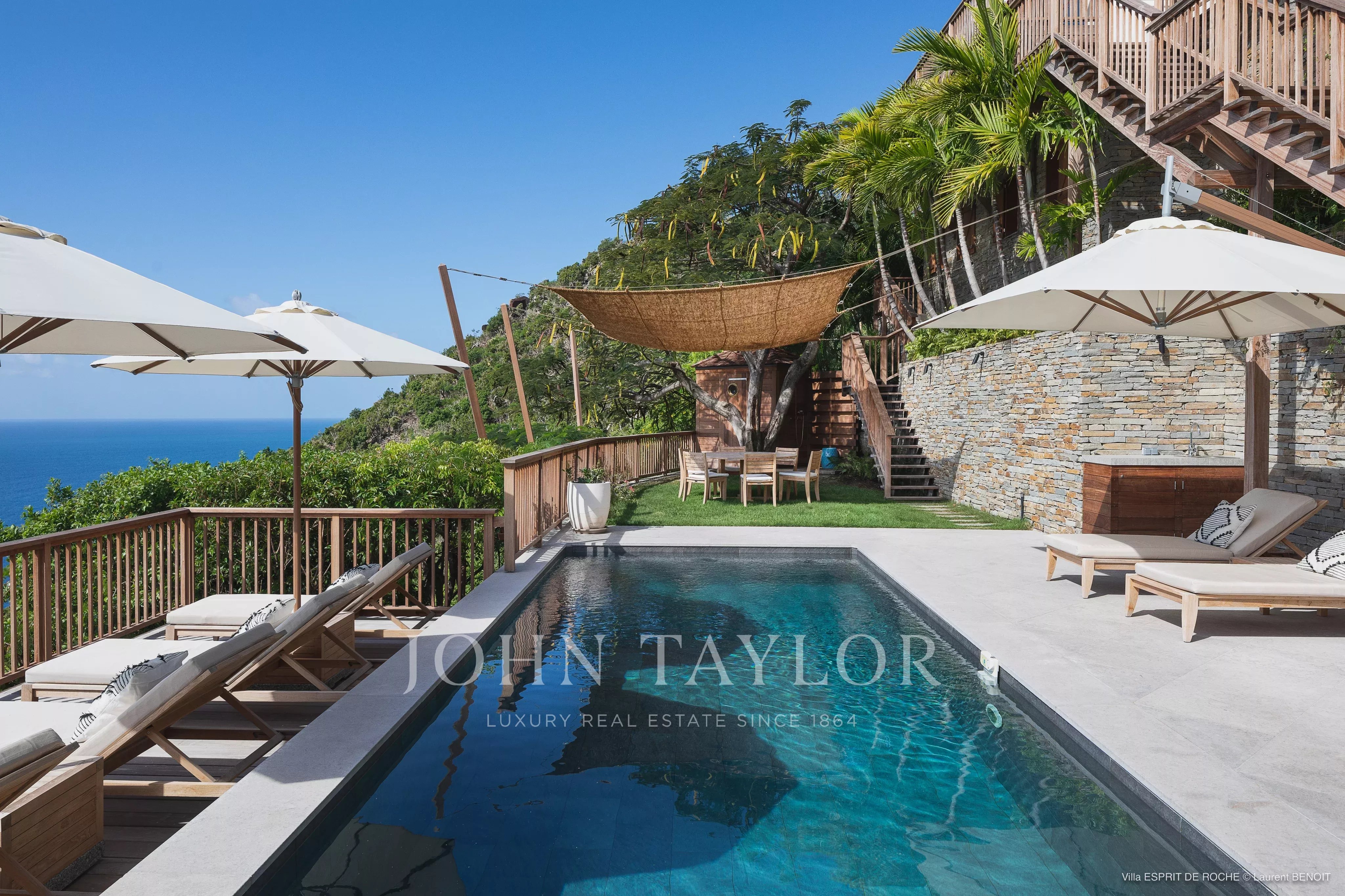 The villa ESPRIT DE ROCHE embodies rare elegance, perched on a hillside in the sought-after neighborhood of Colombier. This exceptional property with three bedrooms, featuring a swimming pool, offers an unforgettable daily spectacle: sunsets burning the ocean as far as the eye can see. Nestled in the heart of lush vegetation typical of Saint Barthélemy, it hosts up to six guests seeking a private stay, combining refinement and absolute privacy.