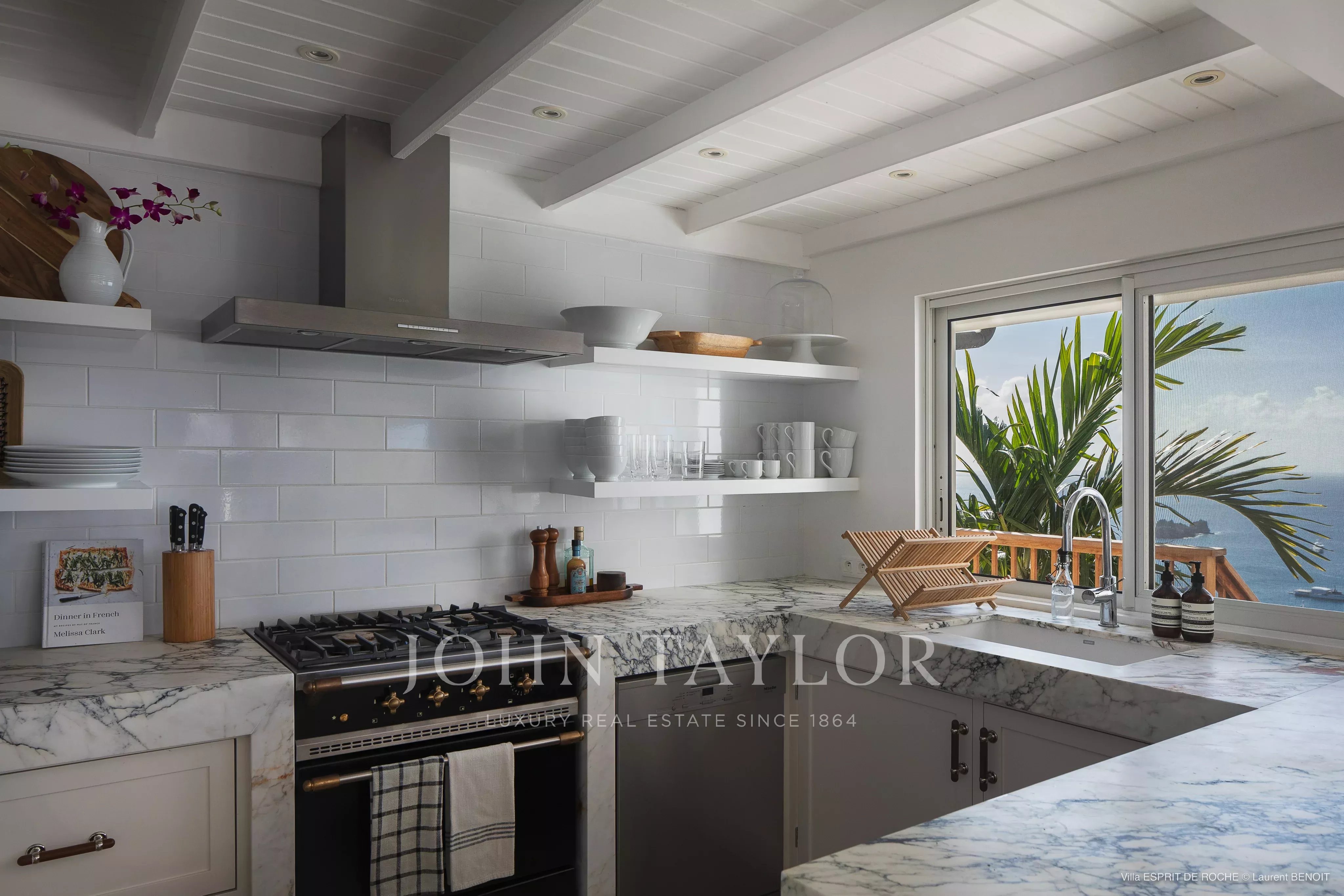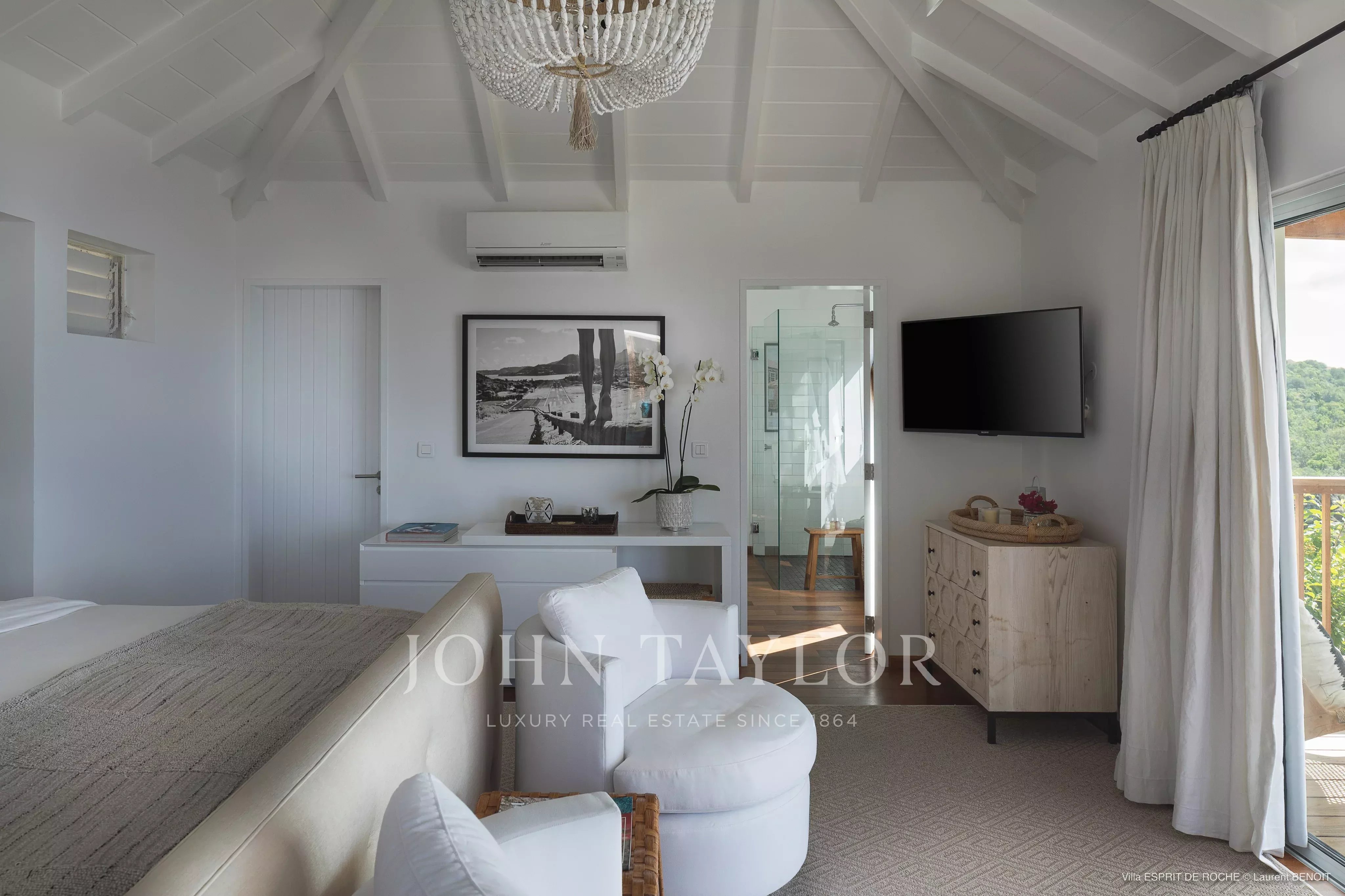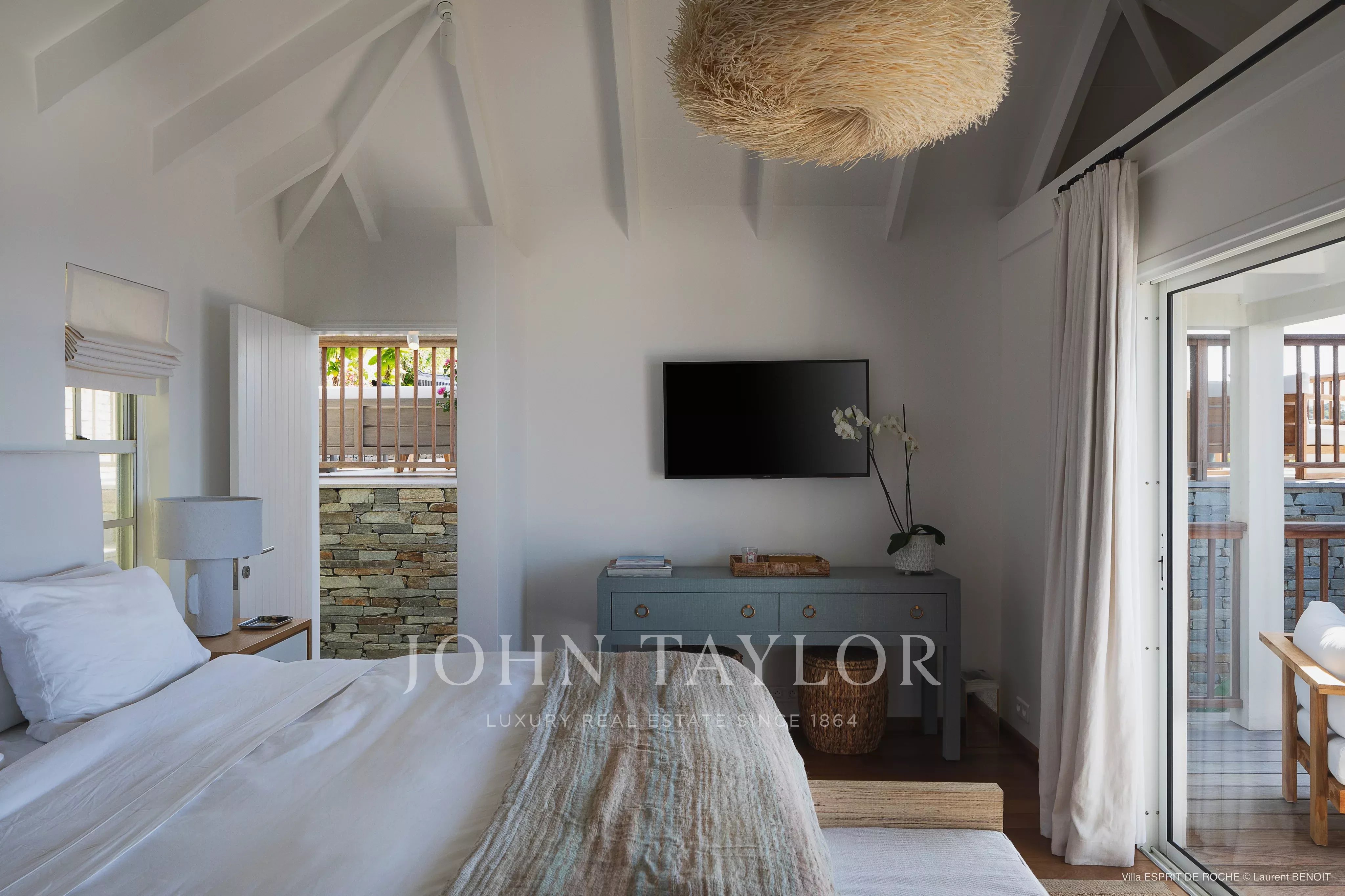 The villa offers three air-conditioned suites, each equipped with a king-size bed and an en-suite bathroom. The first is located on the main level, the second in a detached bungalow slightly below, and the third near the pool. All have private terraces with ocean views, carefully arranged in a subdued and elegant spirit.