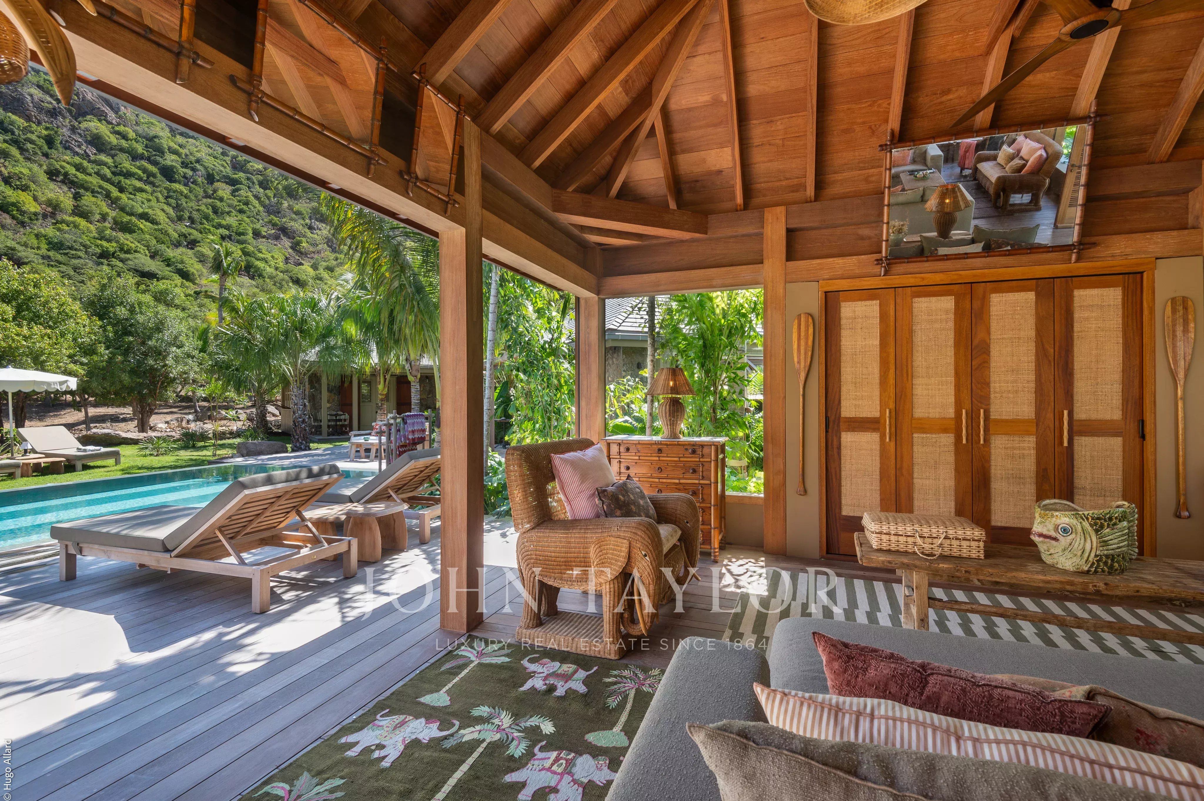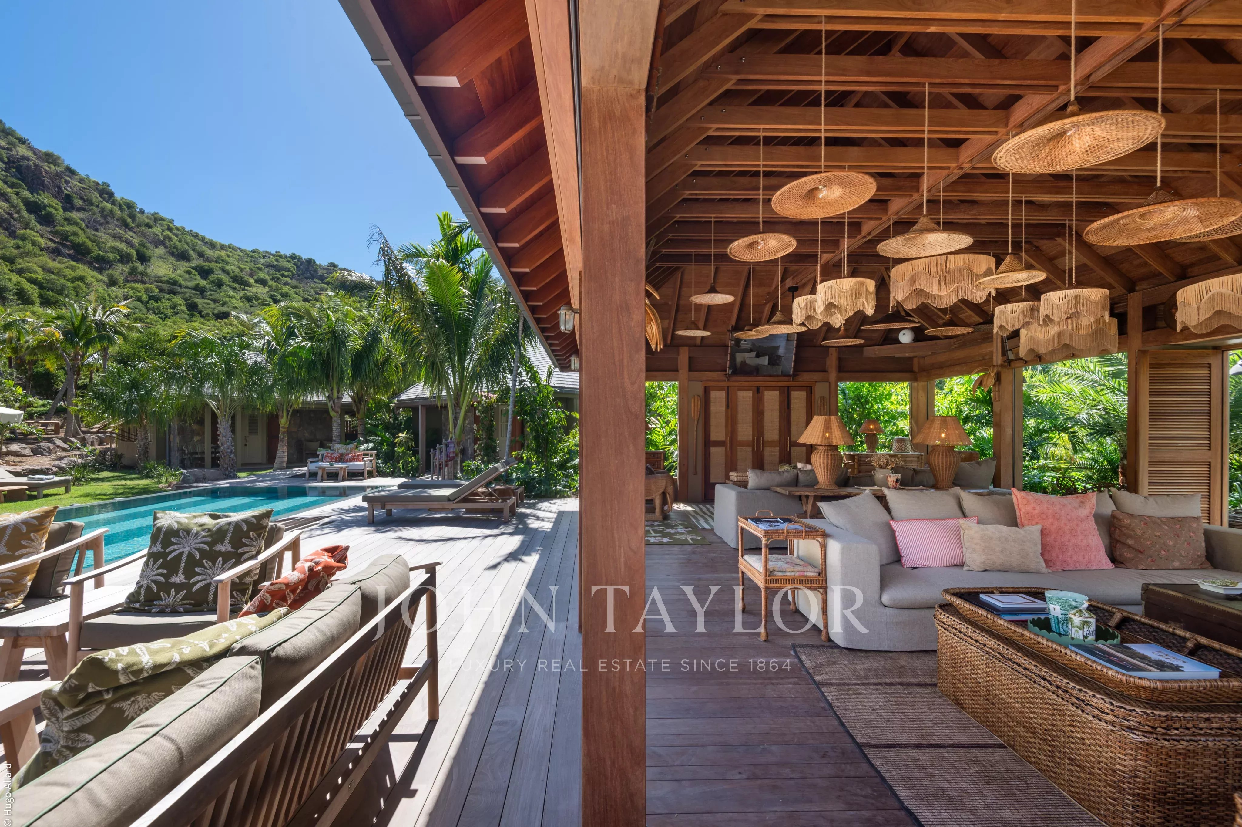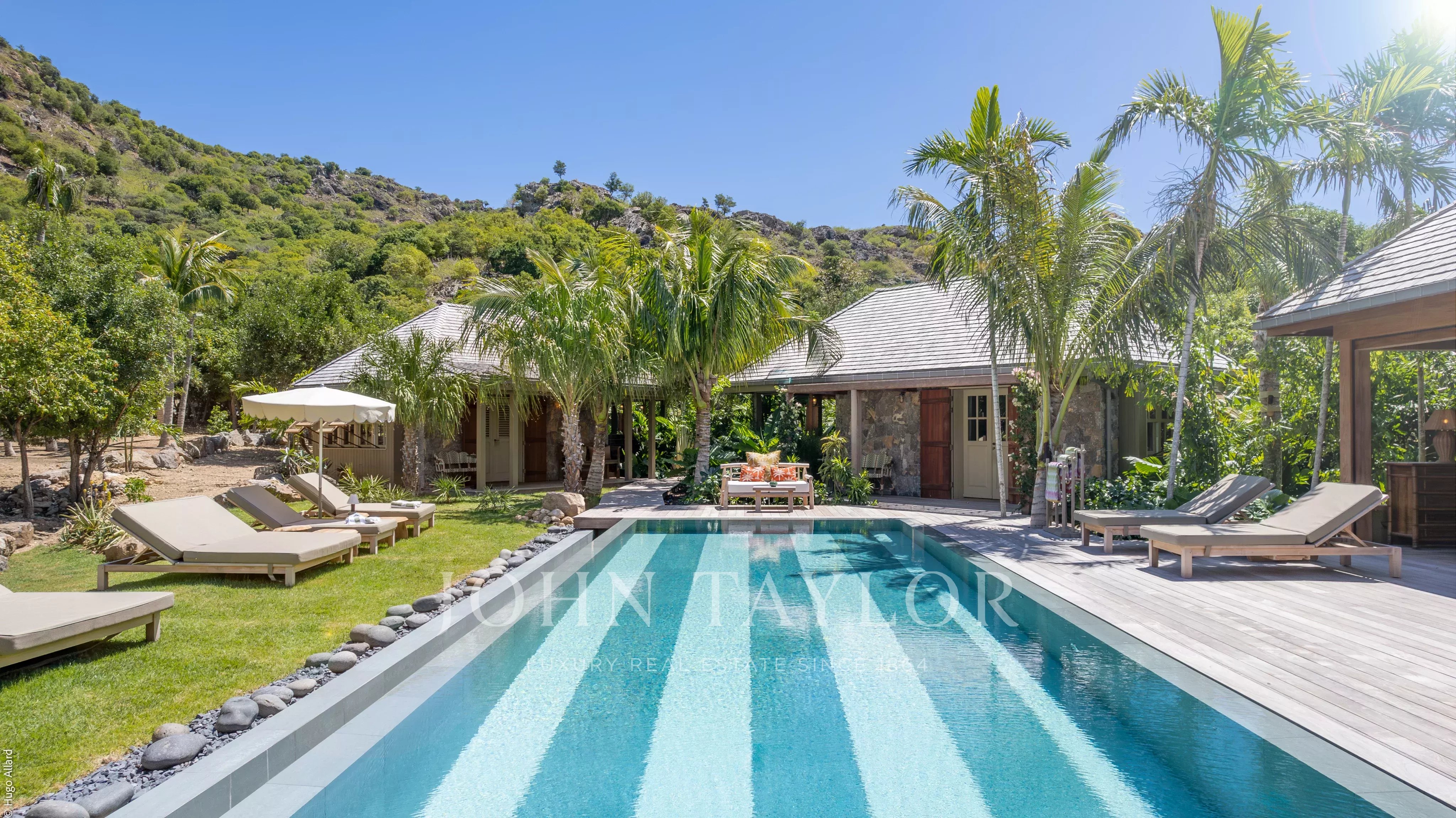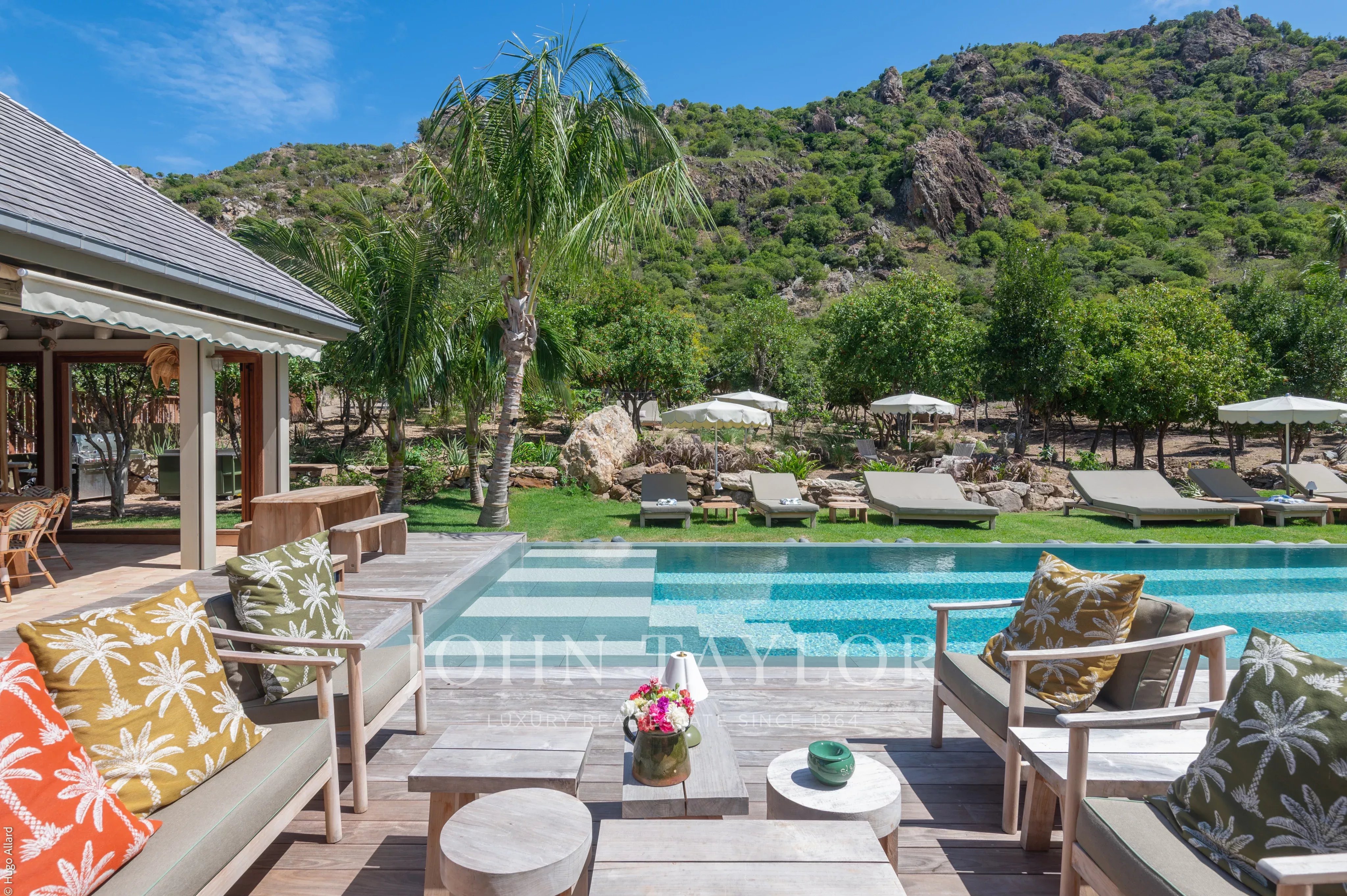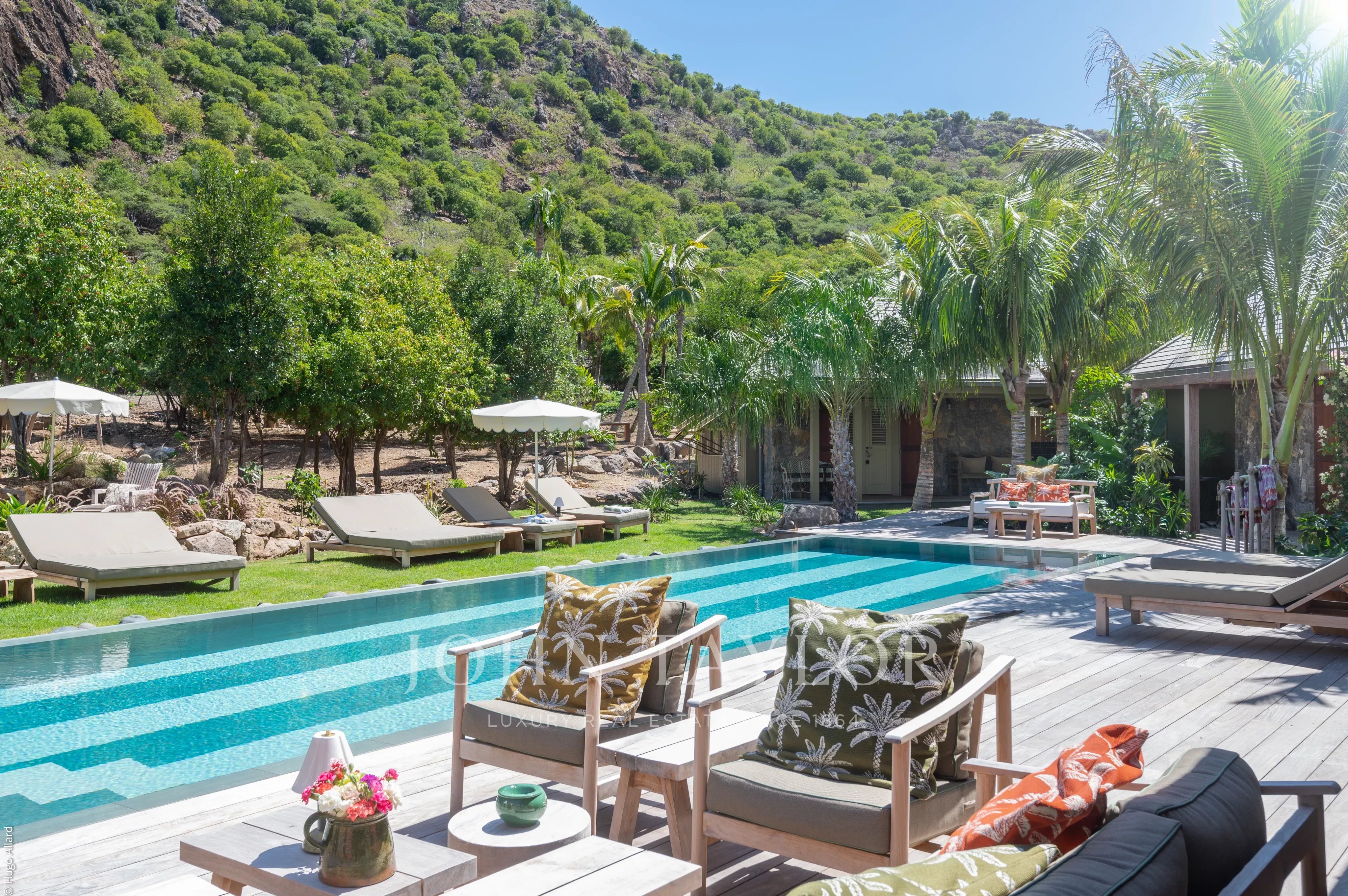 At the heart of the property, the heated swimming pool terrace serves as a true focal point, surrounded by lush tropical vegetation and framed by the green hills of Saline, offering an immersive and tranquil environment.