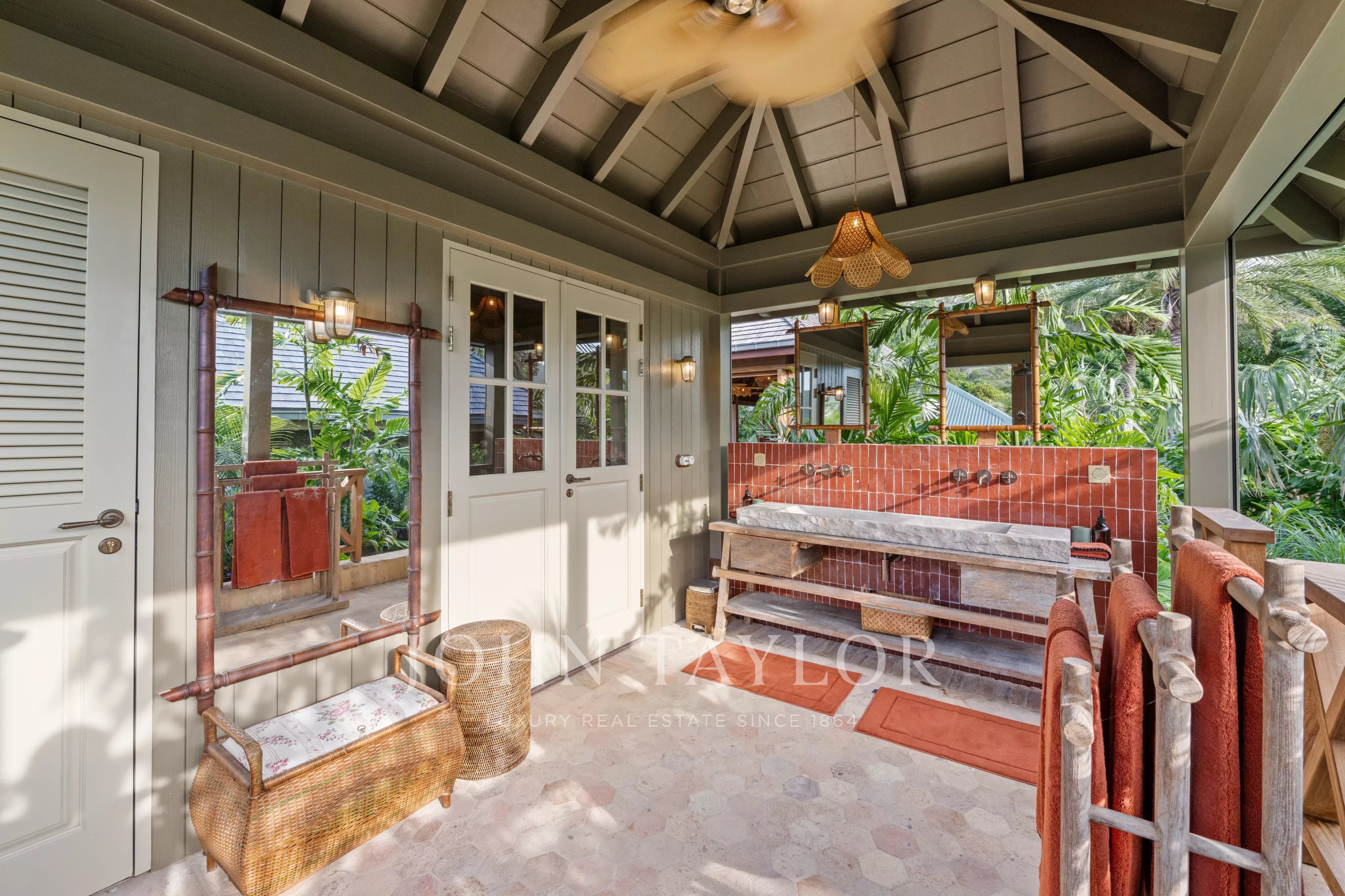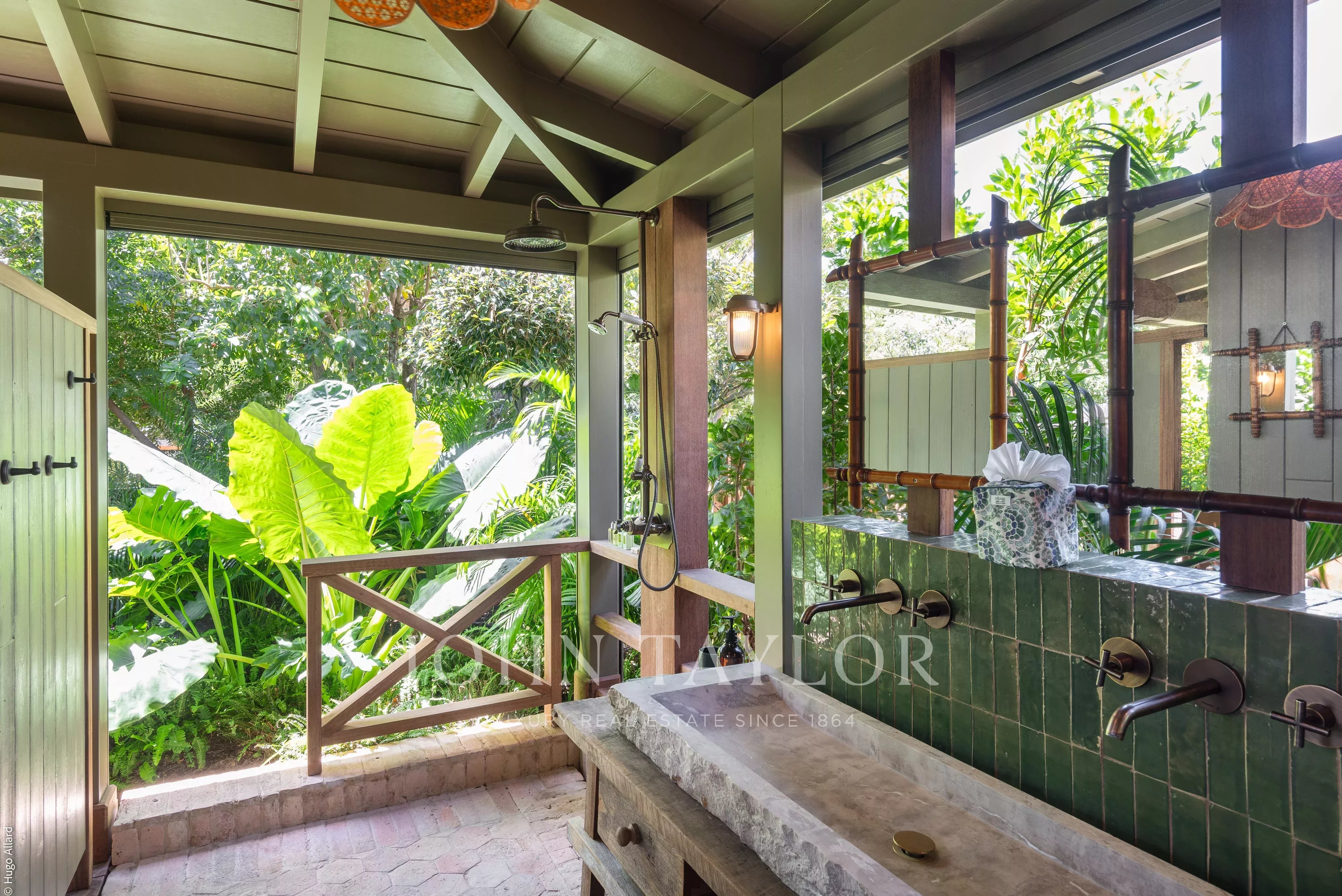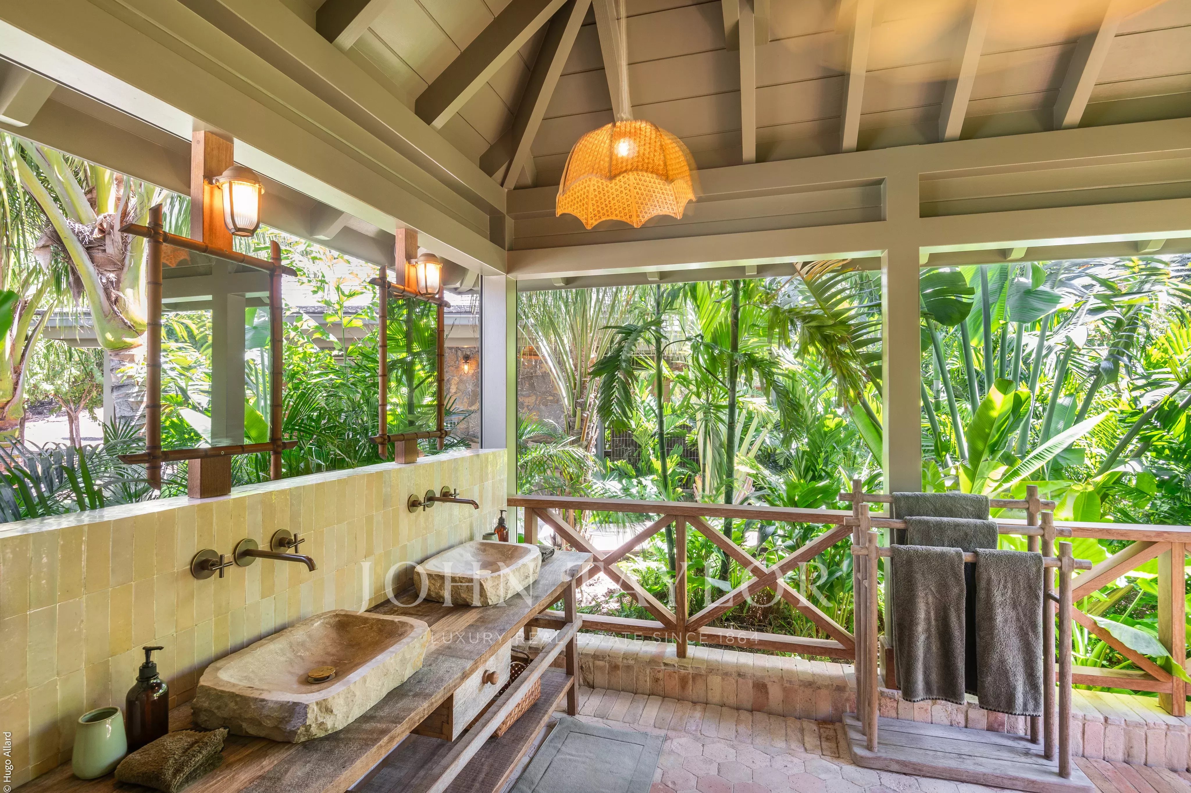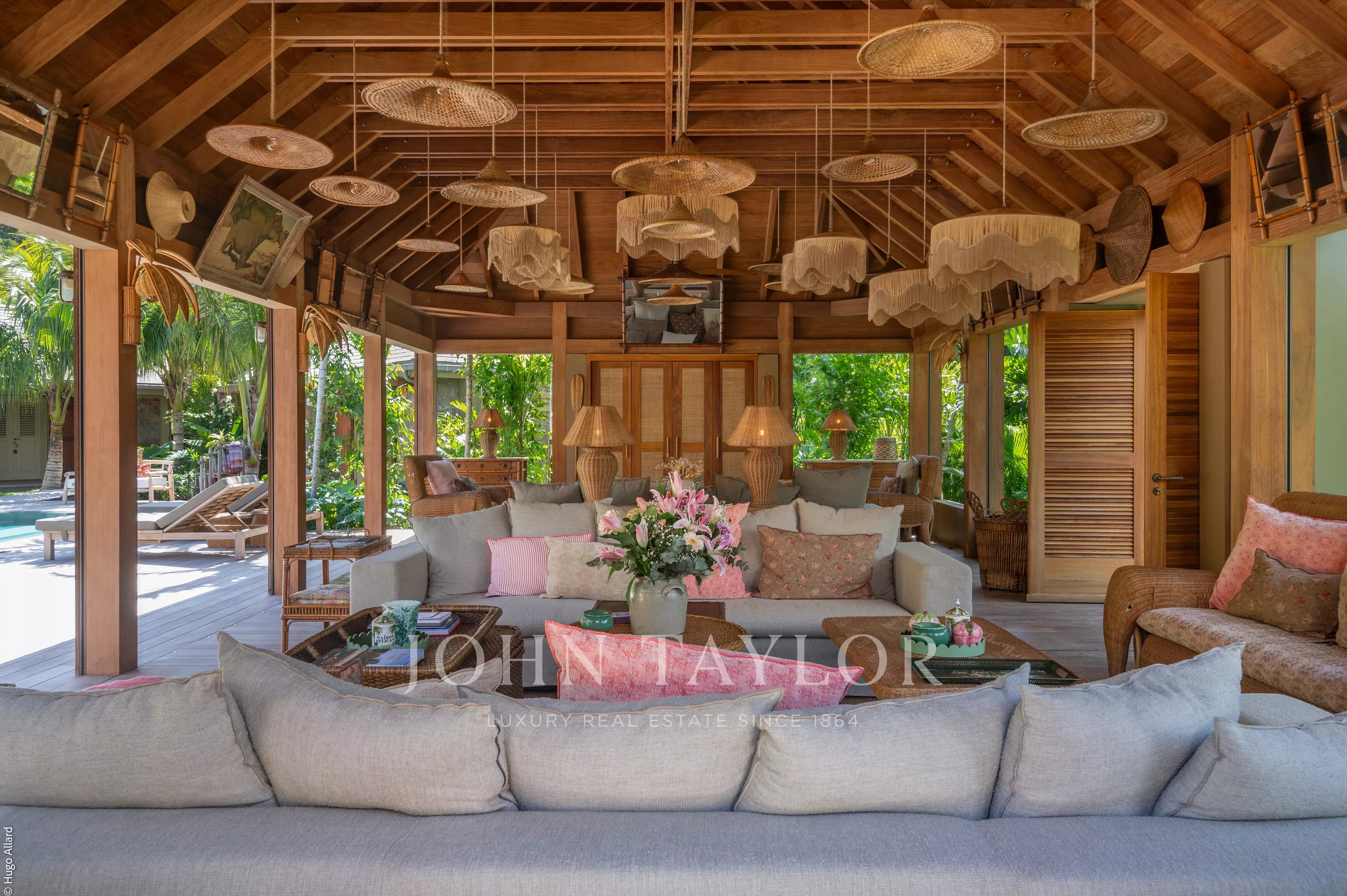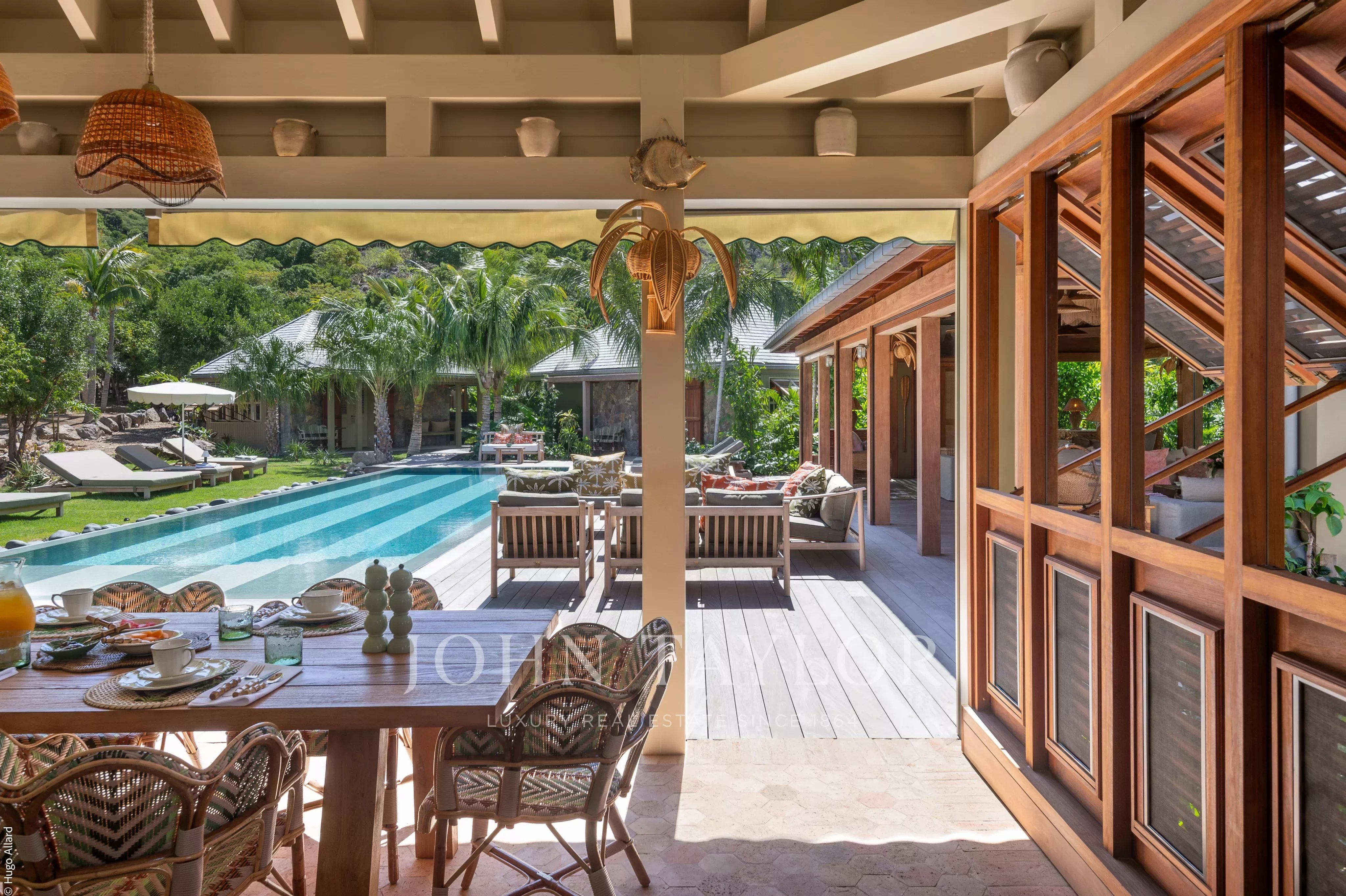 At the heart of the property, the heated swimming pool terrace serves as a true focal point, surrounded by lush tropical vegetation and framed by the green hills of Saline, offering an immersive and tranquil environment.