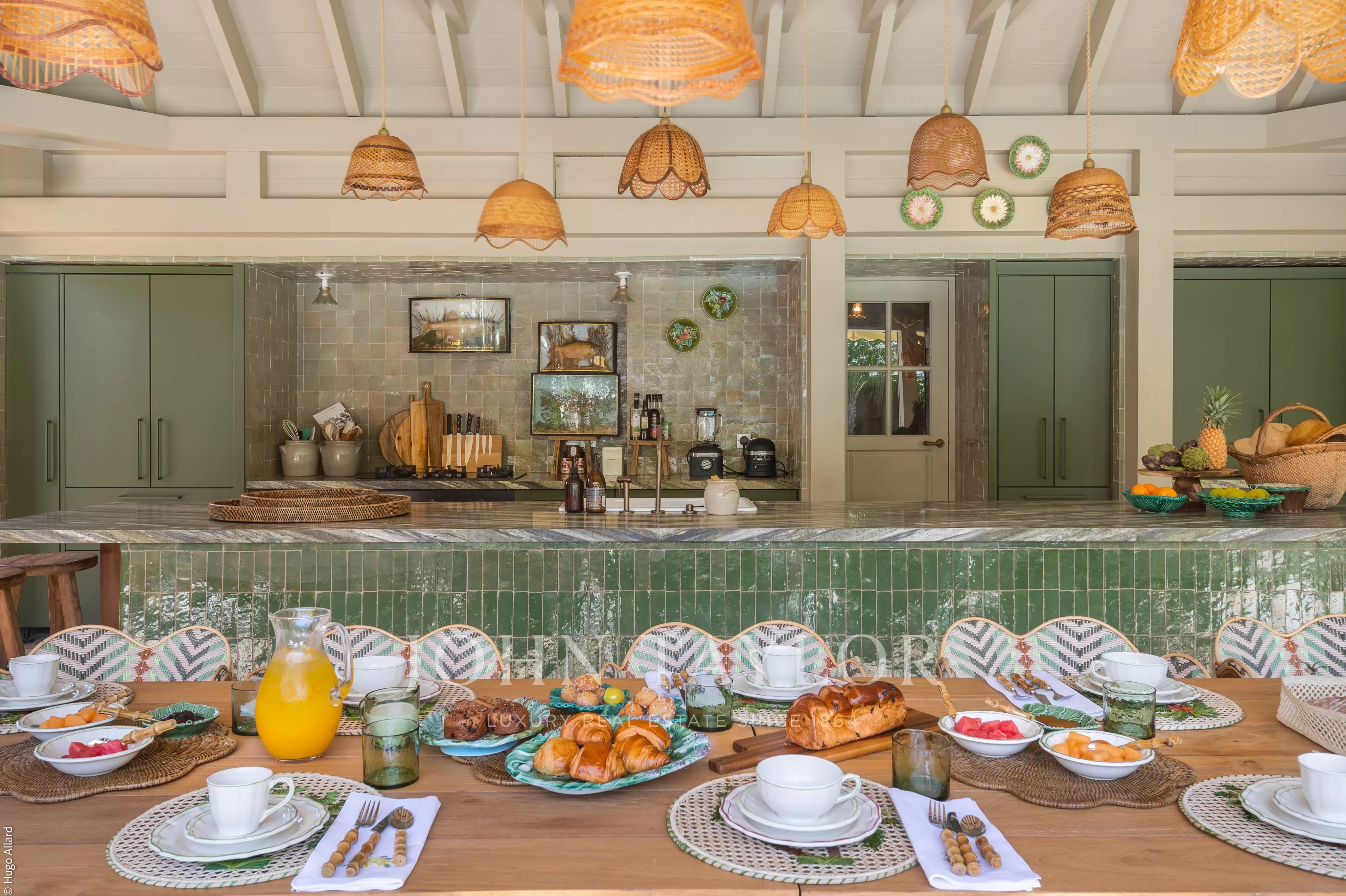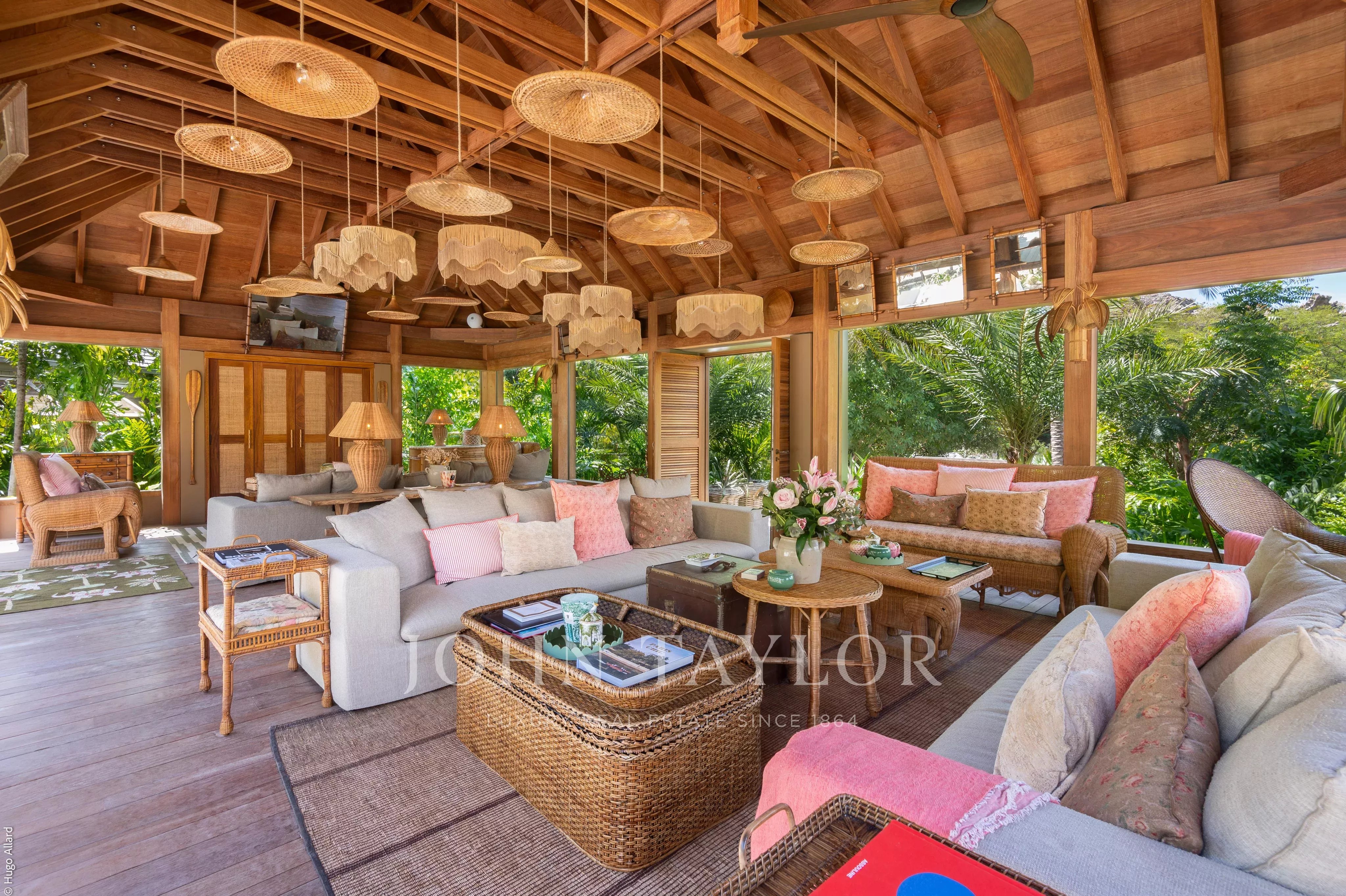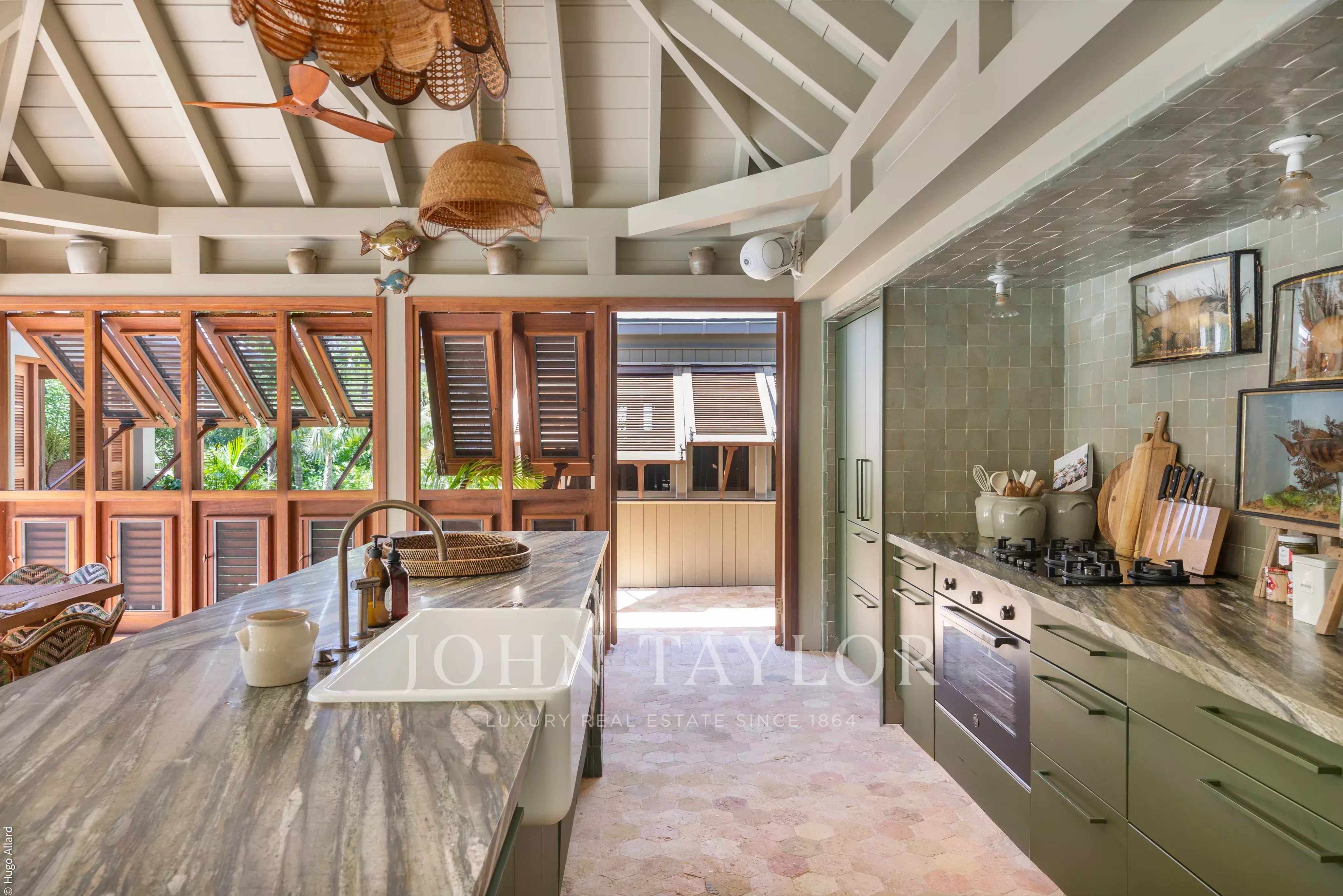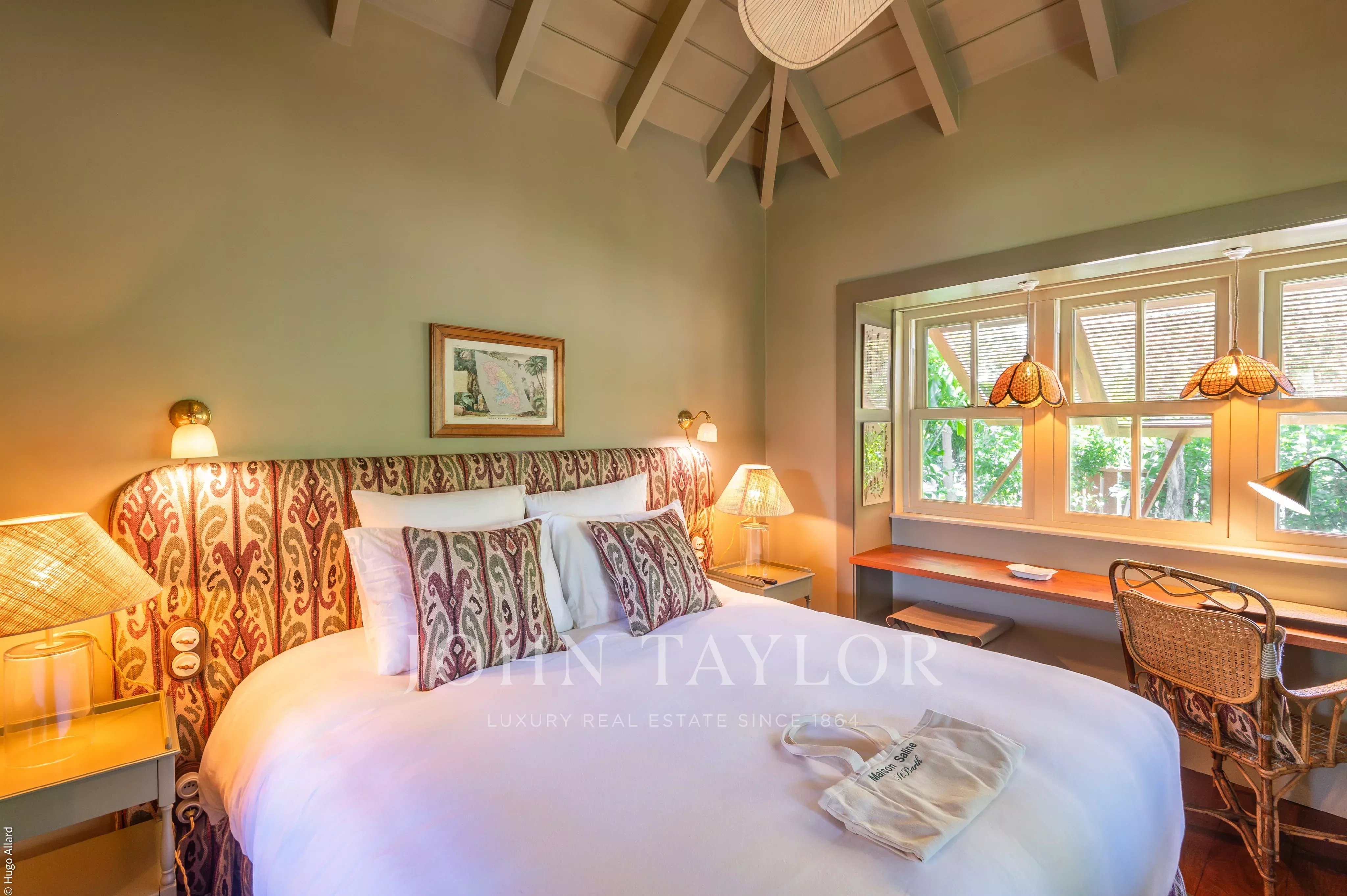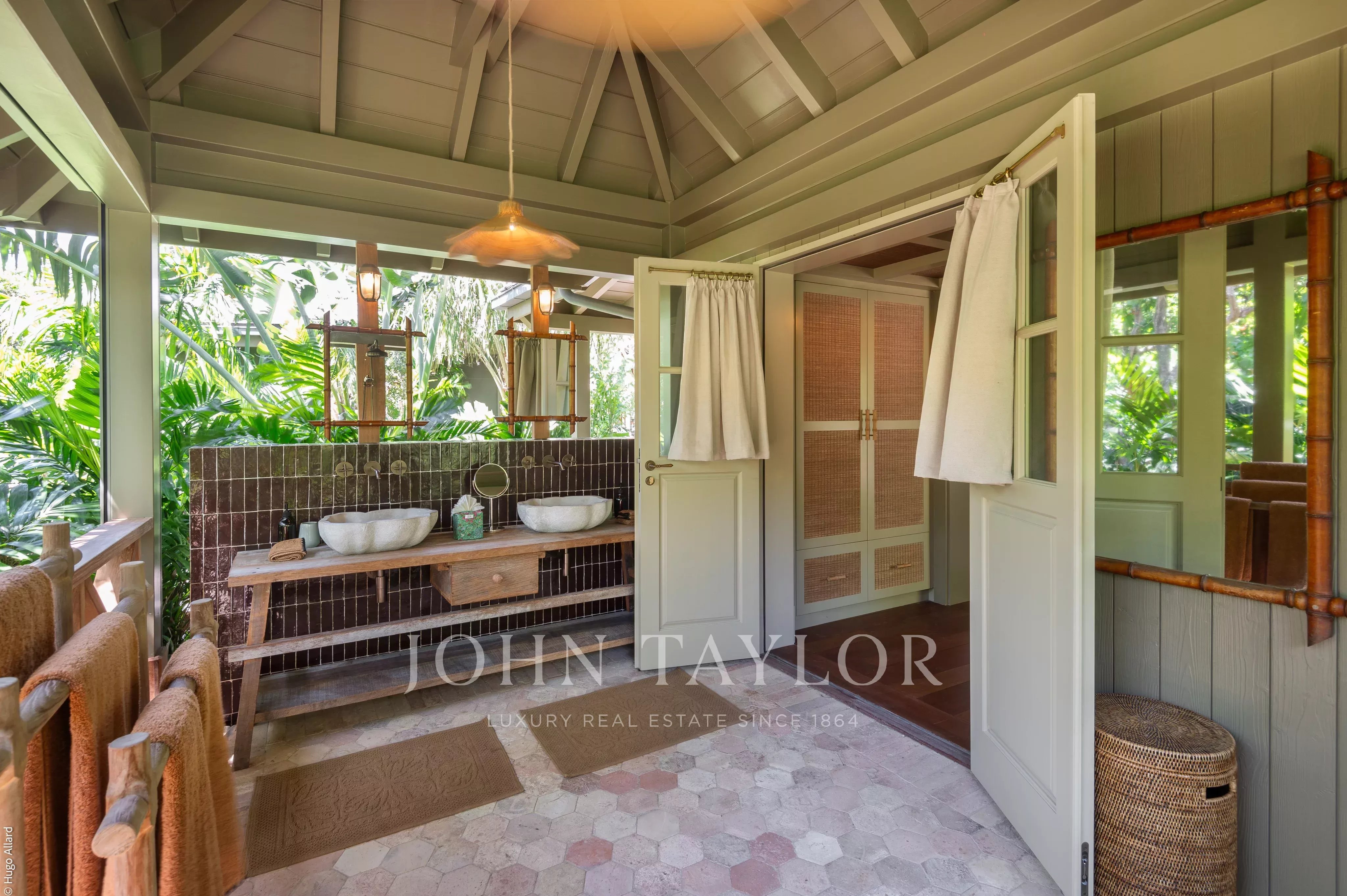 At the heart of the property, the heated swimming pool terrace serves as a true focal point, surrounded by lush tropical vegetation and framed by the green hills of Saline, offering an immersive and tranquil environment.