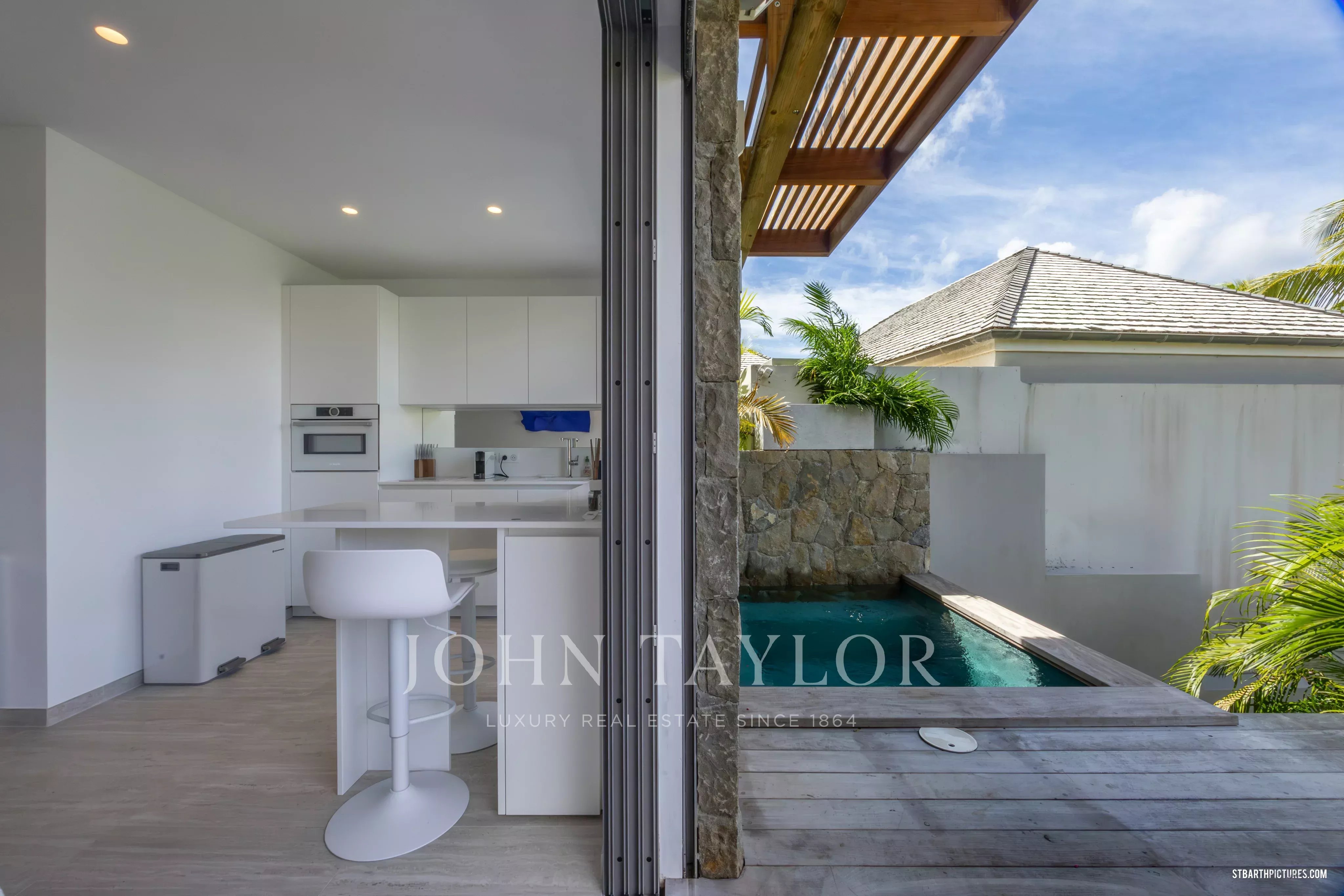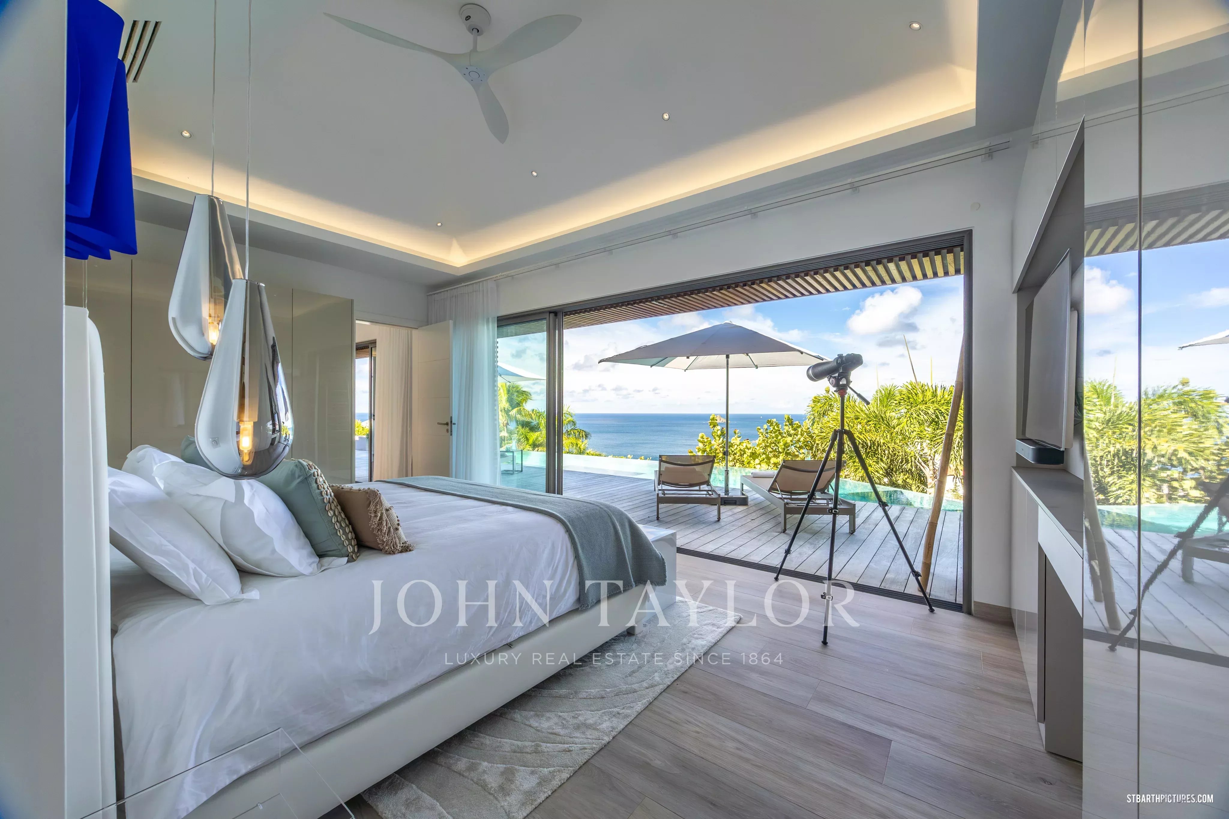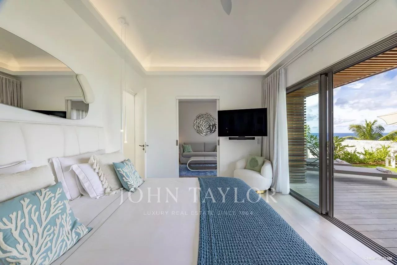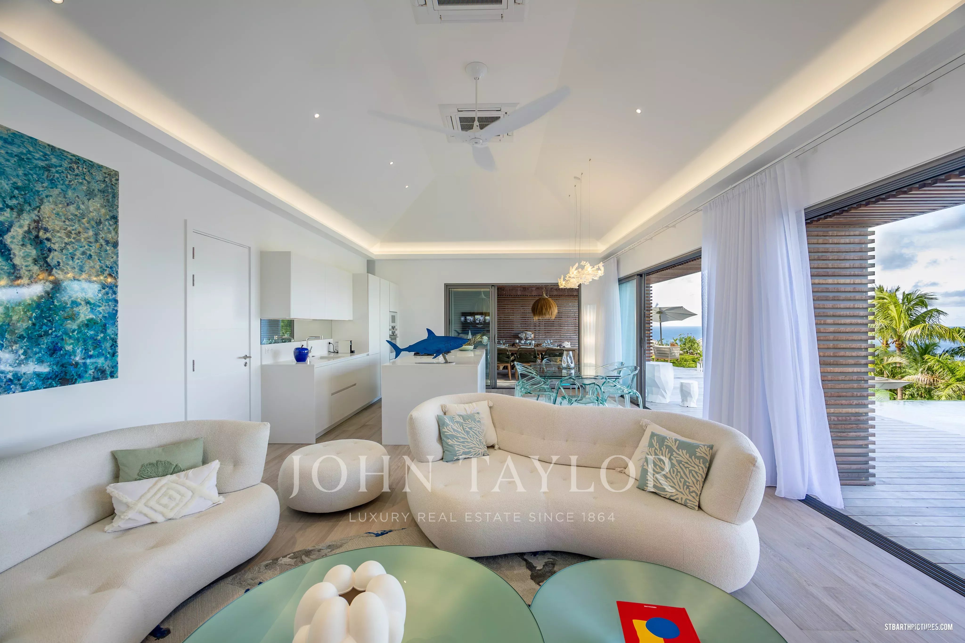 The main living areas are distinguished by their generous volumes and openness to the outdoors. The living room, fully-equipped modern kitchen and dining room are arranged around a vast terrace and elegant swimming pool, the villa's centerpiece. The whole invites refined indoor-outdoor living, typical of upscale Caribbean living.
