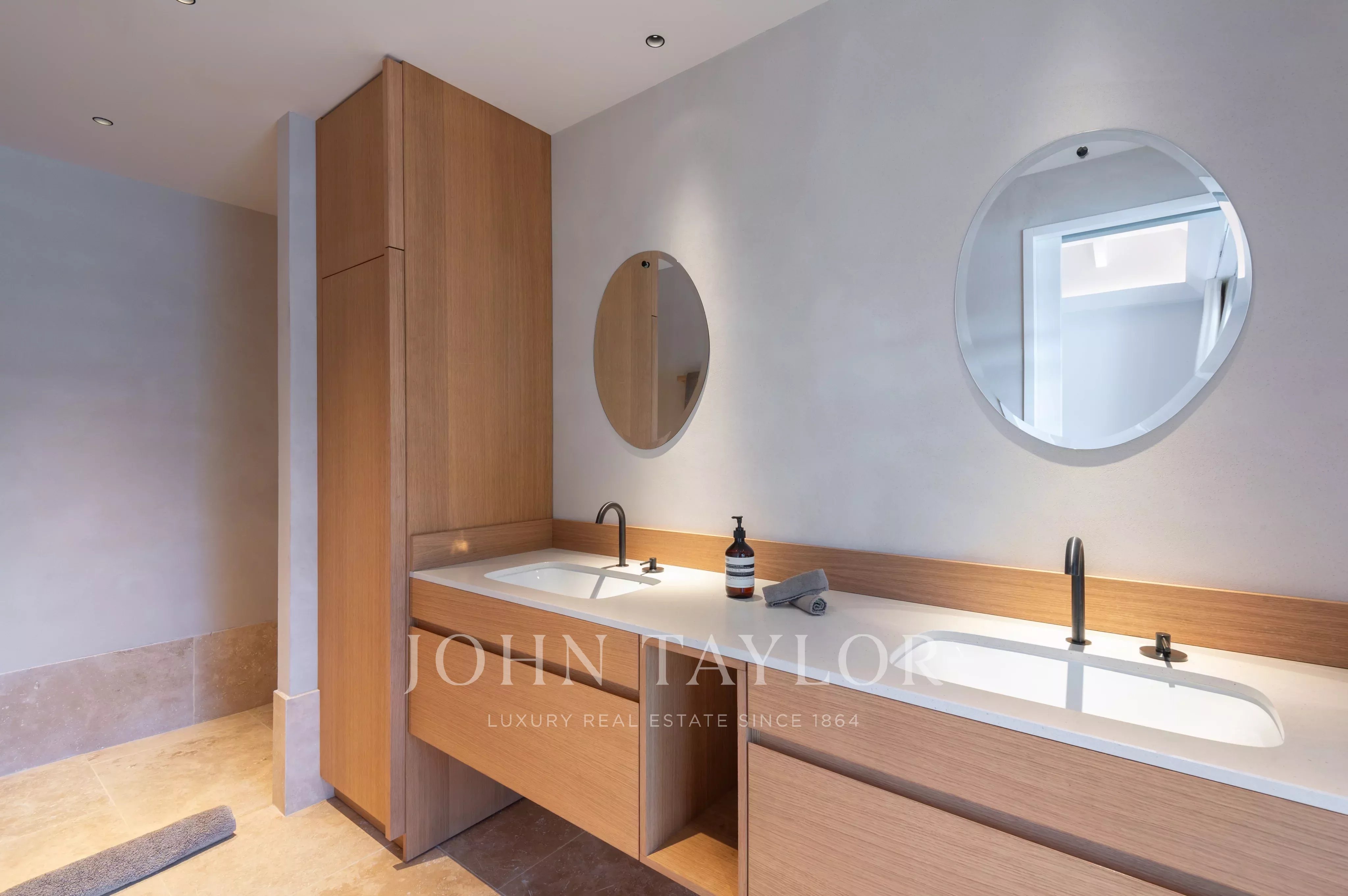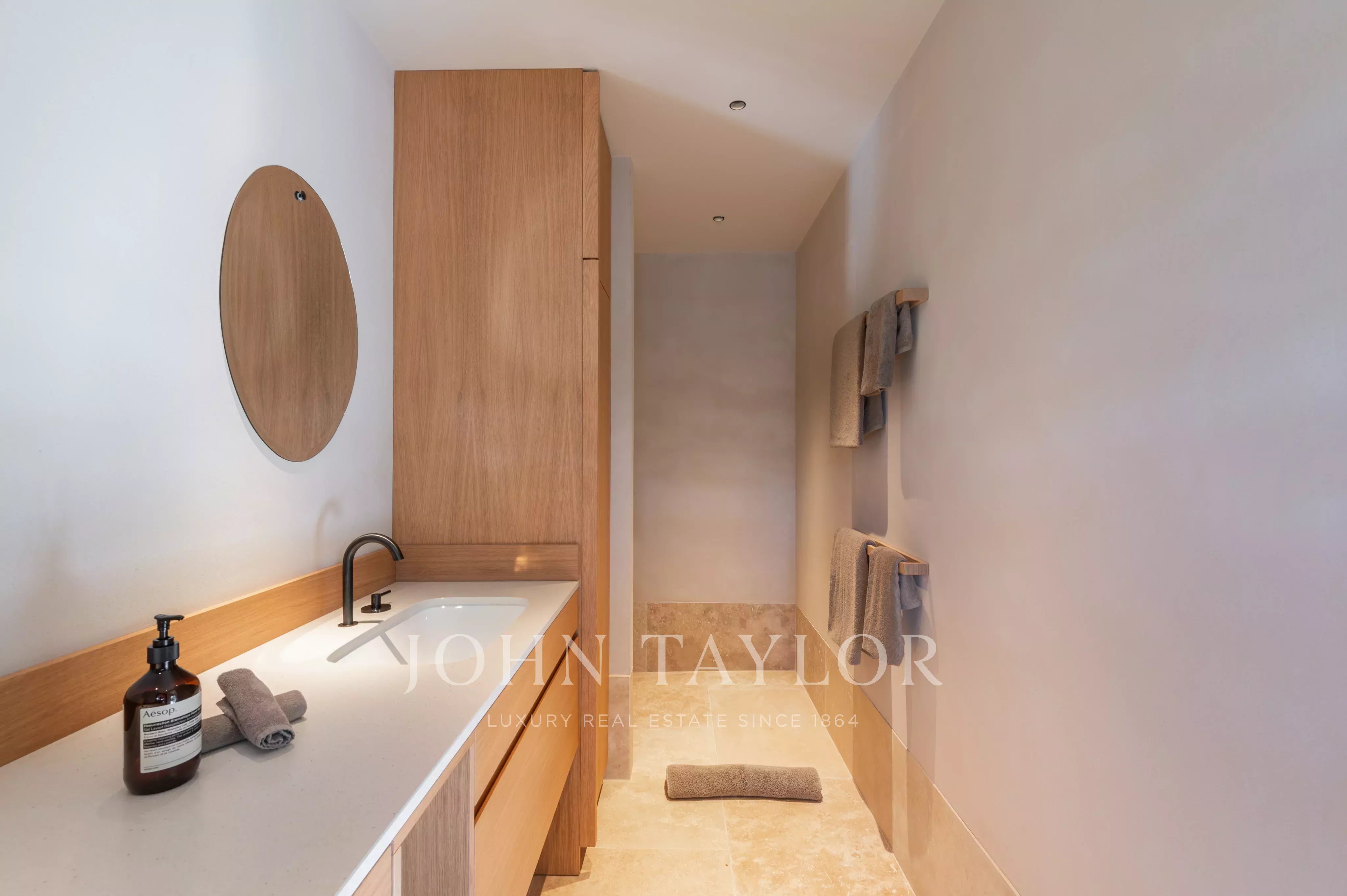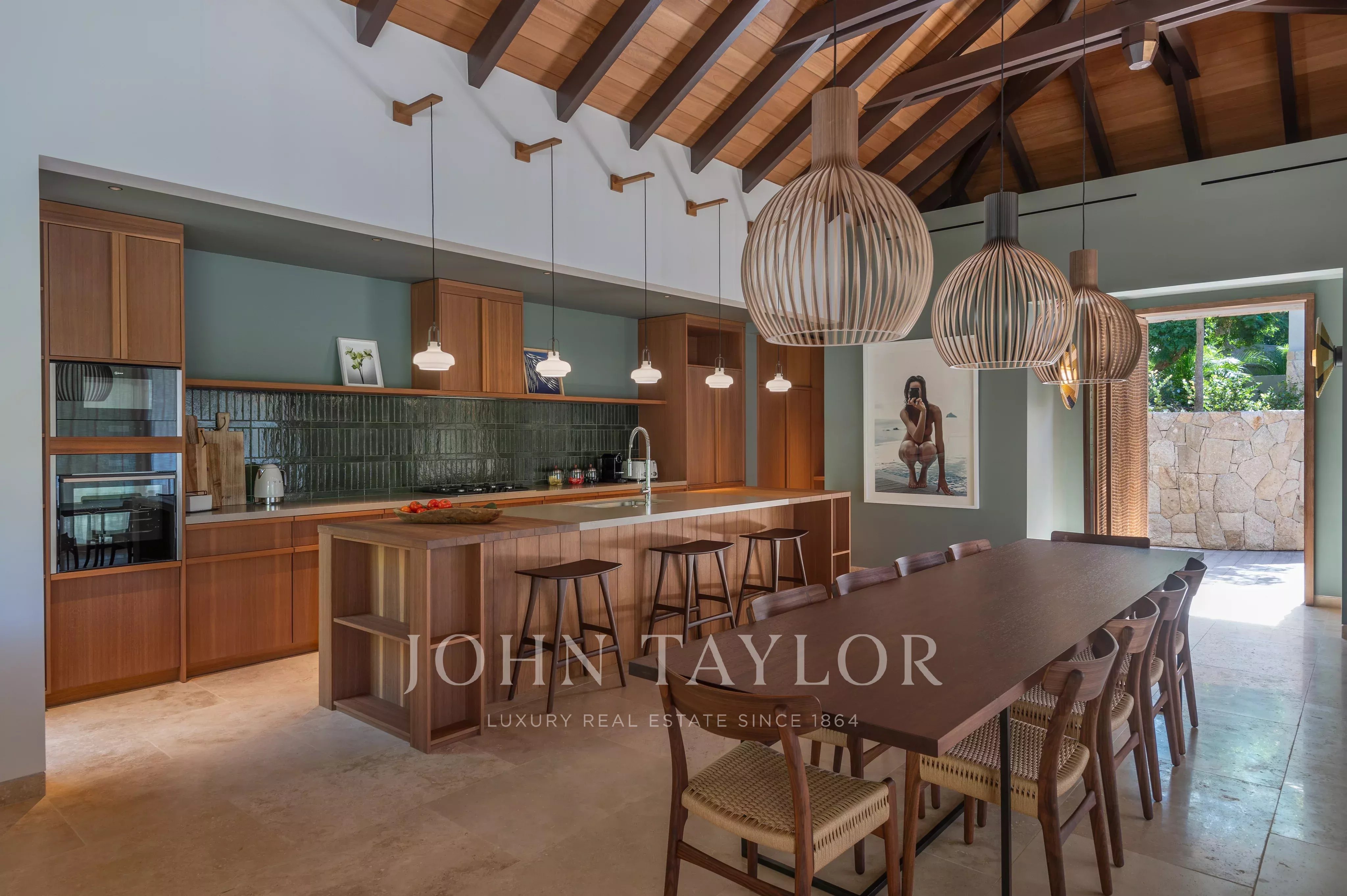 From the terrace, the view is simply breathtaking, the turquoise sea stretching to the horizon. A private path leads to the villa’s exclusive beach access, where calm waters invite you to unwind. The heated infinity pool appears to merge with the ocean, while shaded sun loungers, a pergola with plush seating, and an alfresco dining area offer the perfect setting for leisurely afternoons and starlit dinners by the sea.