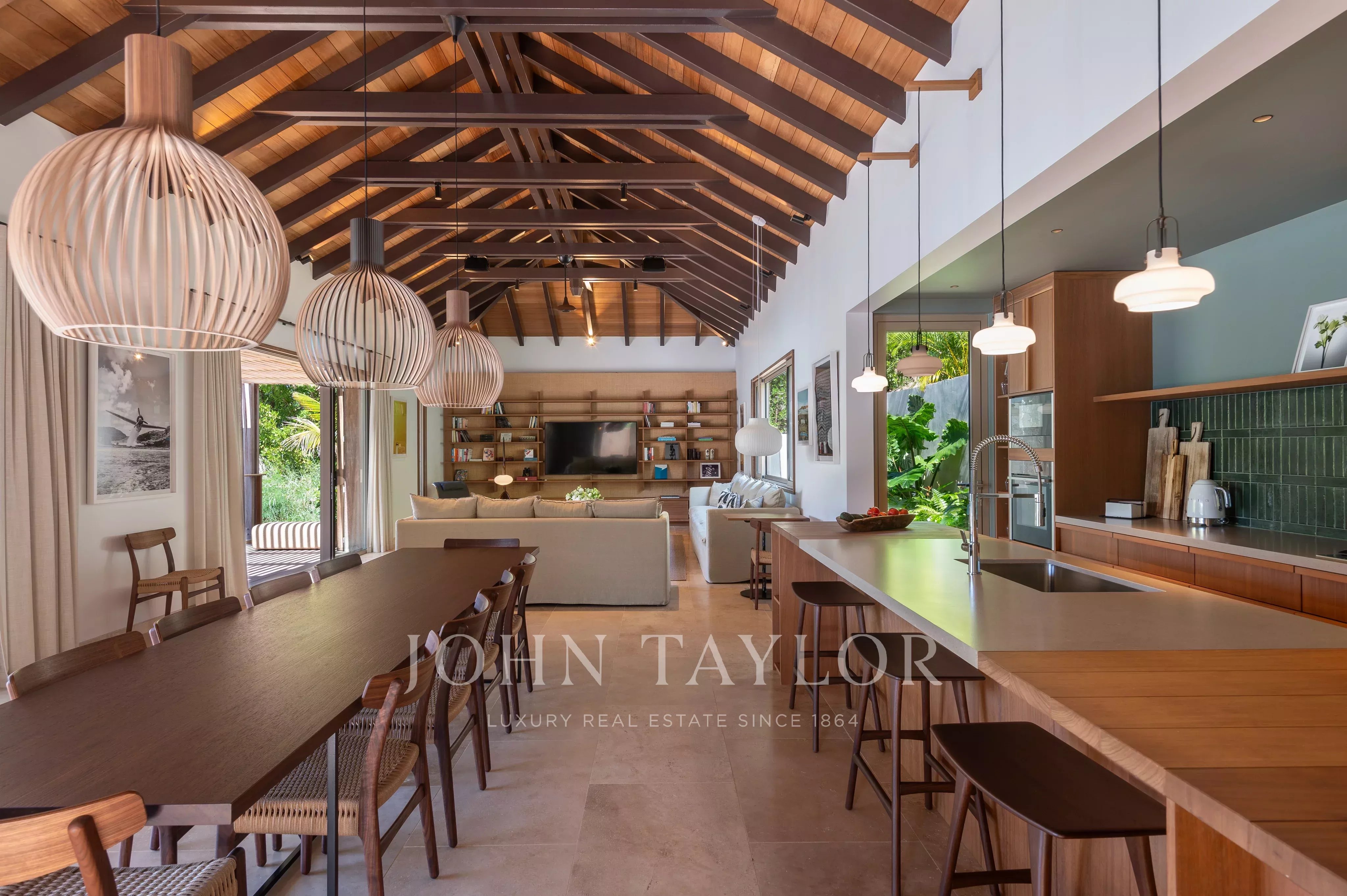 Blending modern architecture with island-inspired design, Villa LINDA exudes understated refinement. The spacious living area, framed by exposed wooden beams and soft natural tones, opens seamlessly onto the terrace and infinity pool. The fully equipped kitchen and indoor dining area create a harmonious flow, ideal for relaxed gatherings in a luminous, open setting.