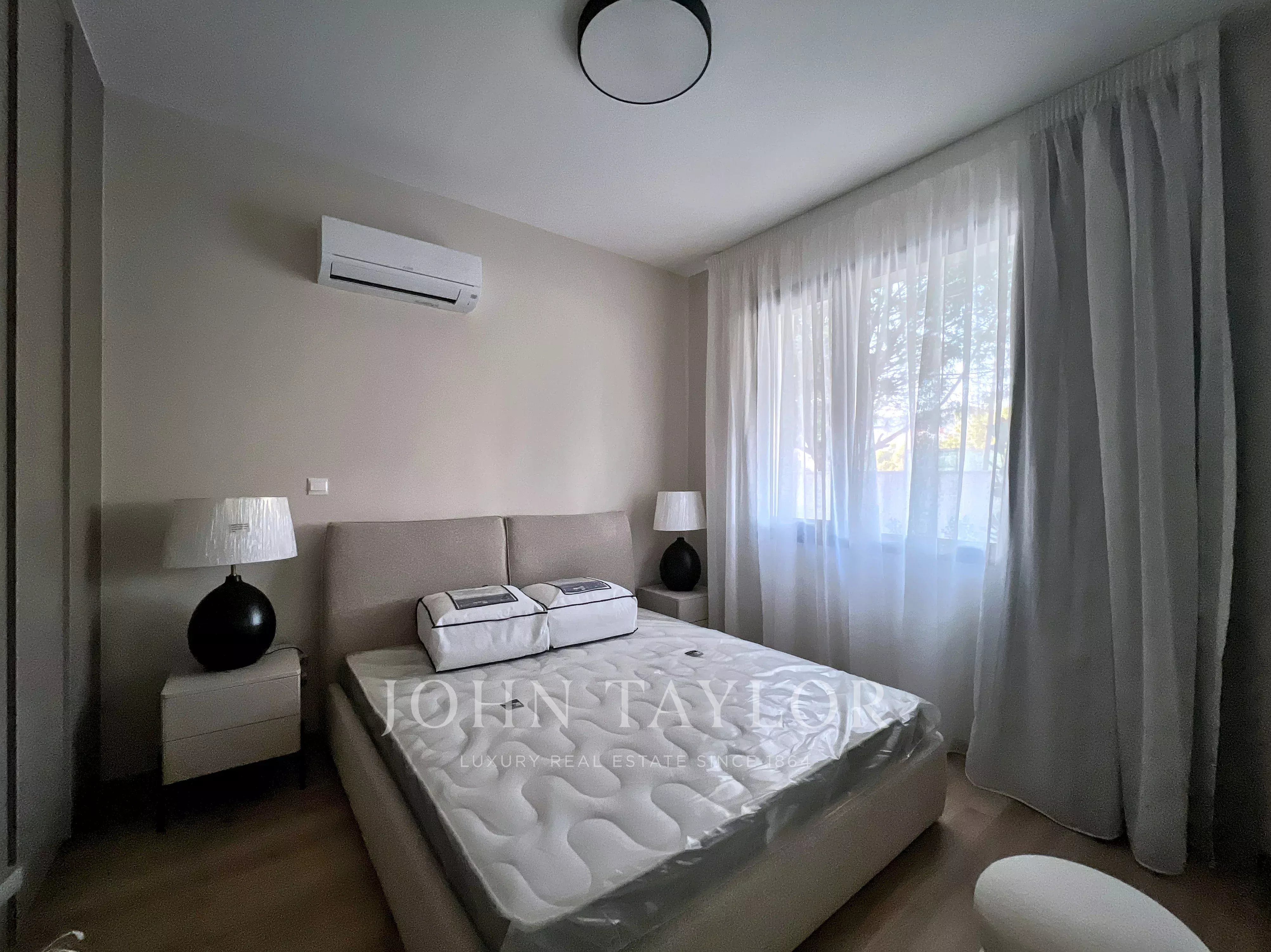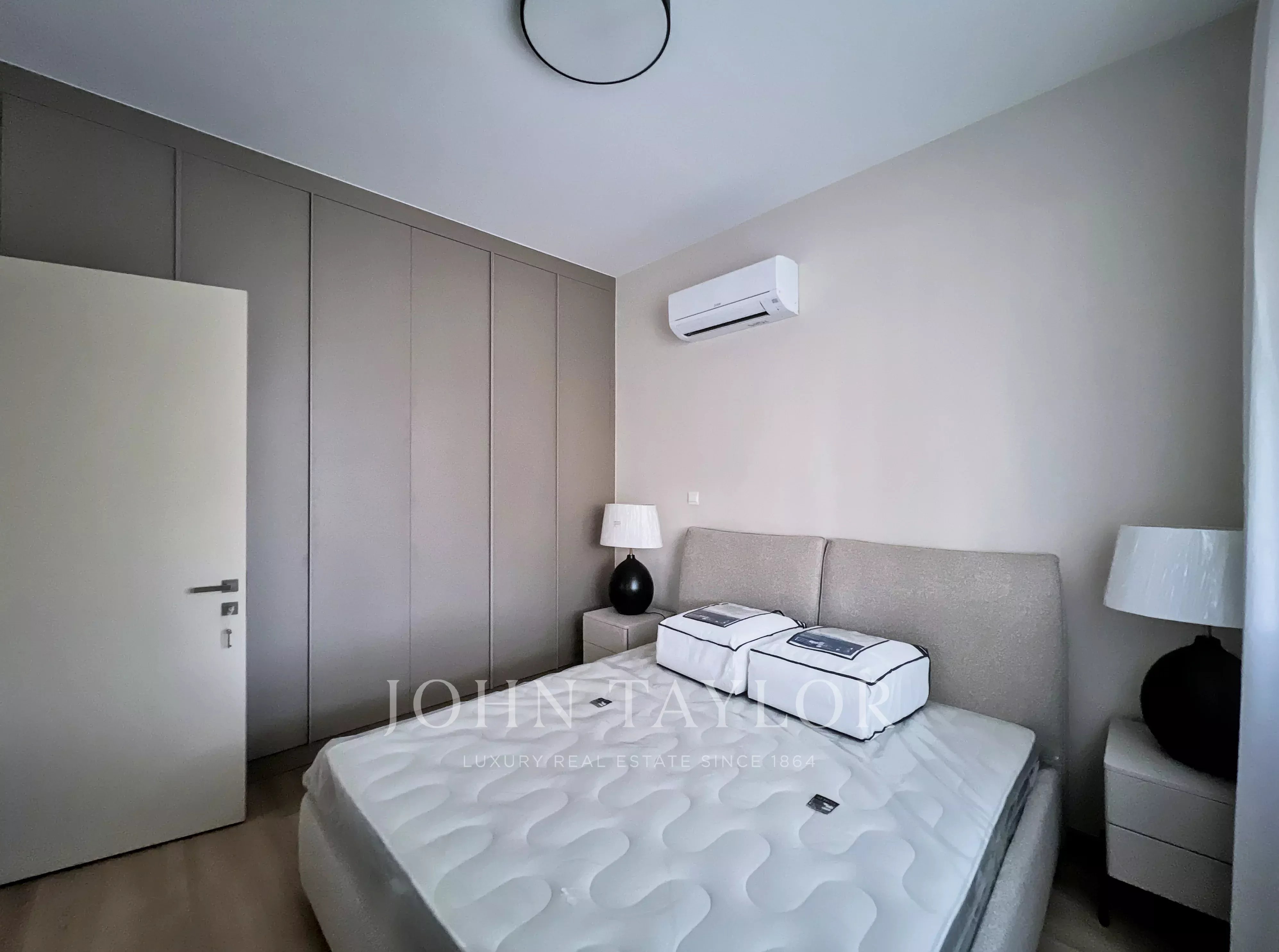 Part of a modern residential complex with a communal swimming pool, sauna, and landscaped grounds.