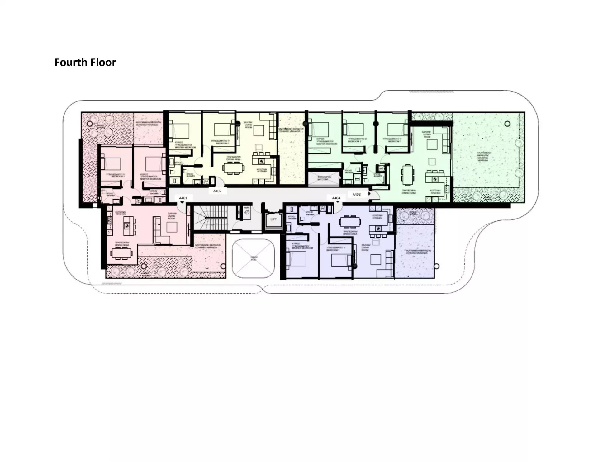 2-Bedroom Apartments (10 units): 80 m² internal, 114–140.5 m² total covered area. Prices start at €726,000 + VAT, with 1 parking space each.