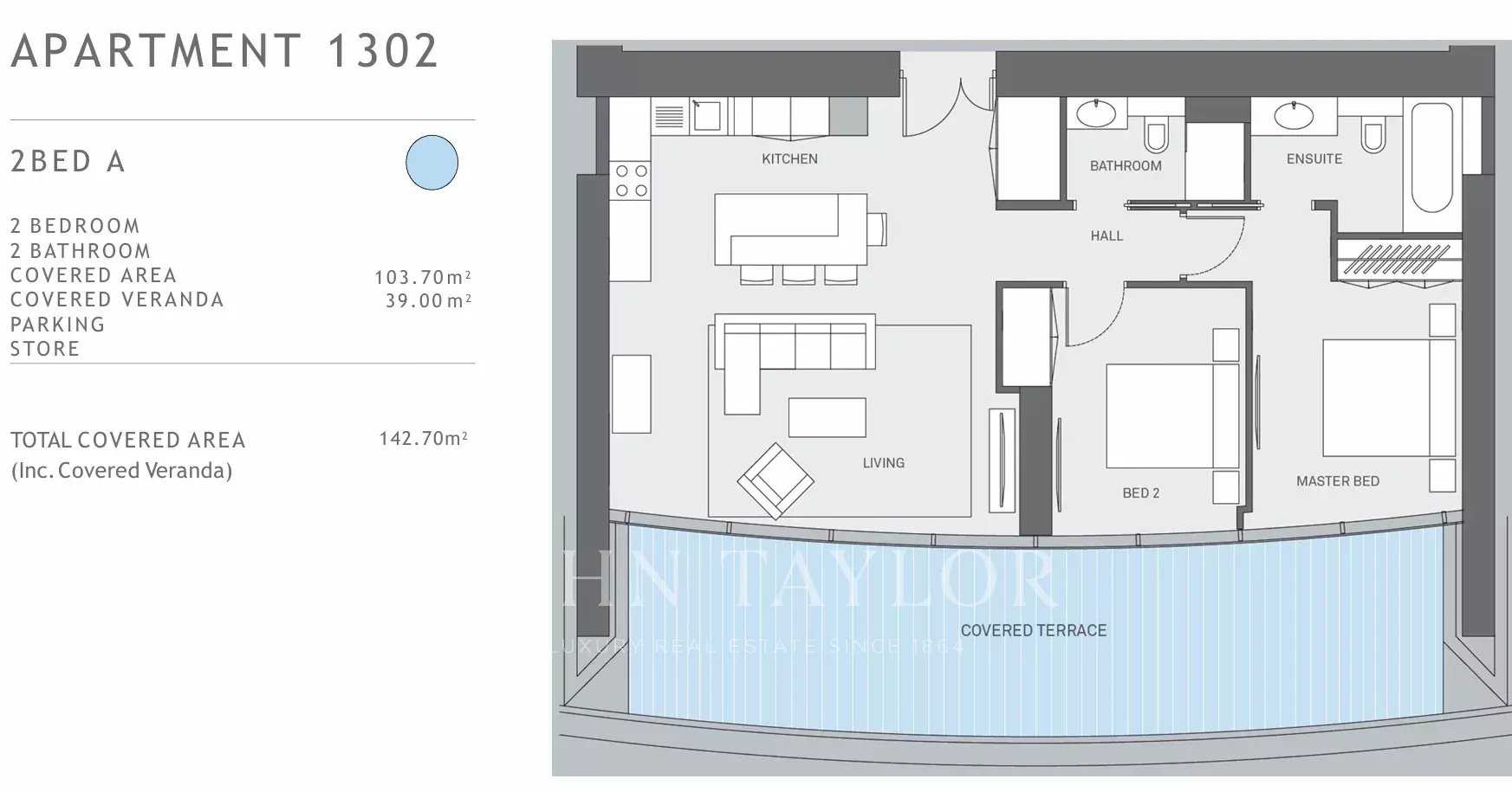 The apartment features two spacious bedrooms and two bathrooms, with a covered internal area of 103.7 m² and a covered veranda of 39 m², bringing the total covered area to 142.7 m². Floor-to-ceiling windows flood the interiors with natural light and open to breathtaking sea and city views. Every detail has been carefully curated to deliver the ultimate in comfort and elegance, including underfloor heating, concealed VRV air-conditioning, and bespoke finishes throughout. A private parking space and storage room are included.