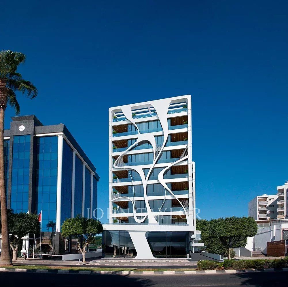 The building is designed as a mixed-use development, with office spaces on the ground floor and mezzanine level, while residential apartments occupy the 3rd, 4th, and 5th floors. The apartment enjoys southern and western orientations, providing open sea views and abundant natural light throughout the day. Residents benefit from exclusive rooftop facilities, including a communal swimming pool and a fully equipped gym, enhancing the overall living experience.