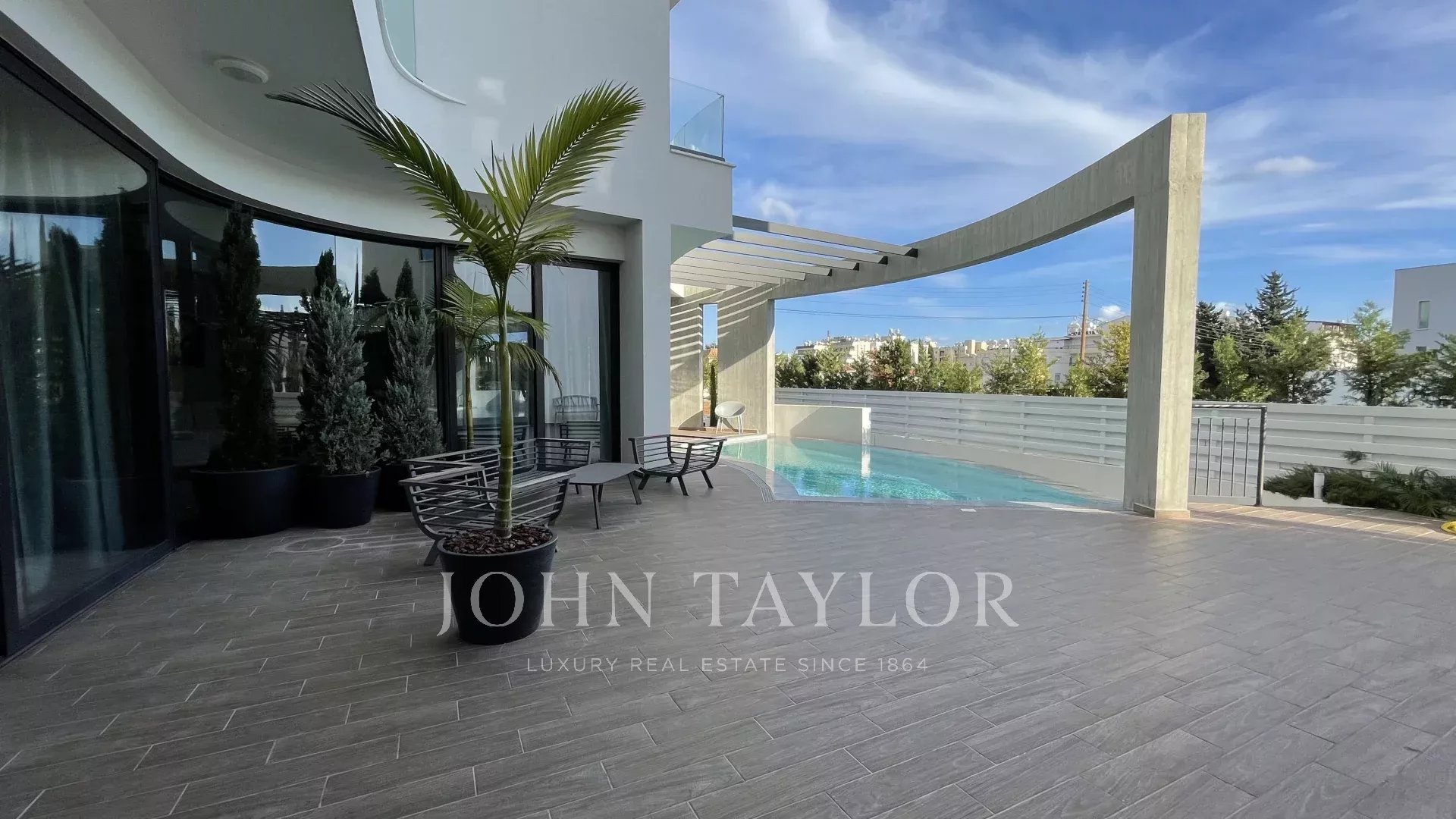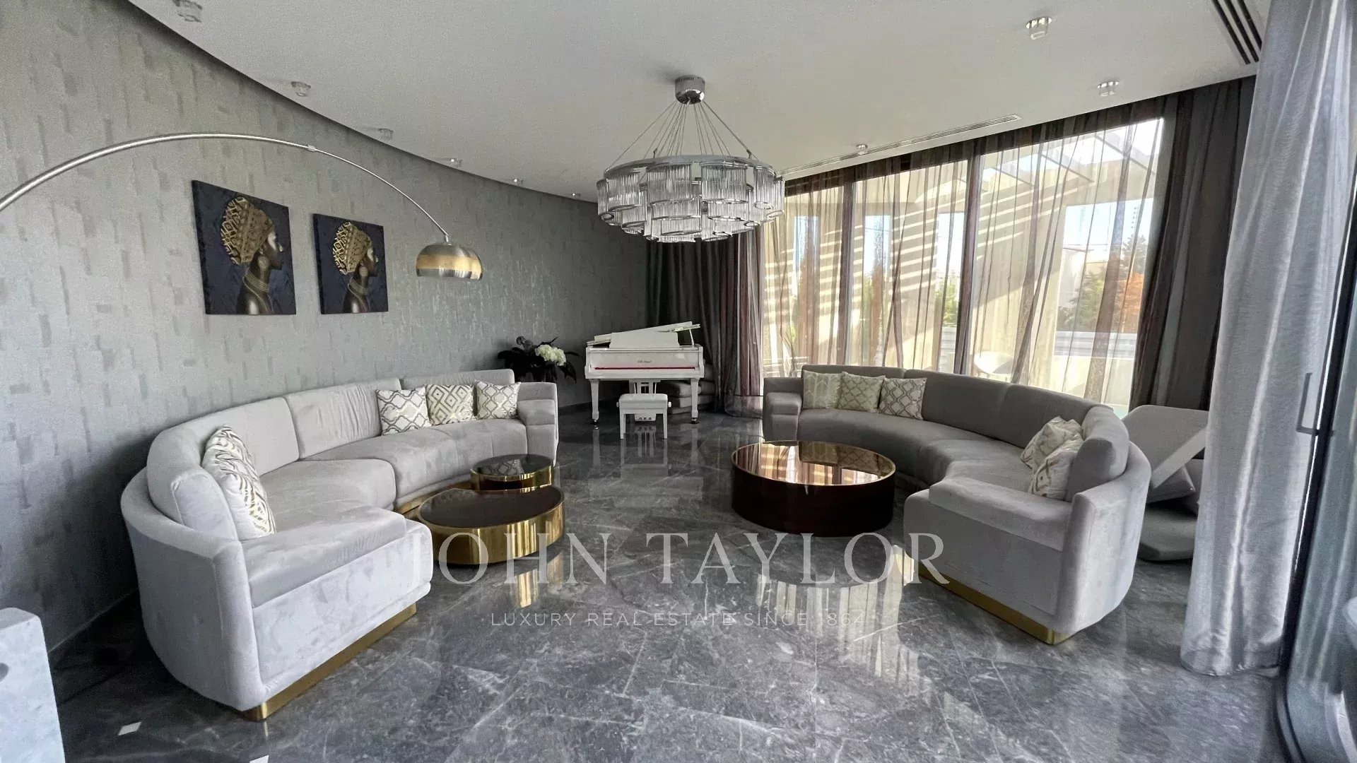 In the prestigious area of Potamos Germasogeia, an exceptional five-bedroom villa with an additional study, spread across four floors, is offered for sale. This residence combines refined contemporary design with state-of-the-art engineering, creating a home of unparalleled comfort and sophistication.