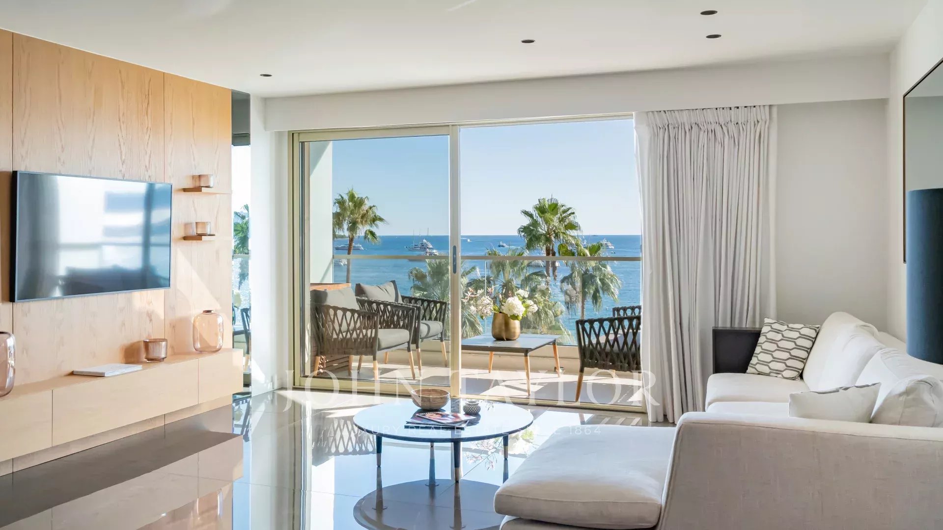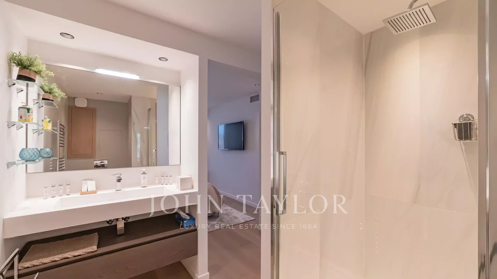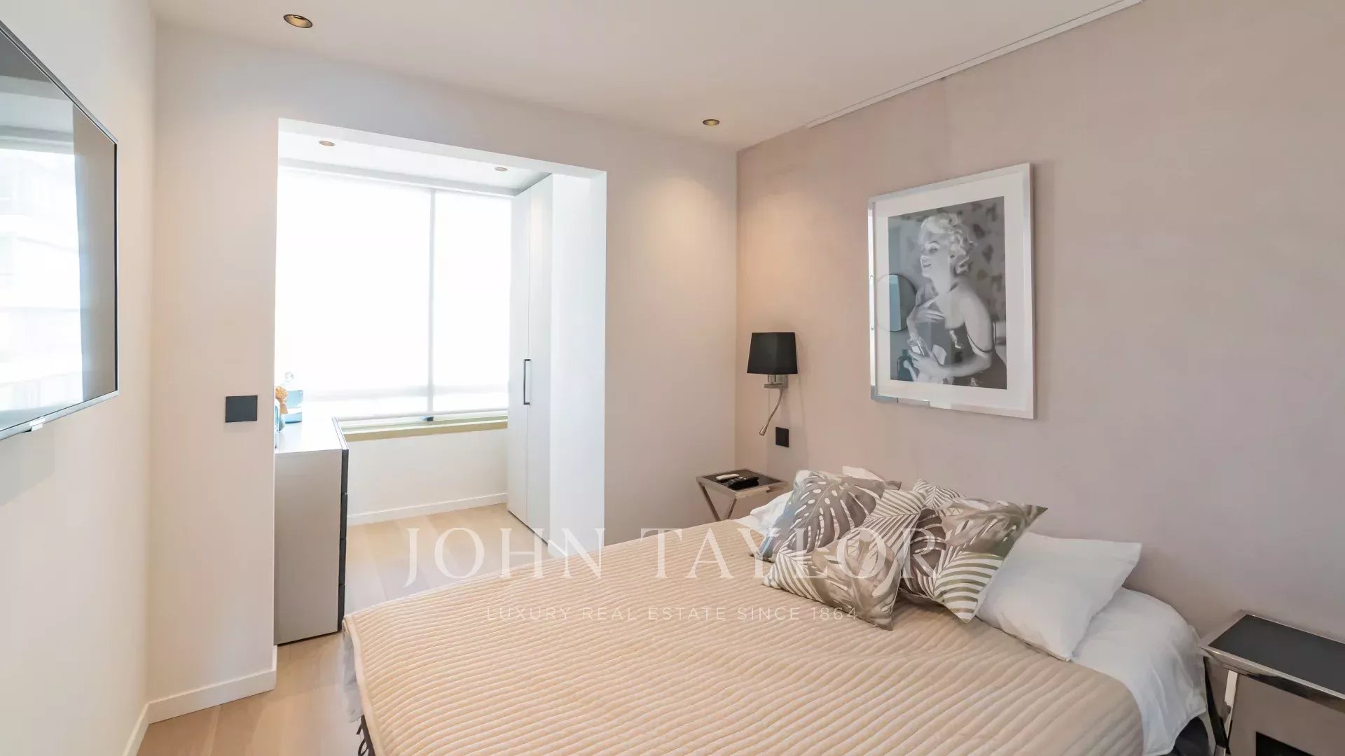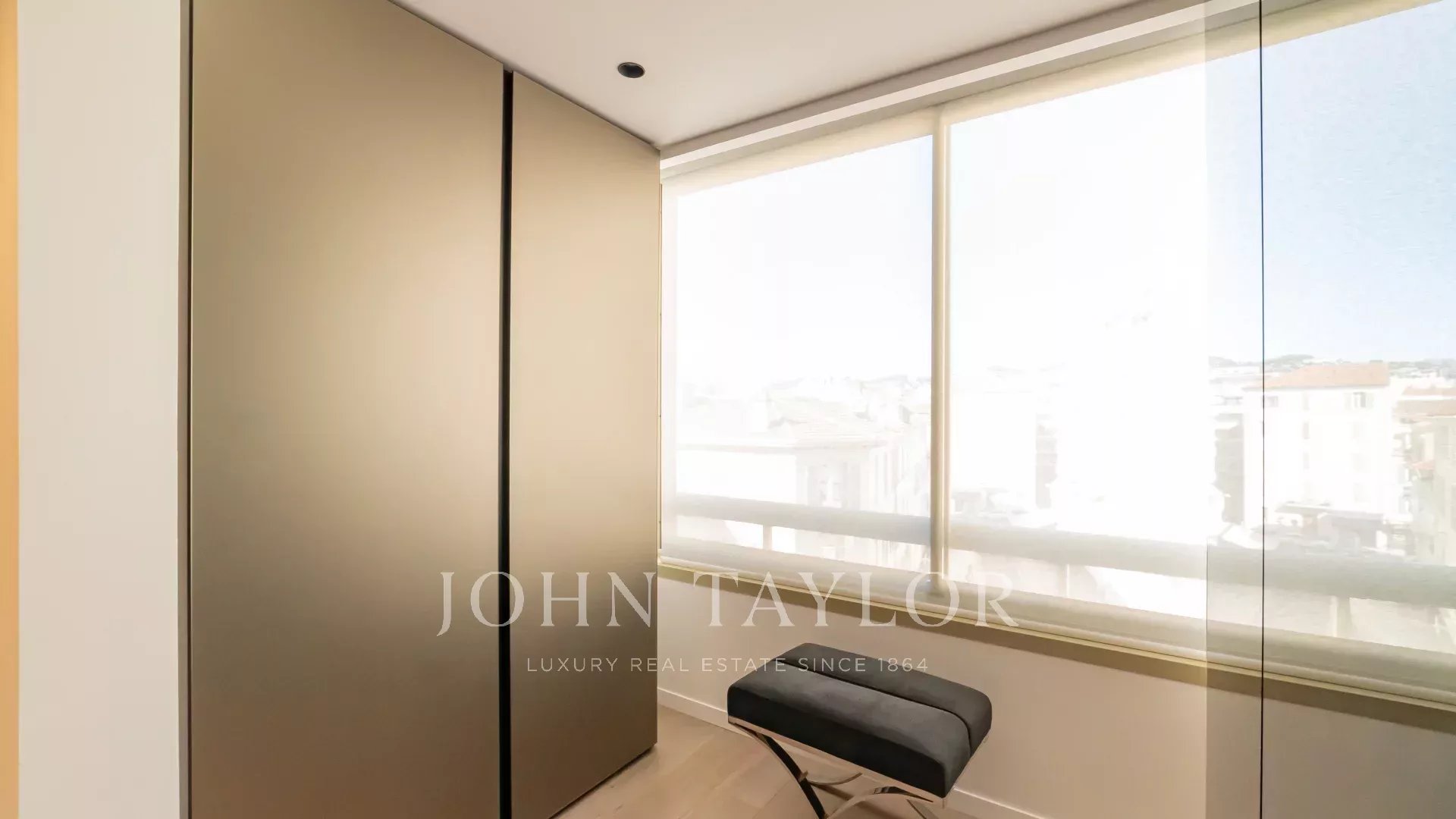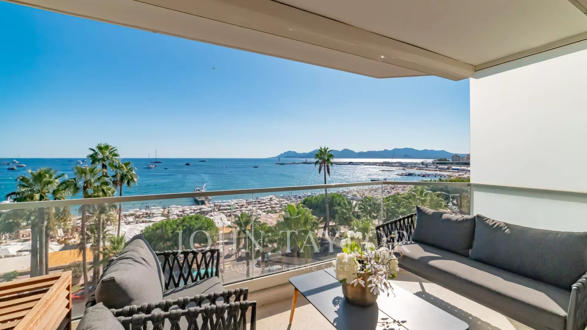 Attractive air-conditioned apartment located in the heart of the Croisette on the 5th floor of a luxury residence, enjoying a magnificent panoramic view of the Bay of Cannes, its beaches, the Palace of Festivals and the Esterel.