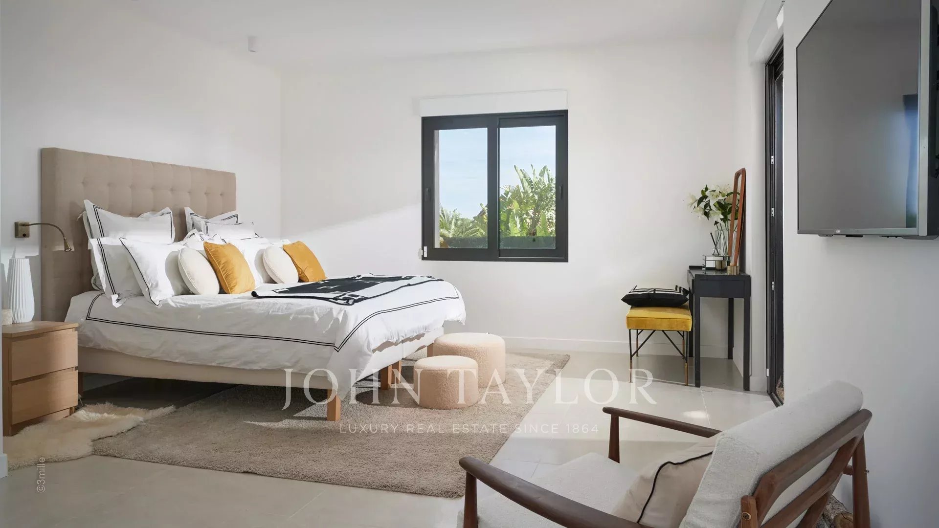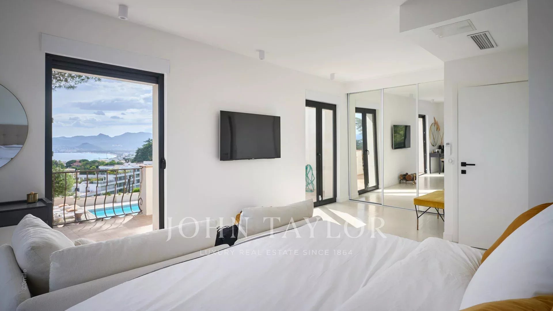 Bedroom (double bed) with TV opening on the garden and the pool, sea view.