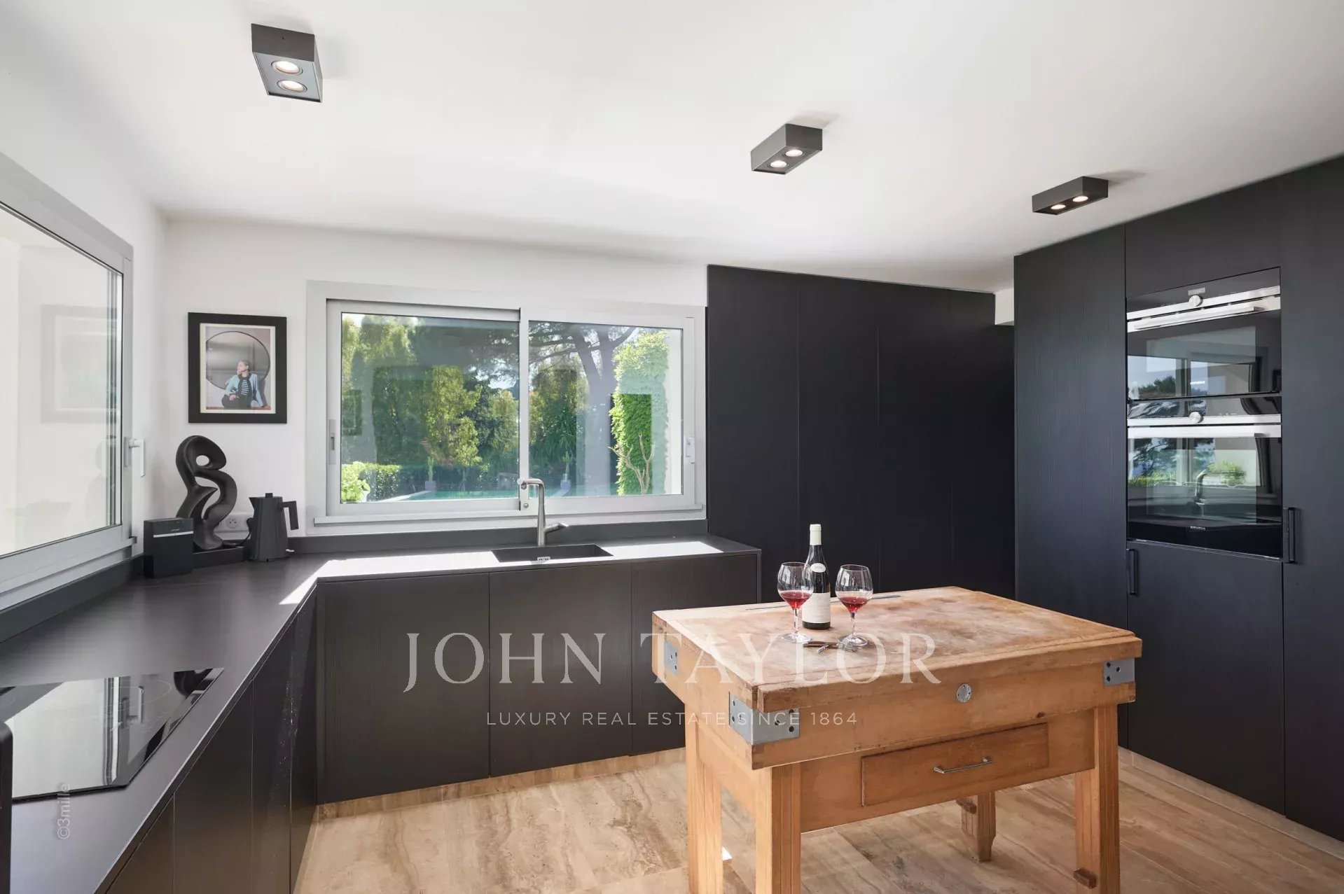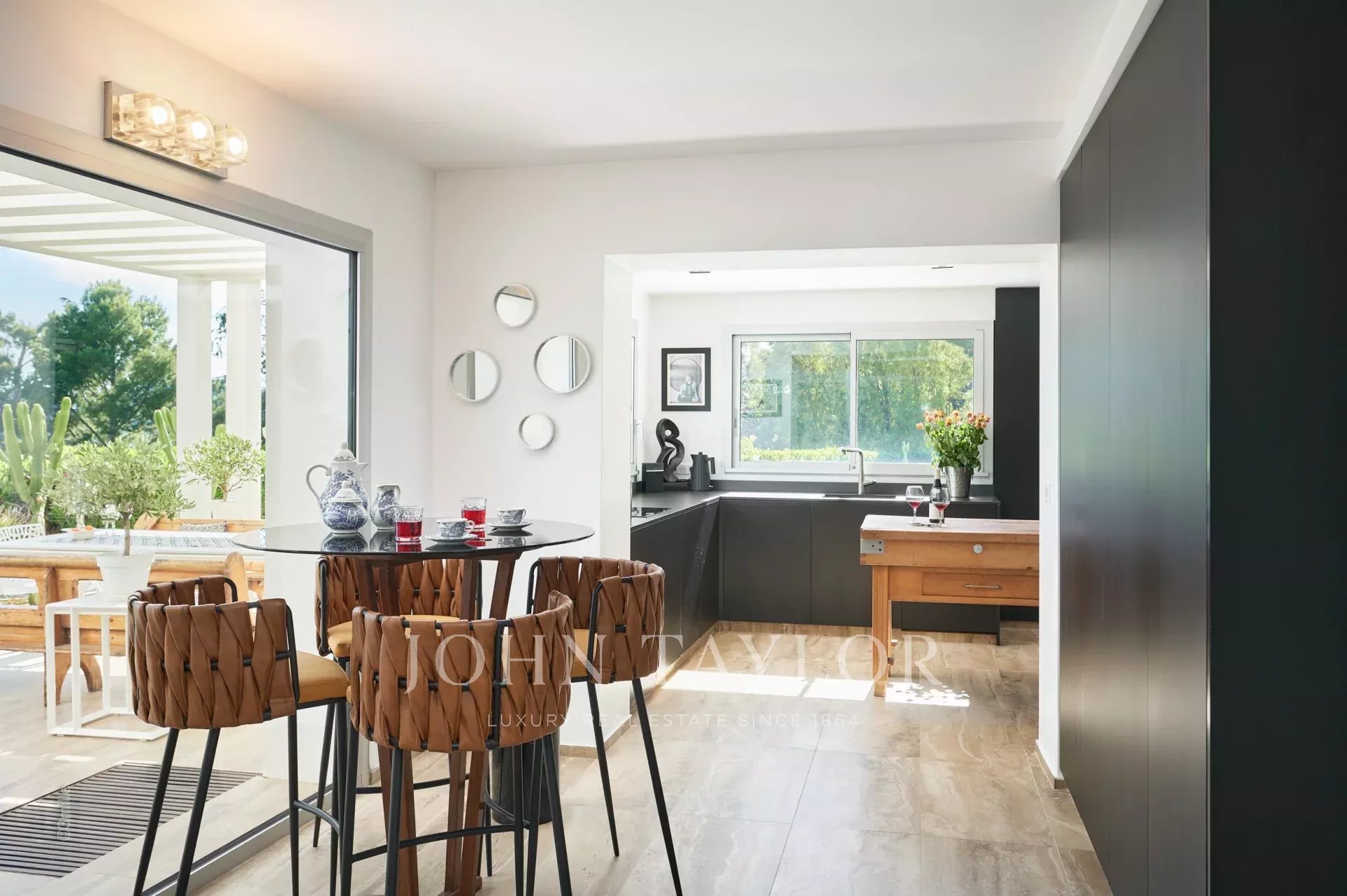 Fully equipped kitchen open to the dining room and giving onto the garden, the summer dining room and the pool