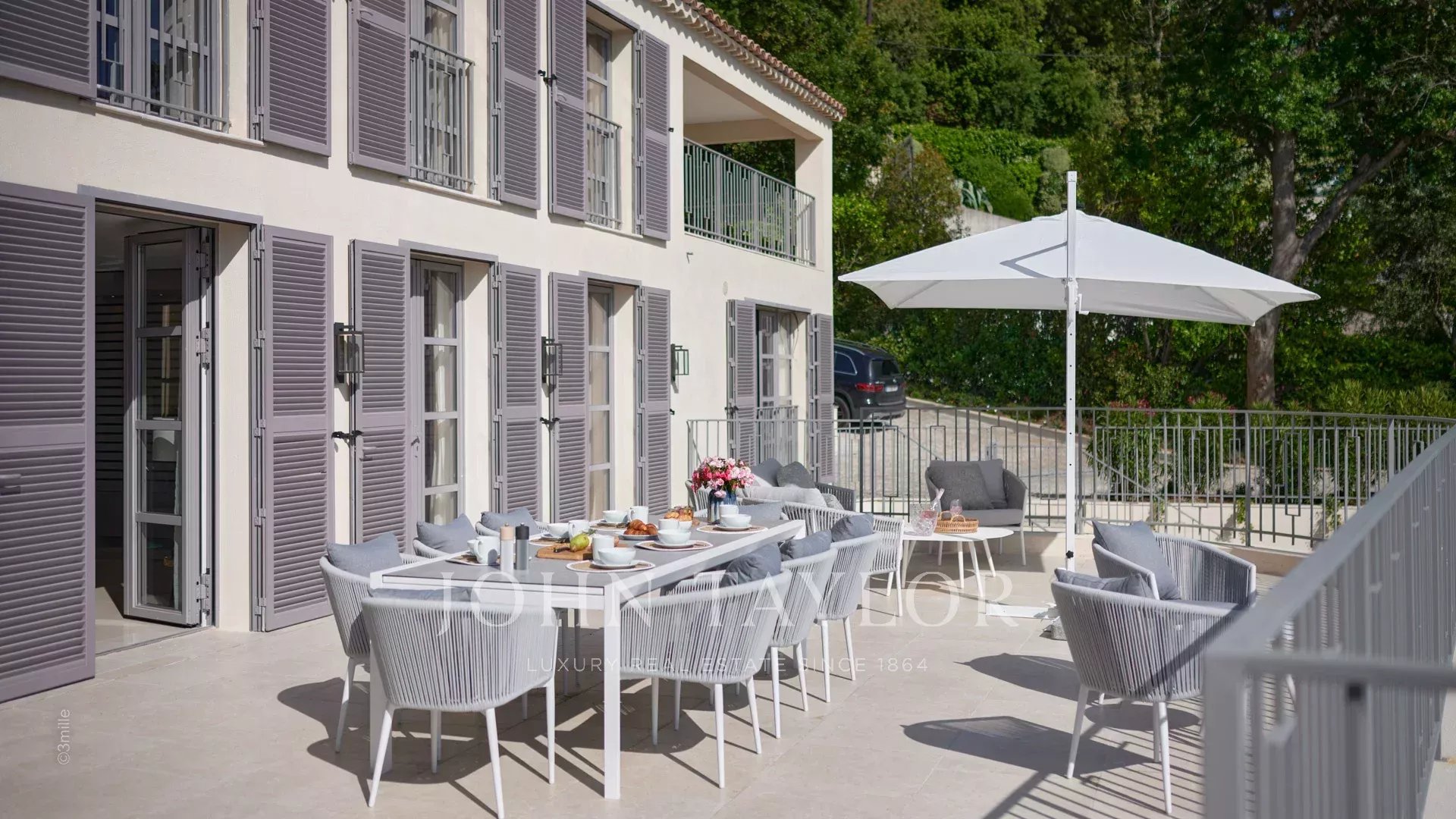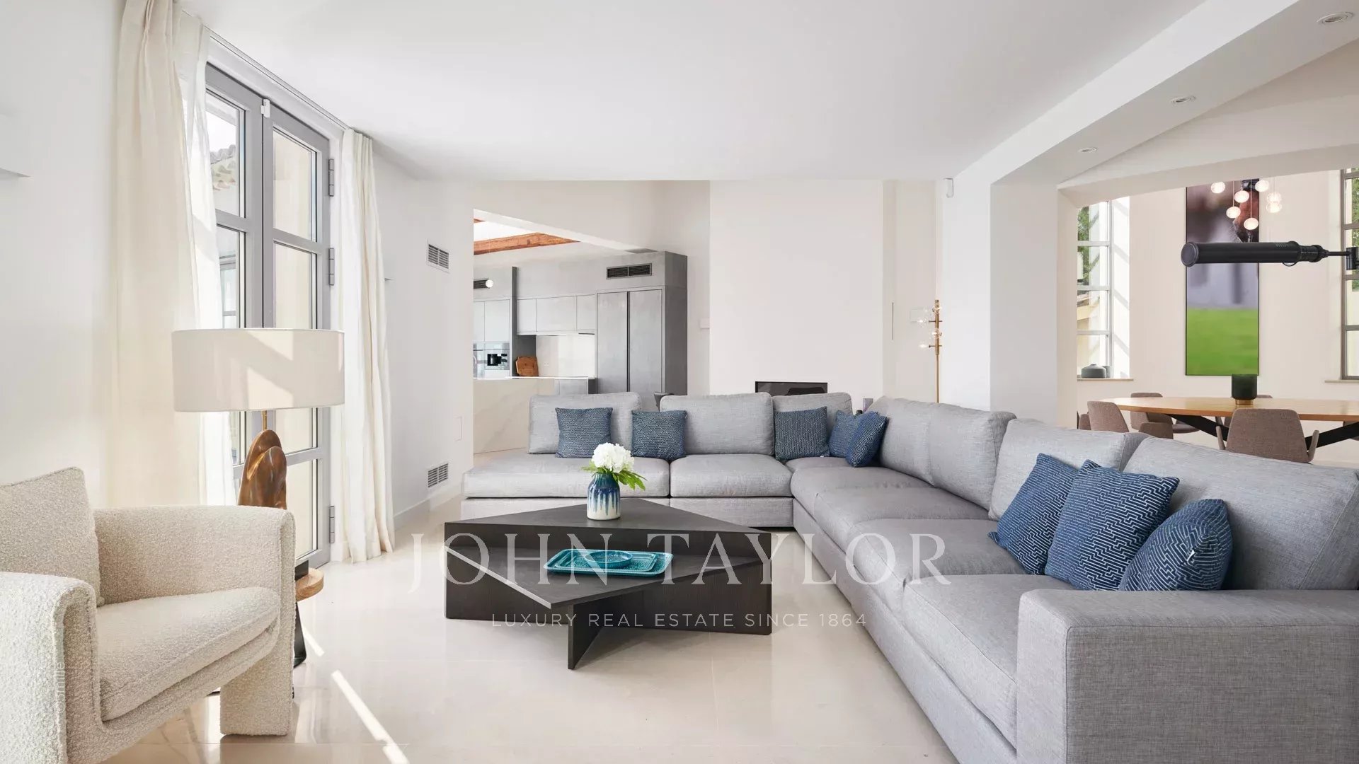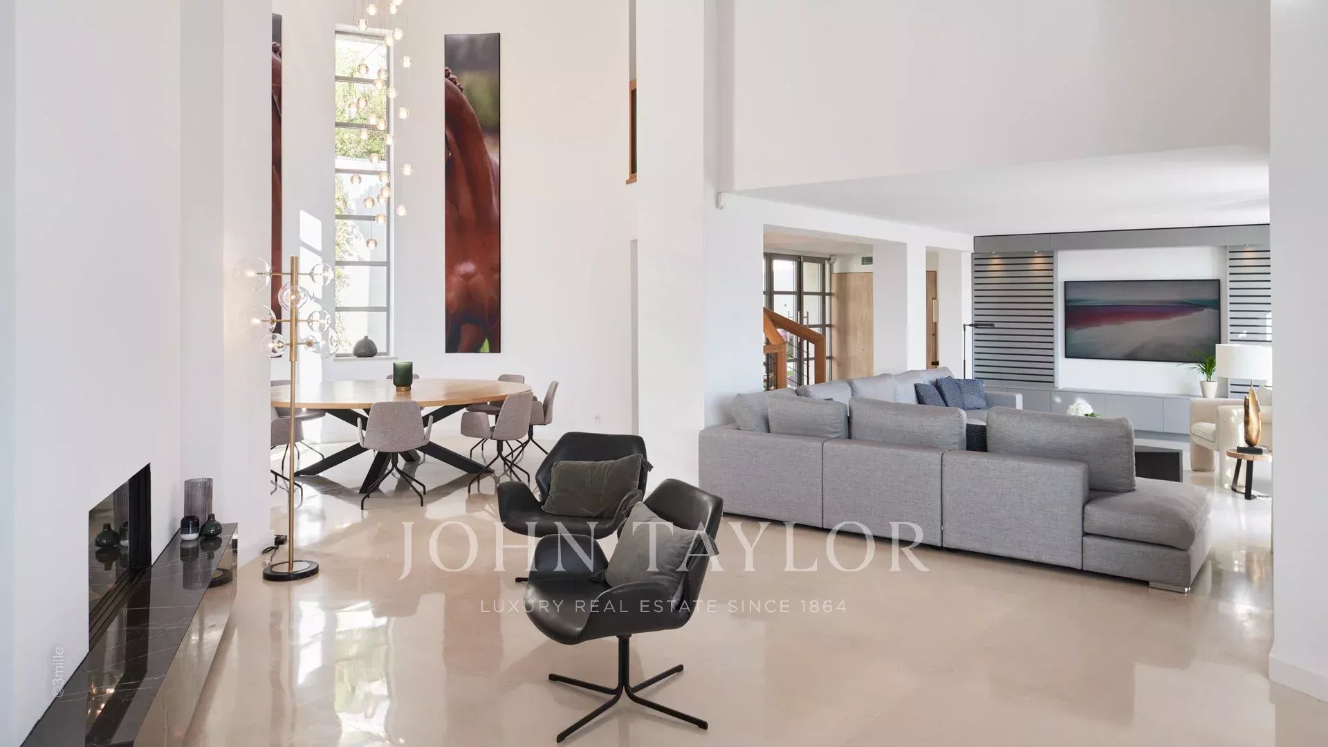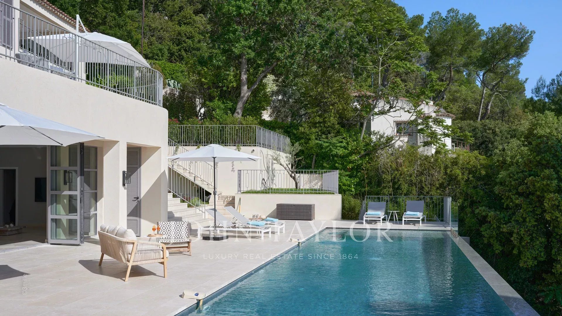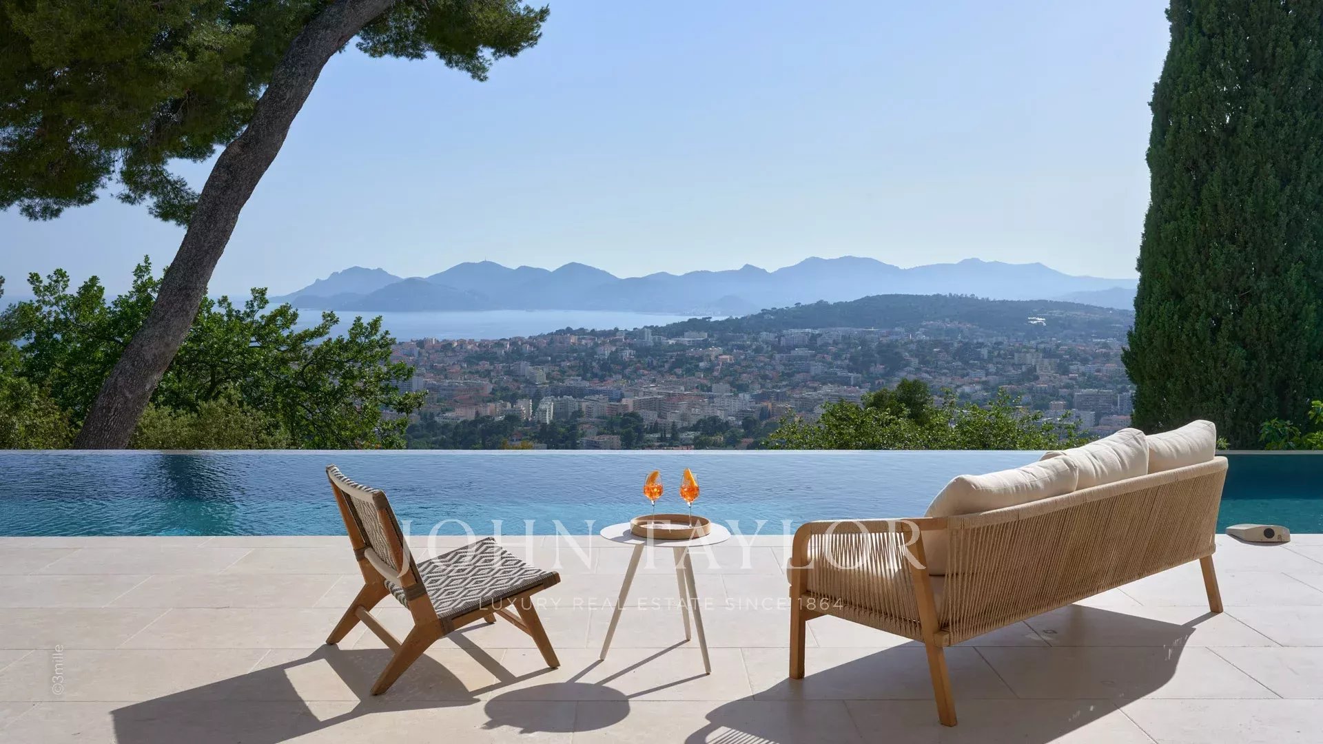renovated with beautiful amenities of about 340 m², built on a landscaped garden of about 2 300 m² with swimming pool, offers large volumes of reception and a panoramic view on the bay of Cannes, the Esterel Hills and the sea.