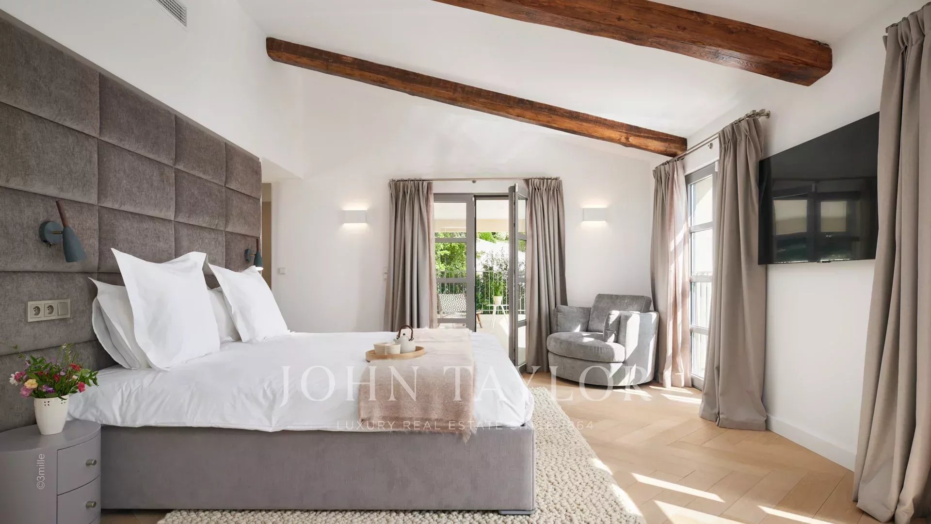A double bedroom with bathroom, shower room en suite, toilet and dressing room opening onto the swimming pool terrace.