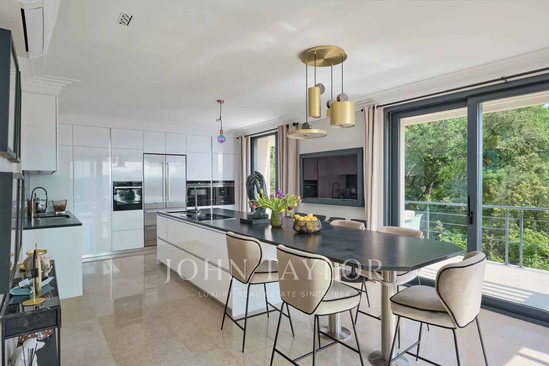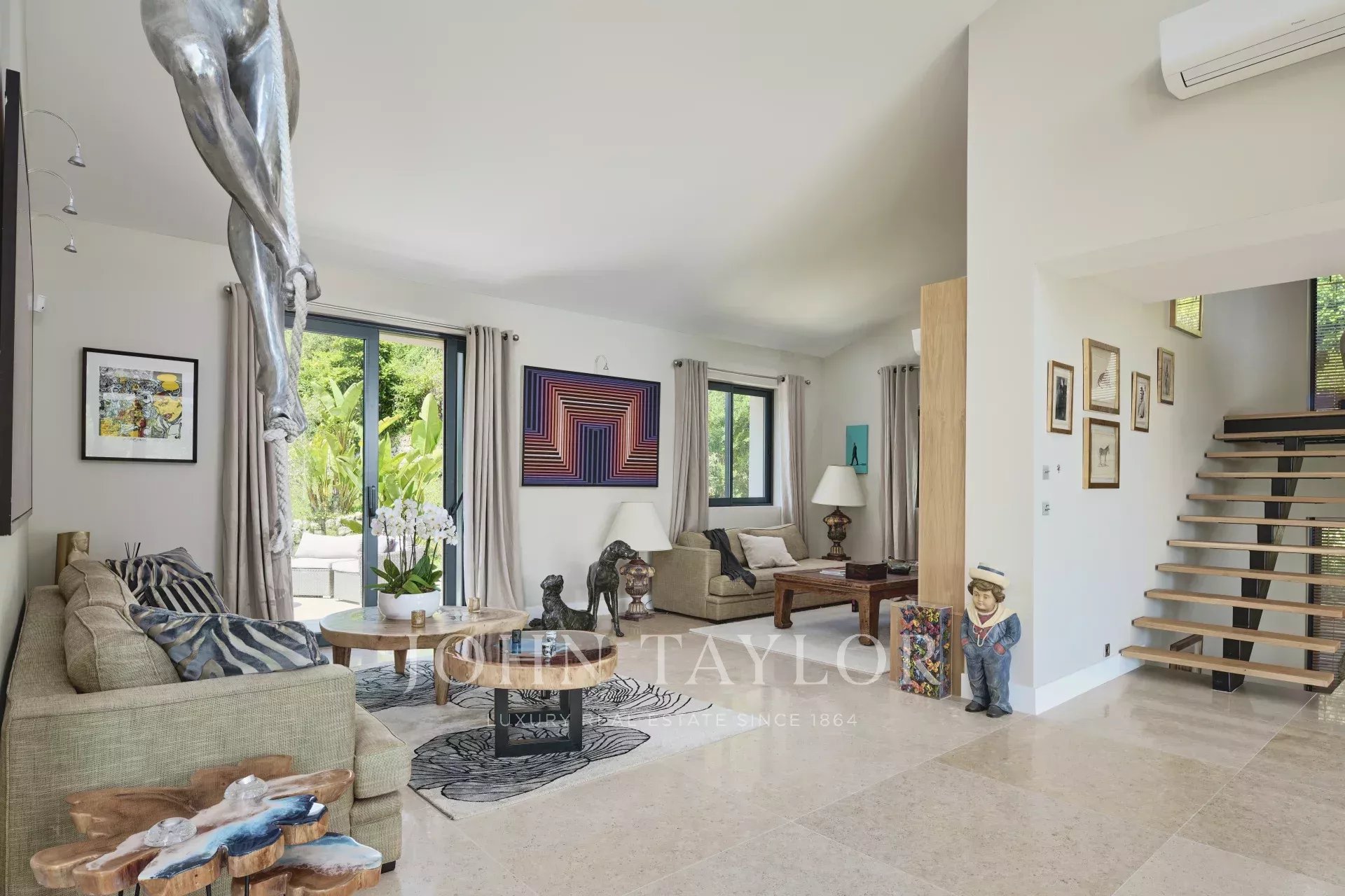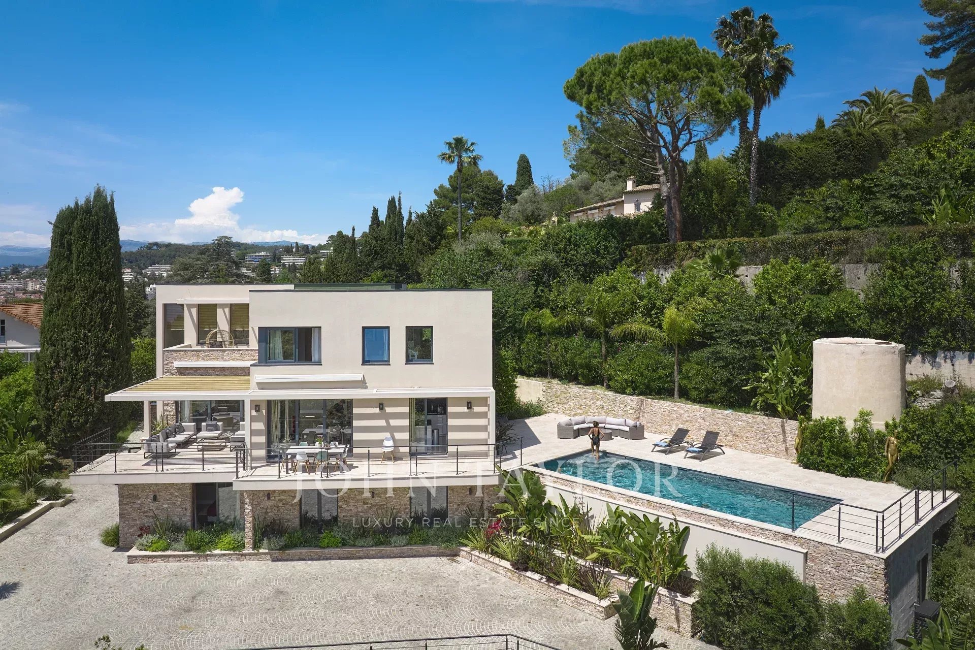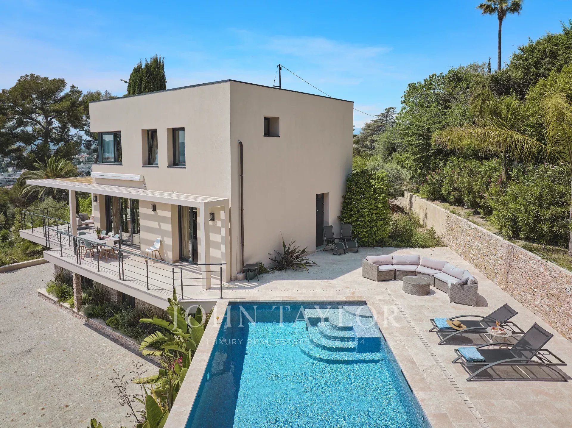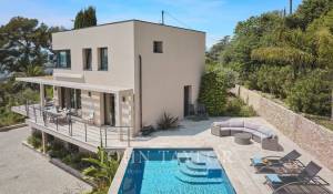 Located on the heights of Cannes in a quiet residential area, 10 minutes from the city centre of Cannes, very attractive contemporary villa of about 300 sqm fully renovated with top of the range appointments throughout.