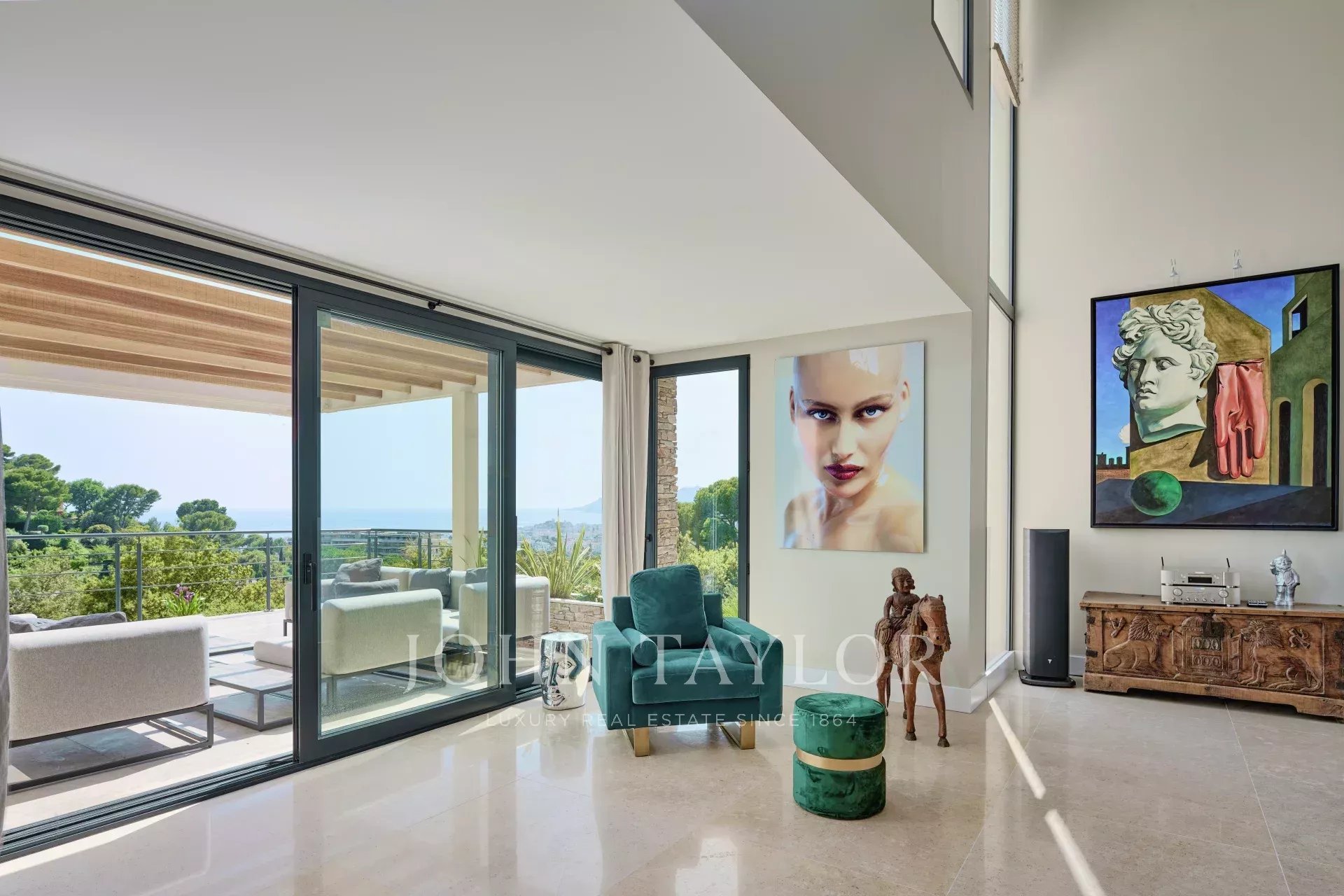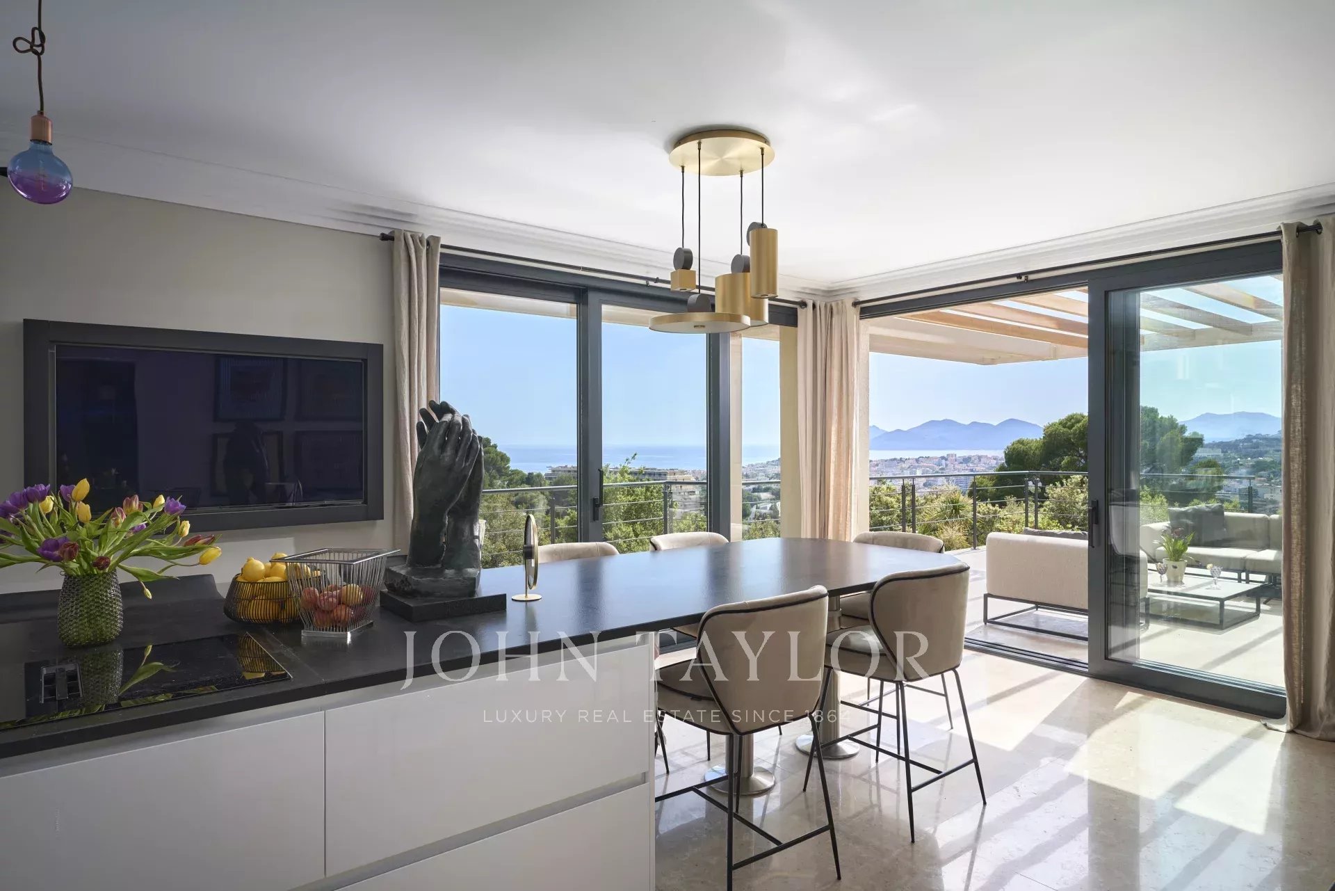 Large and bright reception area with TV corner and lounge with triple exposure and opening onto two terraces equipped with lounge and summer dining room, overlooking the bay of Cannes
