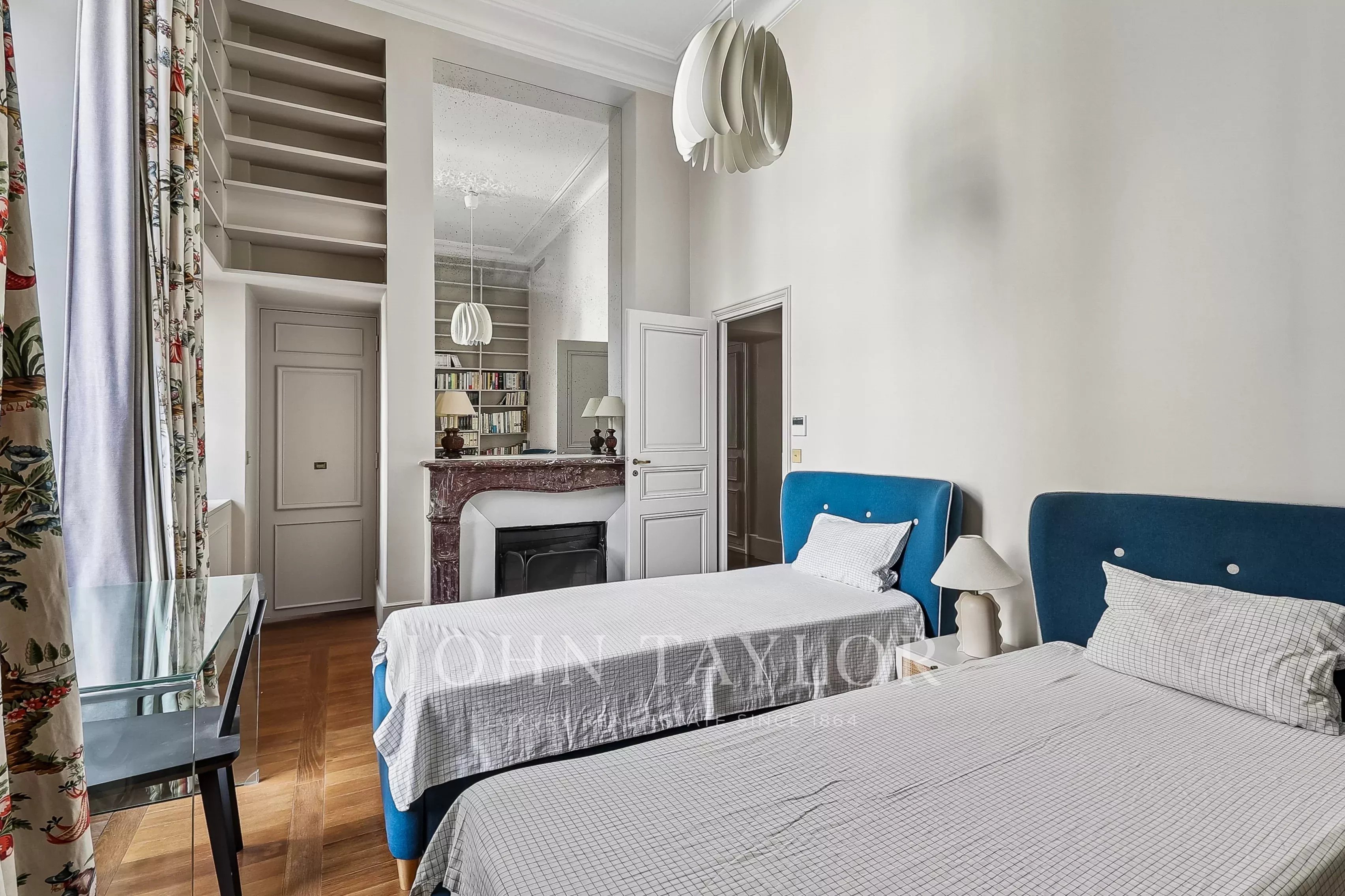 Located on the second floor, this fully furnished apartment charms with its very spacious rooms, its old-world charm (very high ceilings, period elements), timeless elegance, and functional fireplaces.