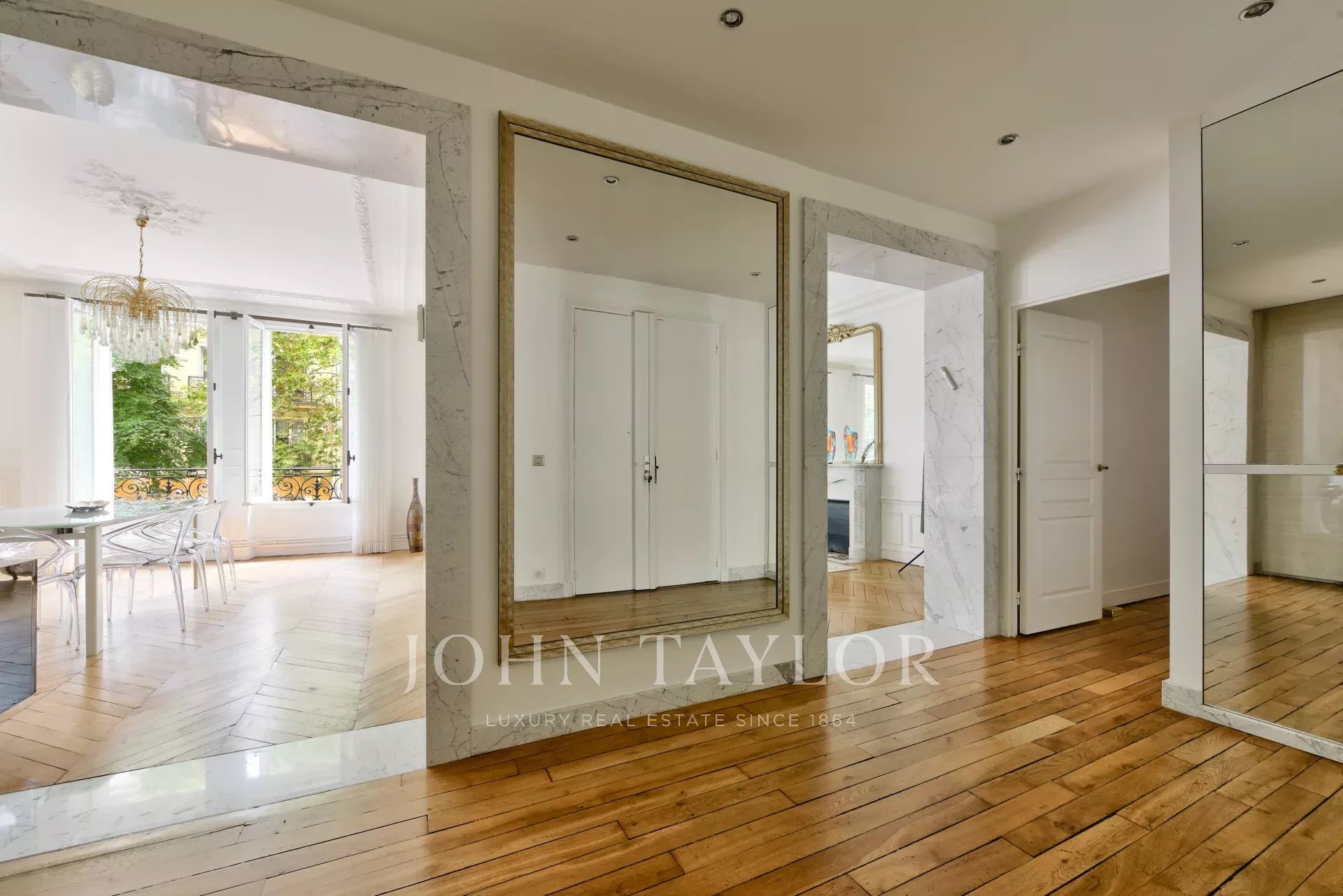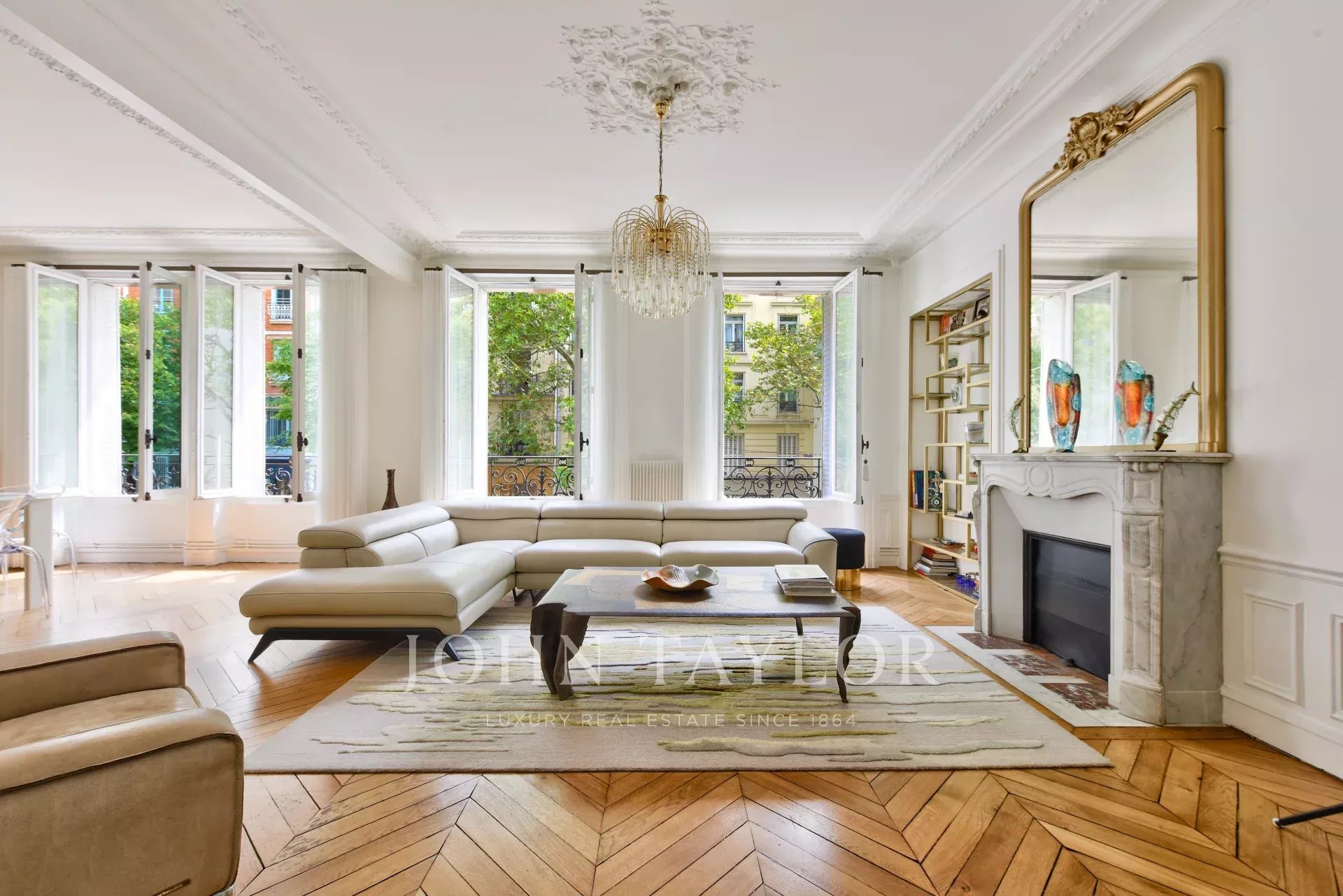 Through-going, bright and perfectly appointed, it features herringbone parquet flooring, period fireplaces, moldings and 3-meter high ceilings.