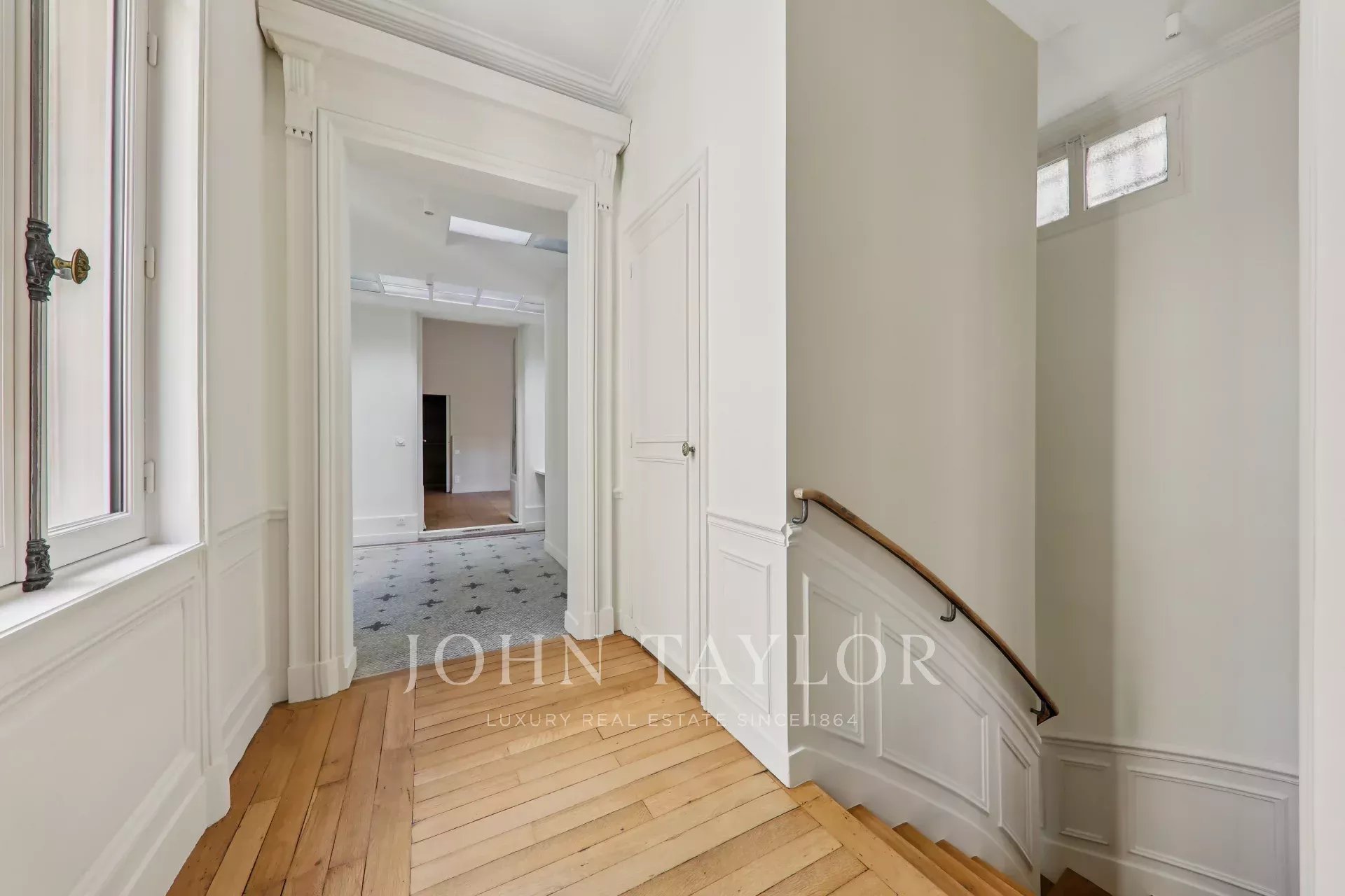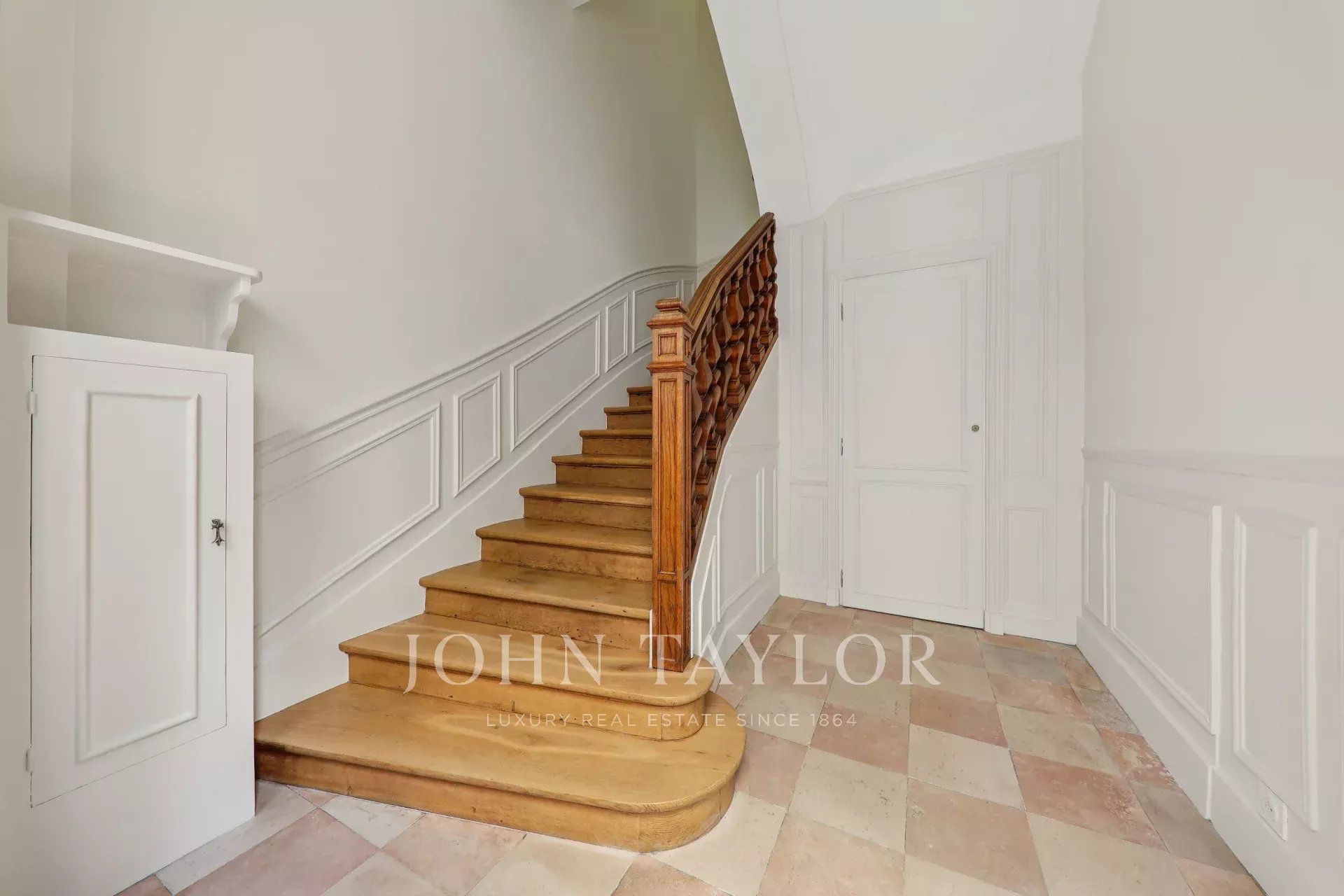 An entrance hall with a very large storage space, a XIXth century wooden staircase.