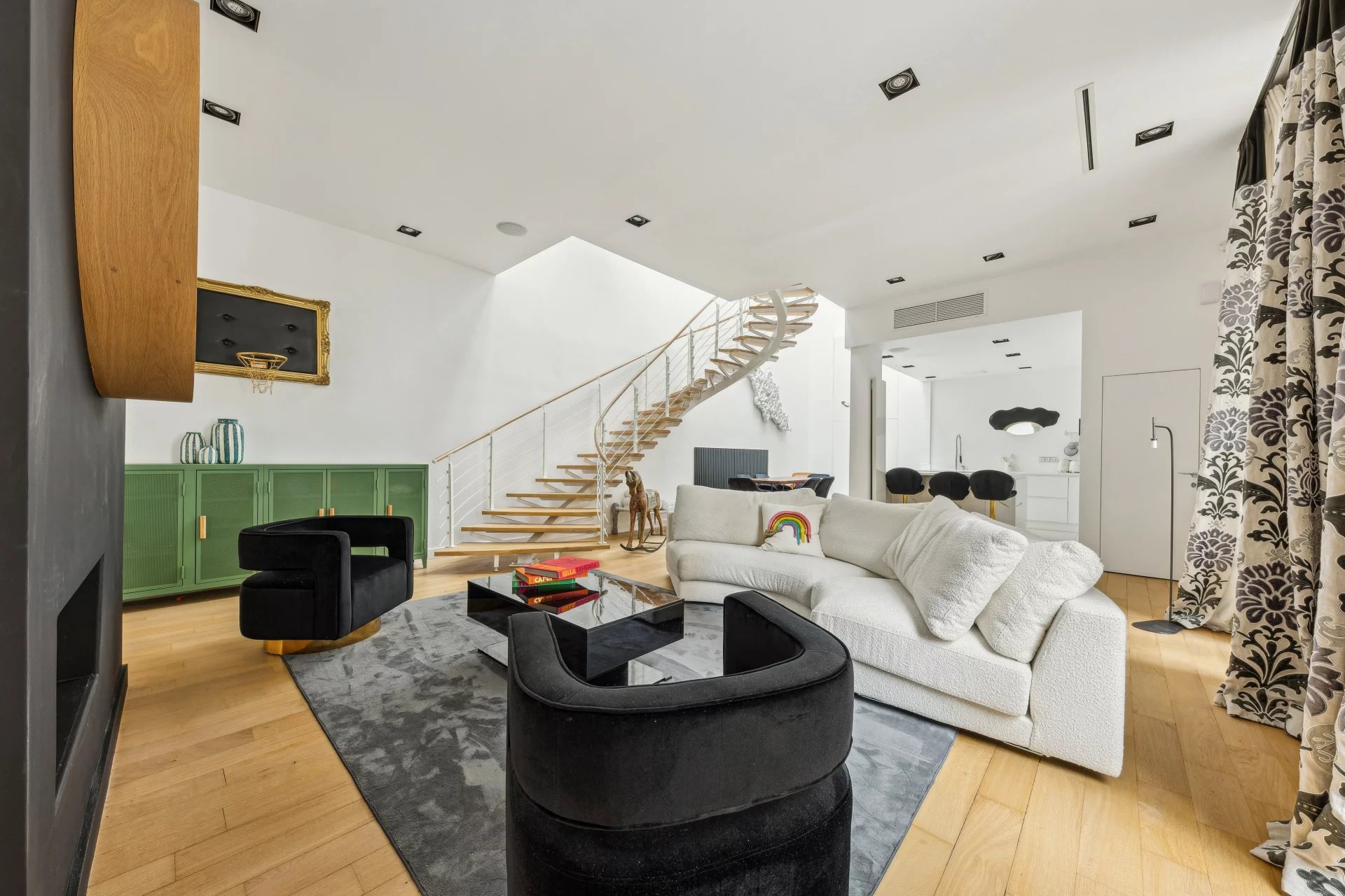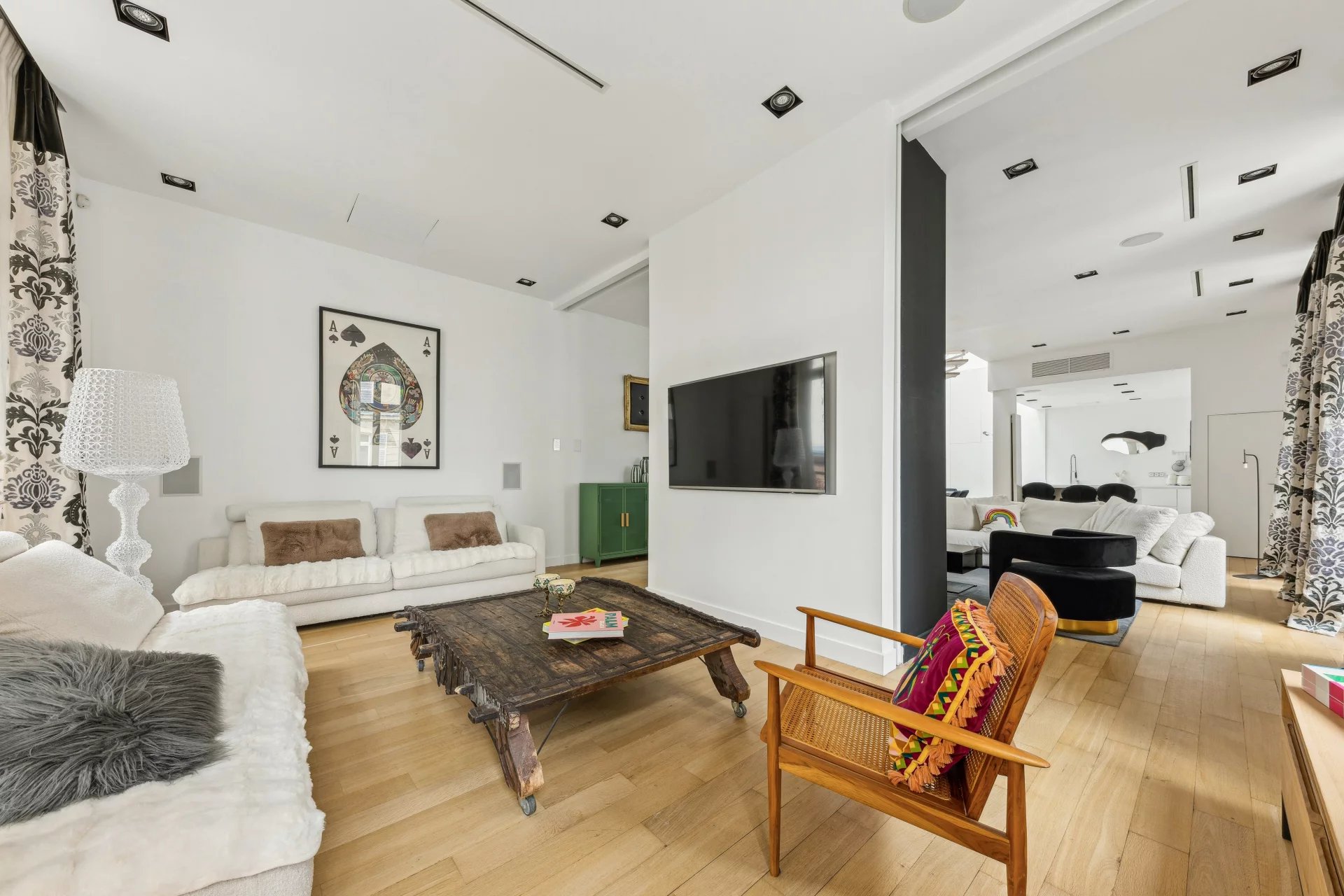 - an 83m² living room with impressive high ceilings, equipped with a video projector,