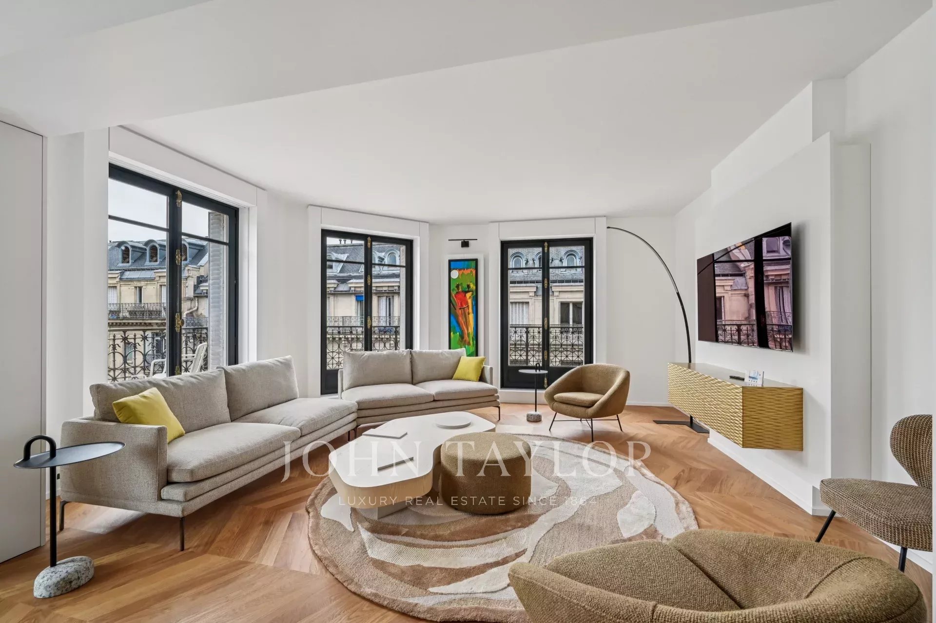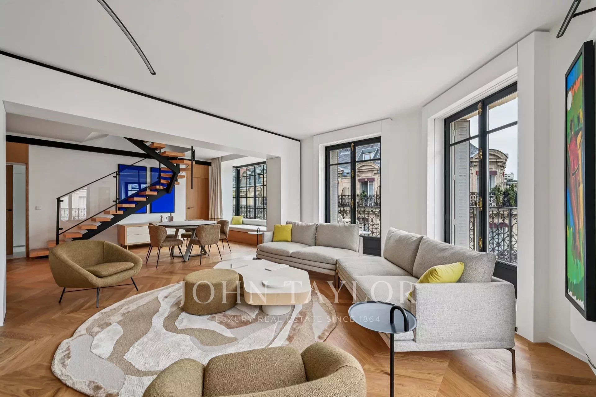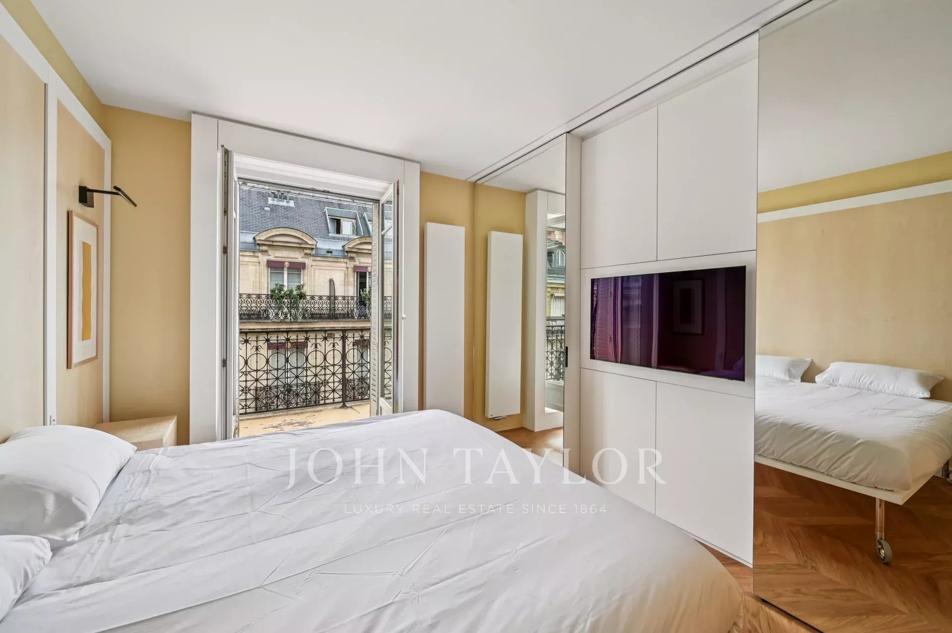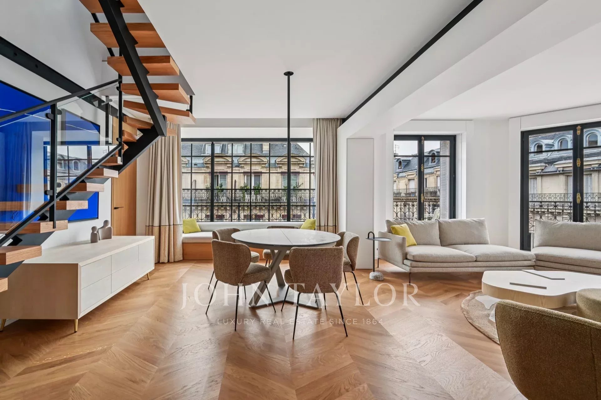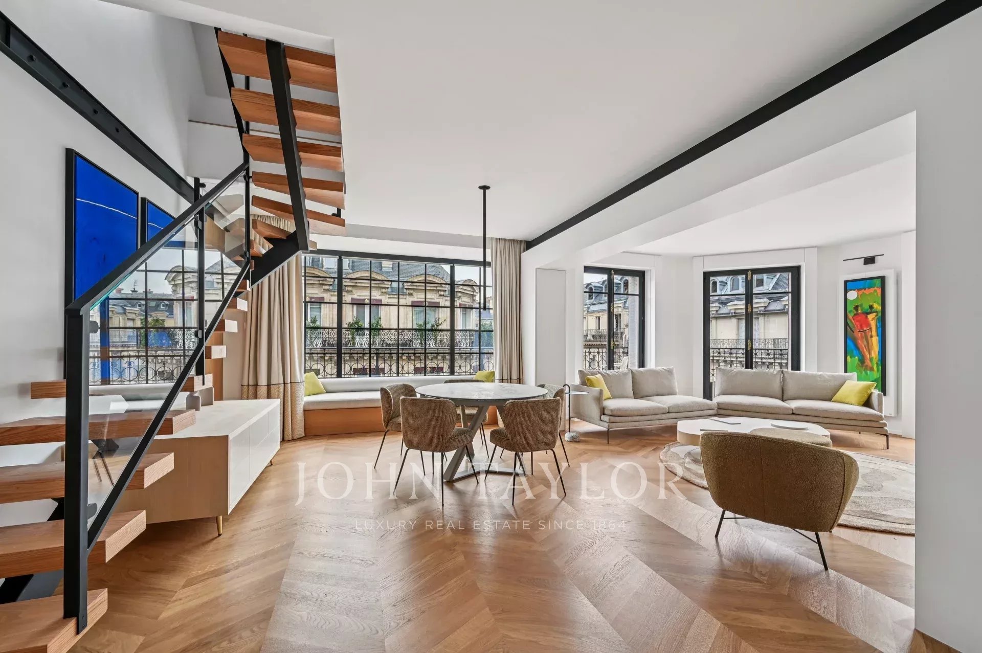 Just a stone's throw from avenue Montaigne, on the 5th and 6th floors of a secure building with elevator and janitor, this 124 m² apartment, totally renovated and air-conditioned, comprises :