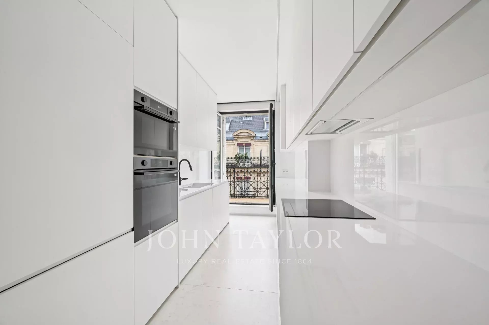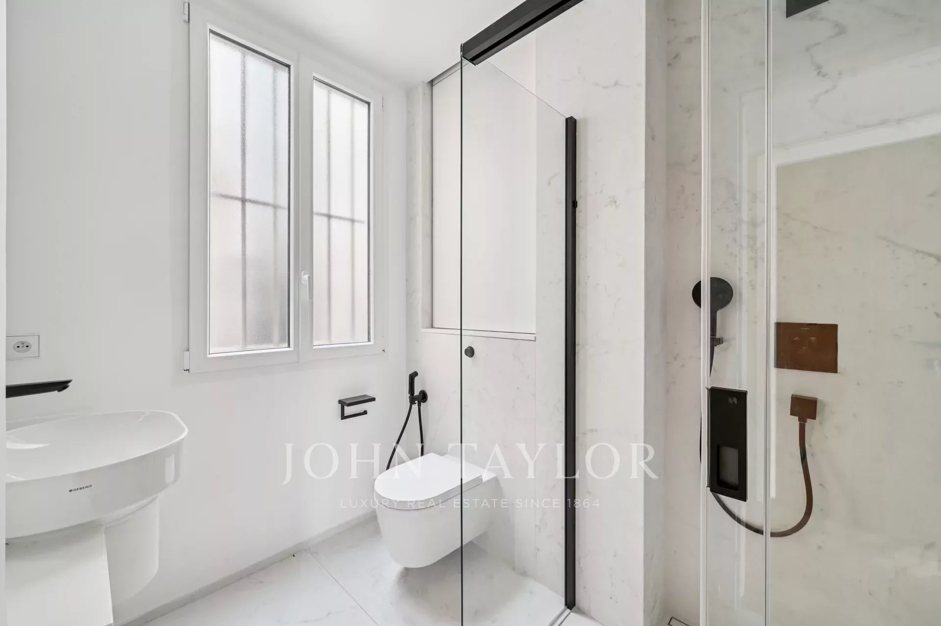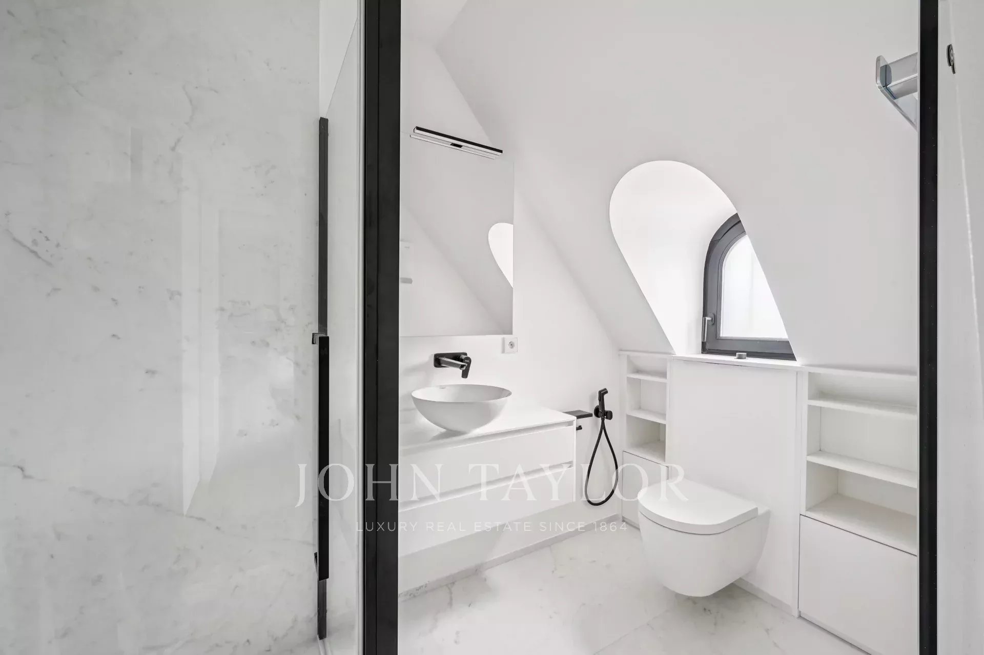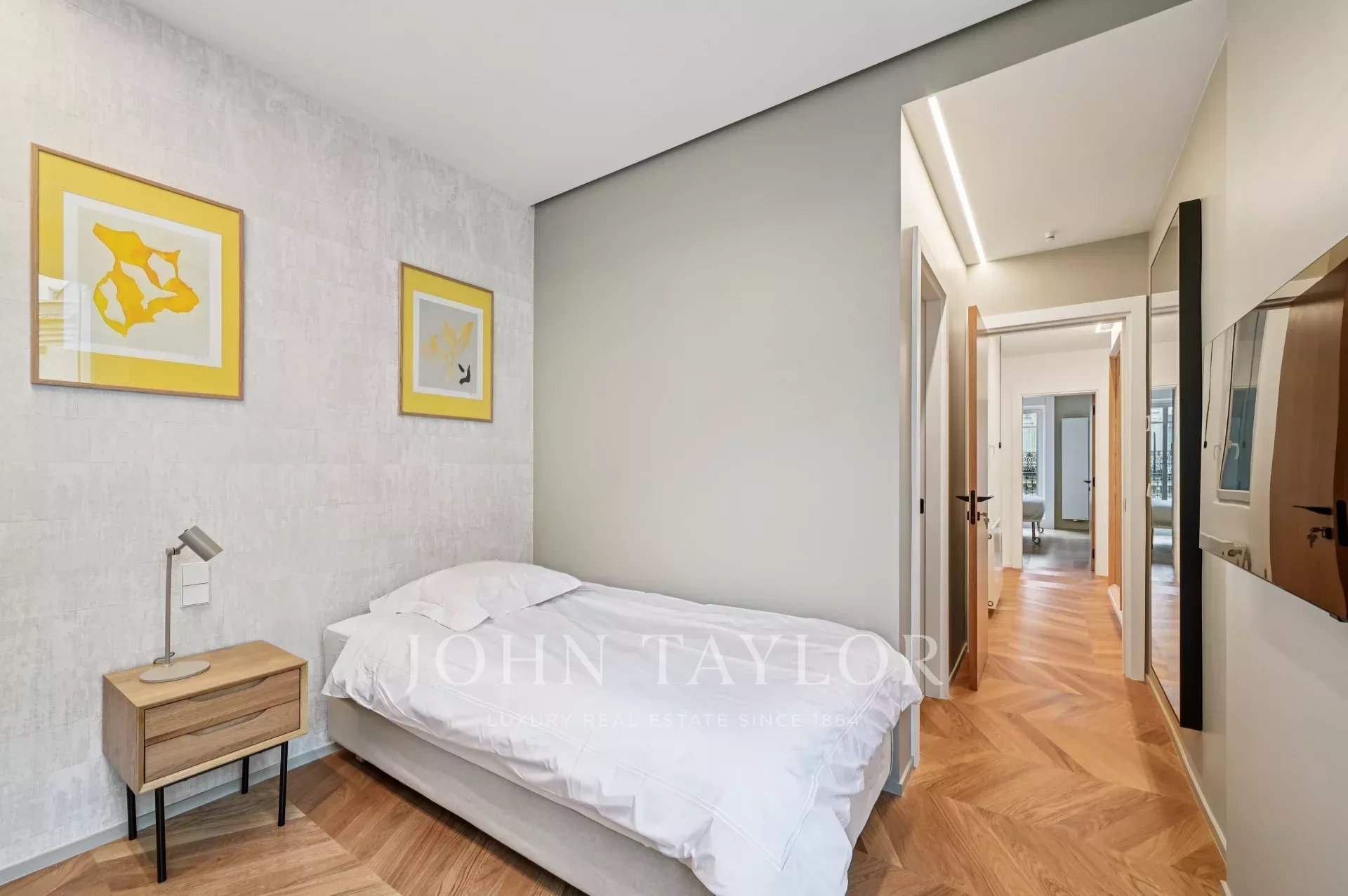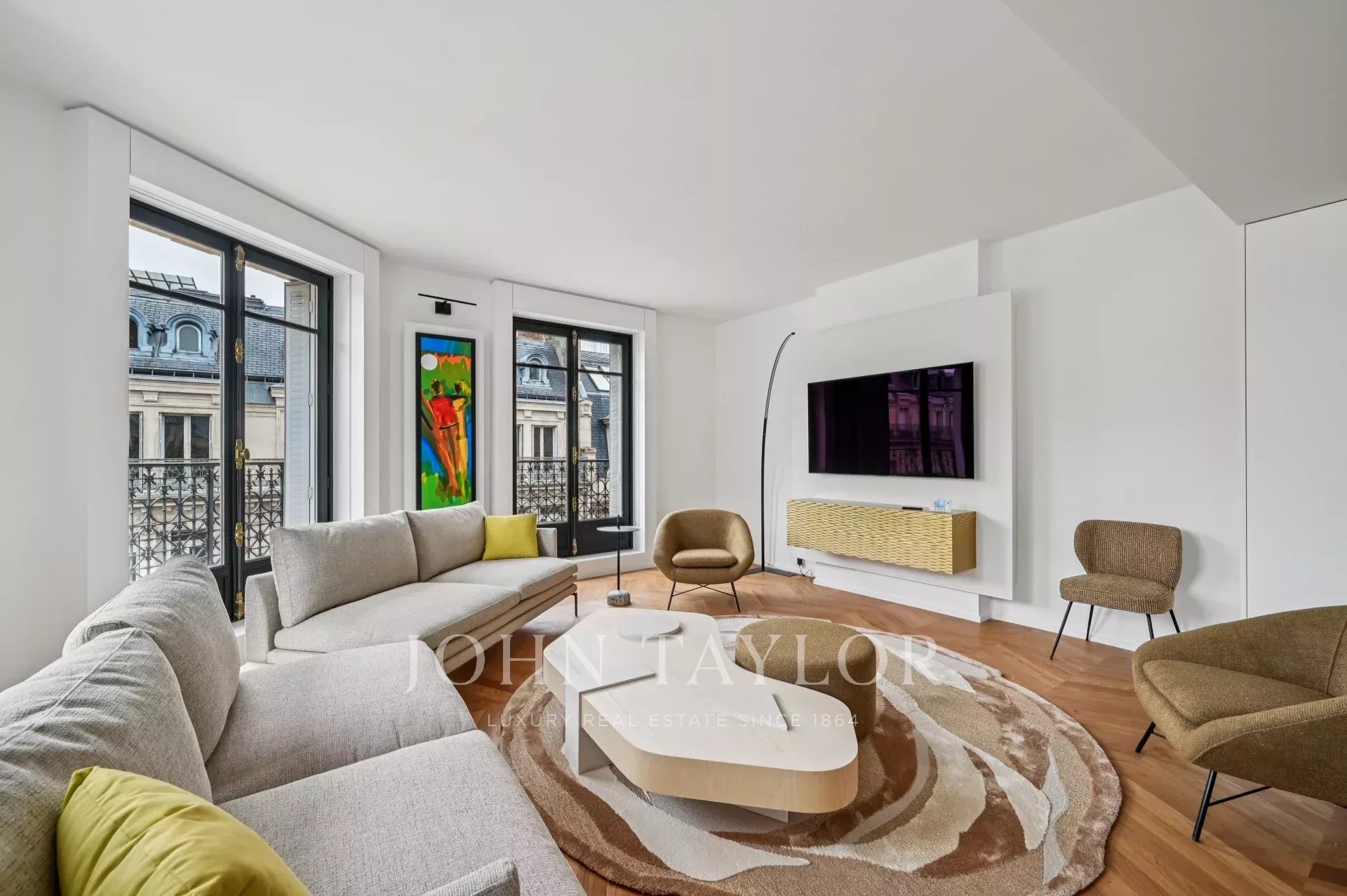 Just a stone's throw from avenue Montaigne, on the 5th and 6th floors of a secure building with elevator and janitor, this 124 m² apartment, totally renovated and air-conditioned, comprises :
