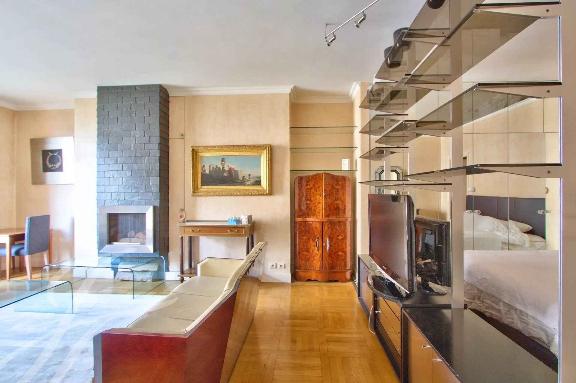 A main room comprising a living room with fireplace opening onto the bedroom,