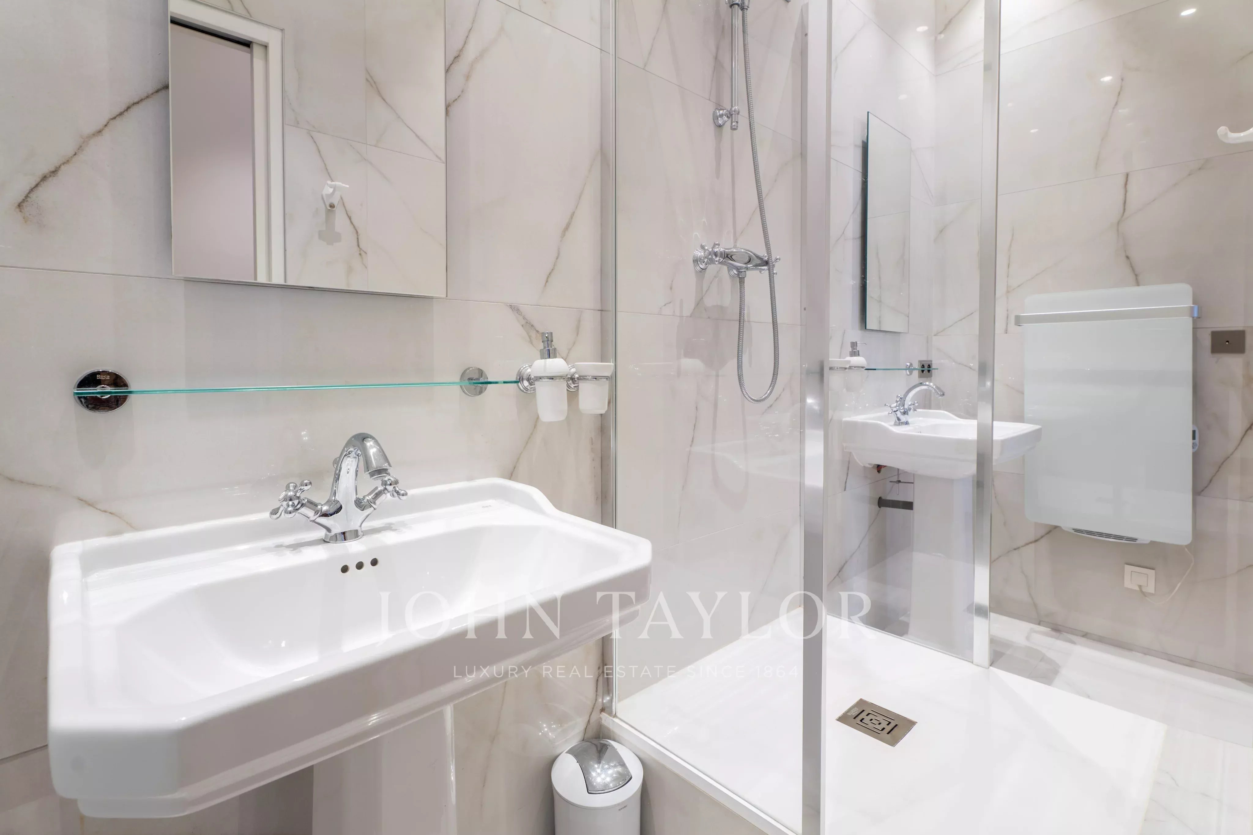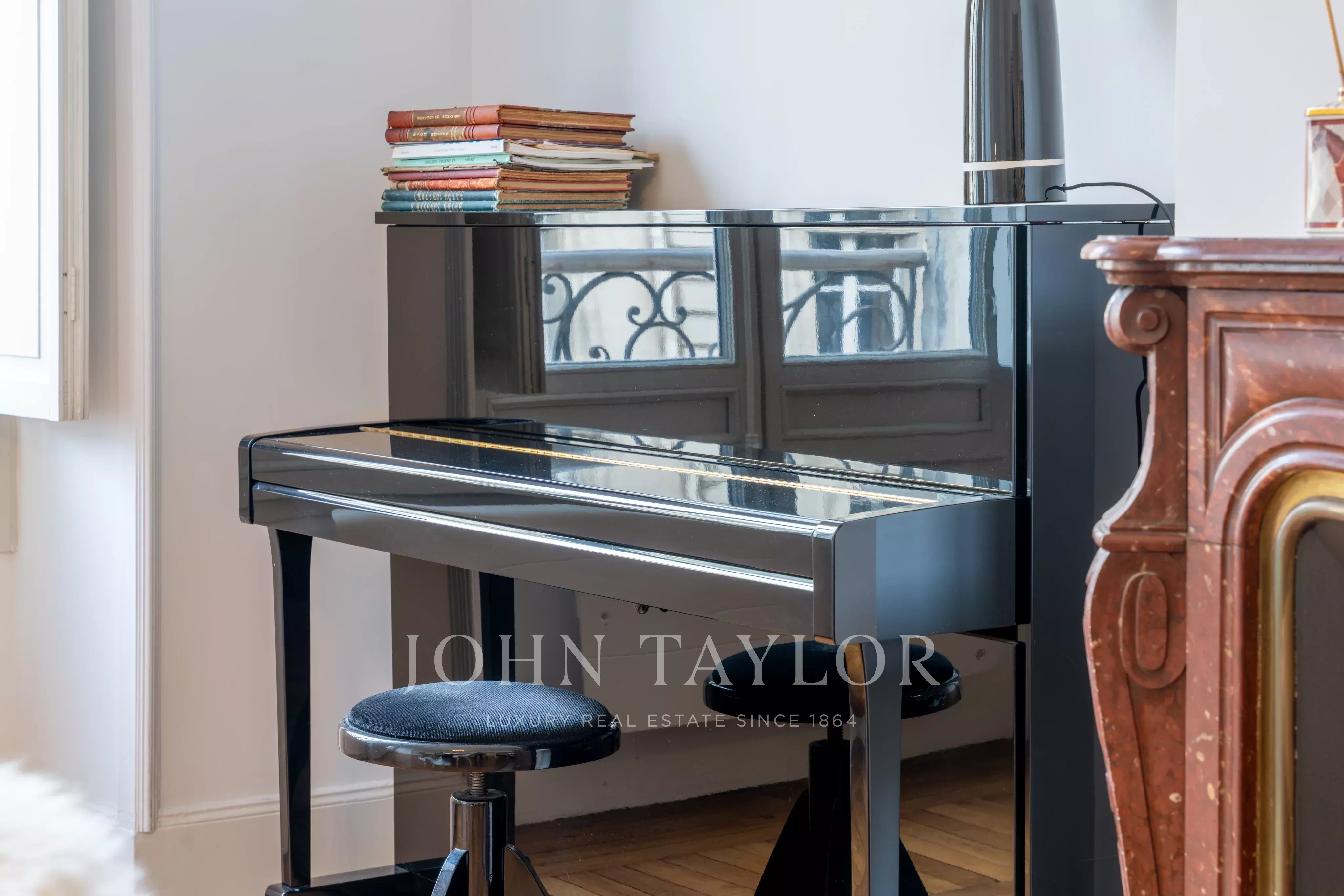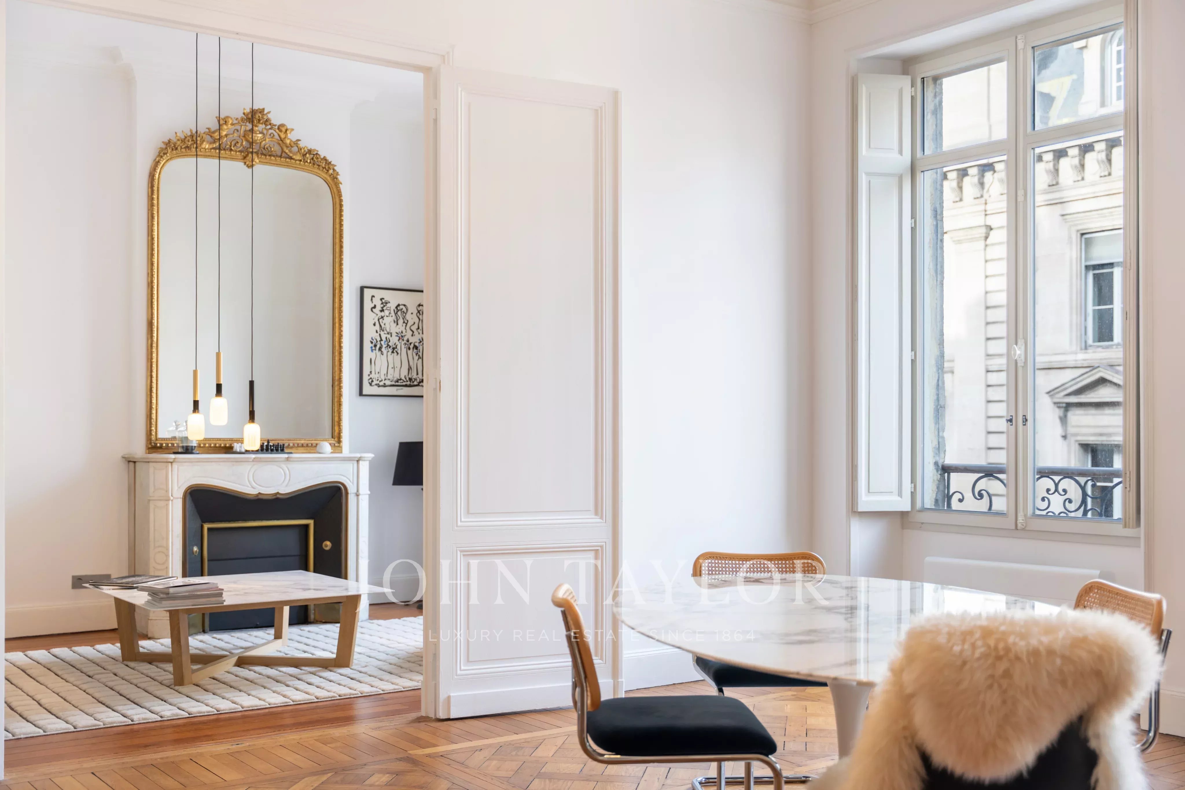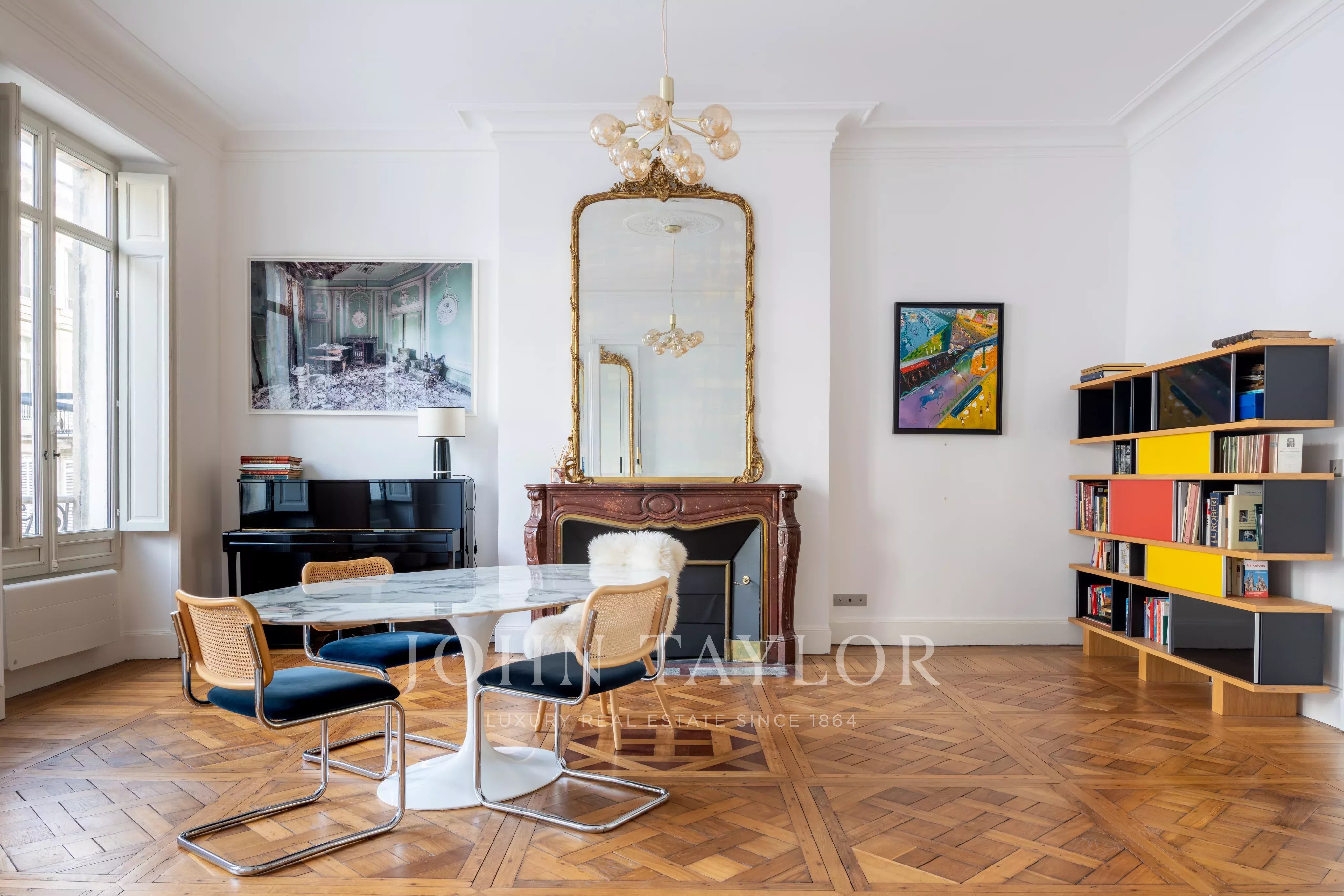 Old-world charm: parquet flooring, mouldings, fireplace; high-end furniture.