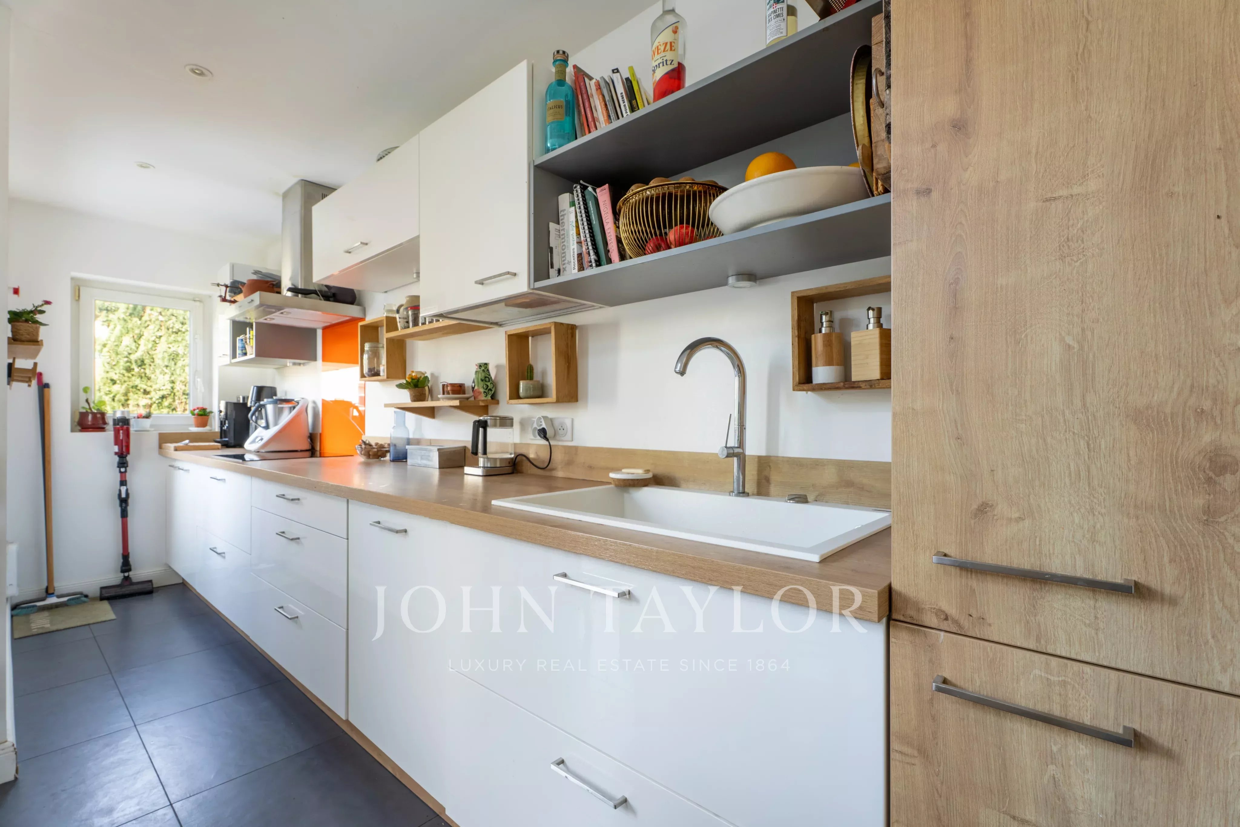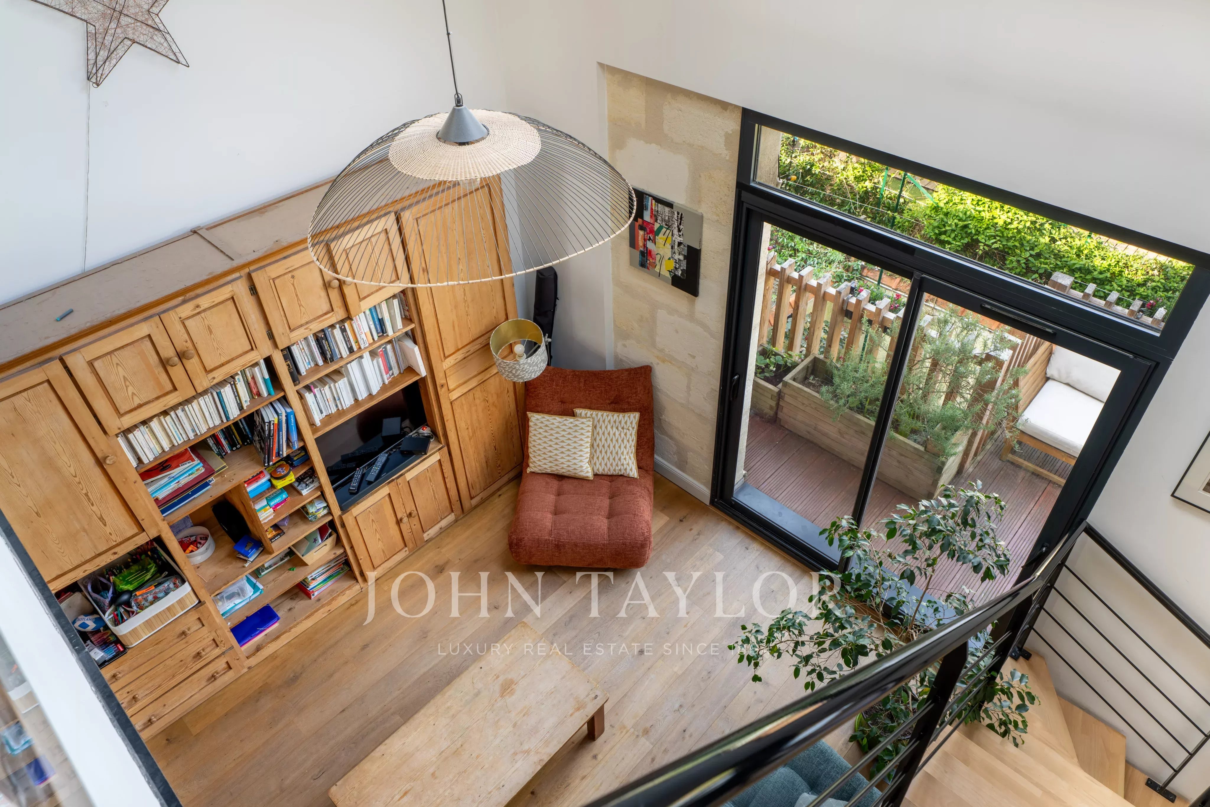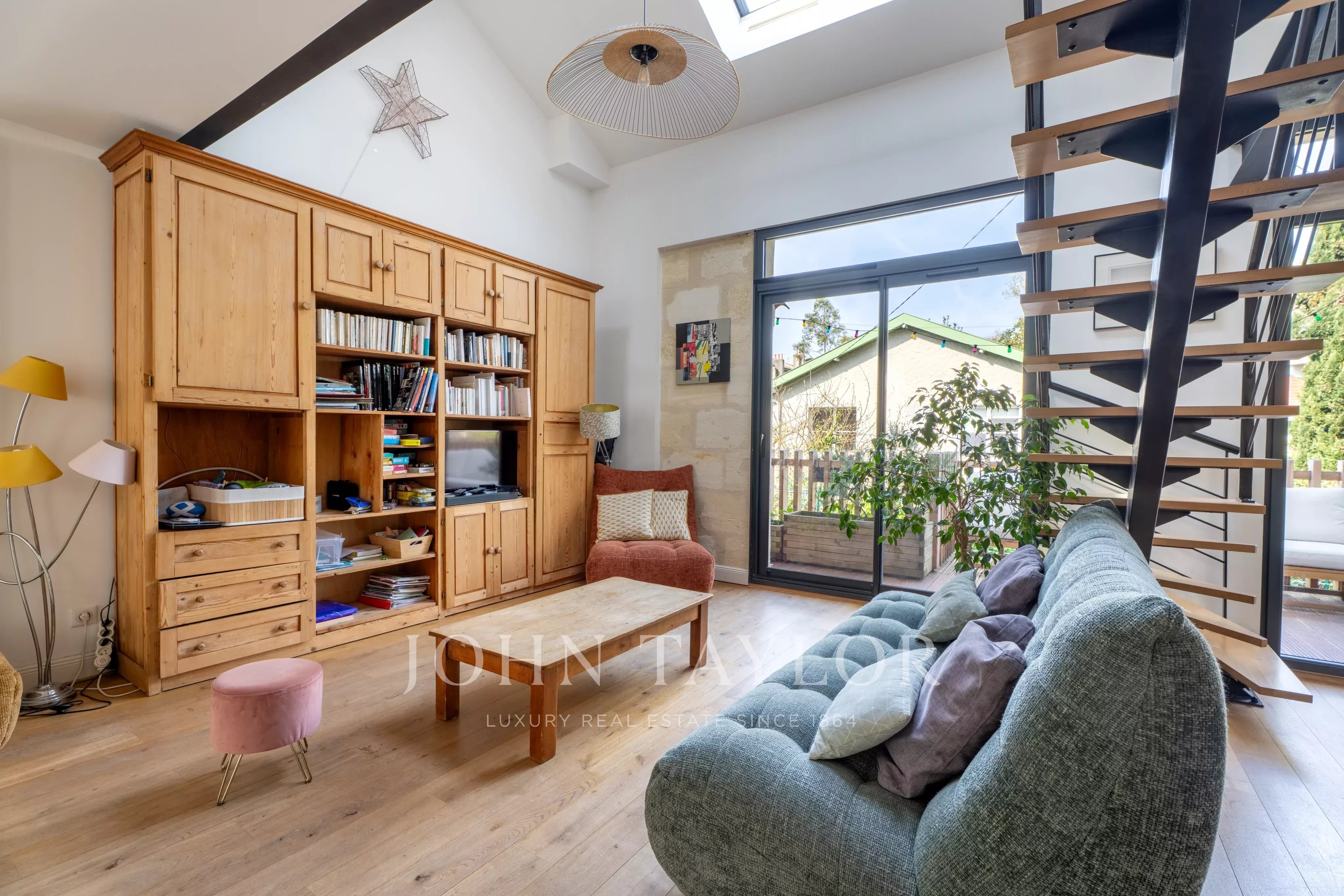 The first level hosts a superb living room of about 55 m², flooded with light, with a living room, dining room, and an open-plan kitchen, fully equipped and fitted, with a central island.