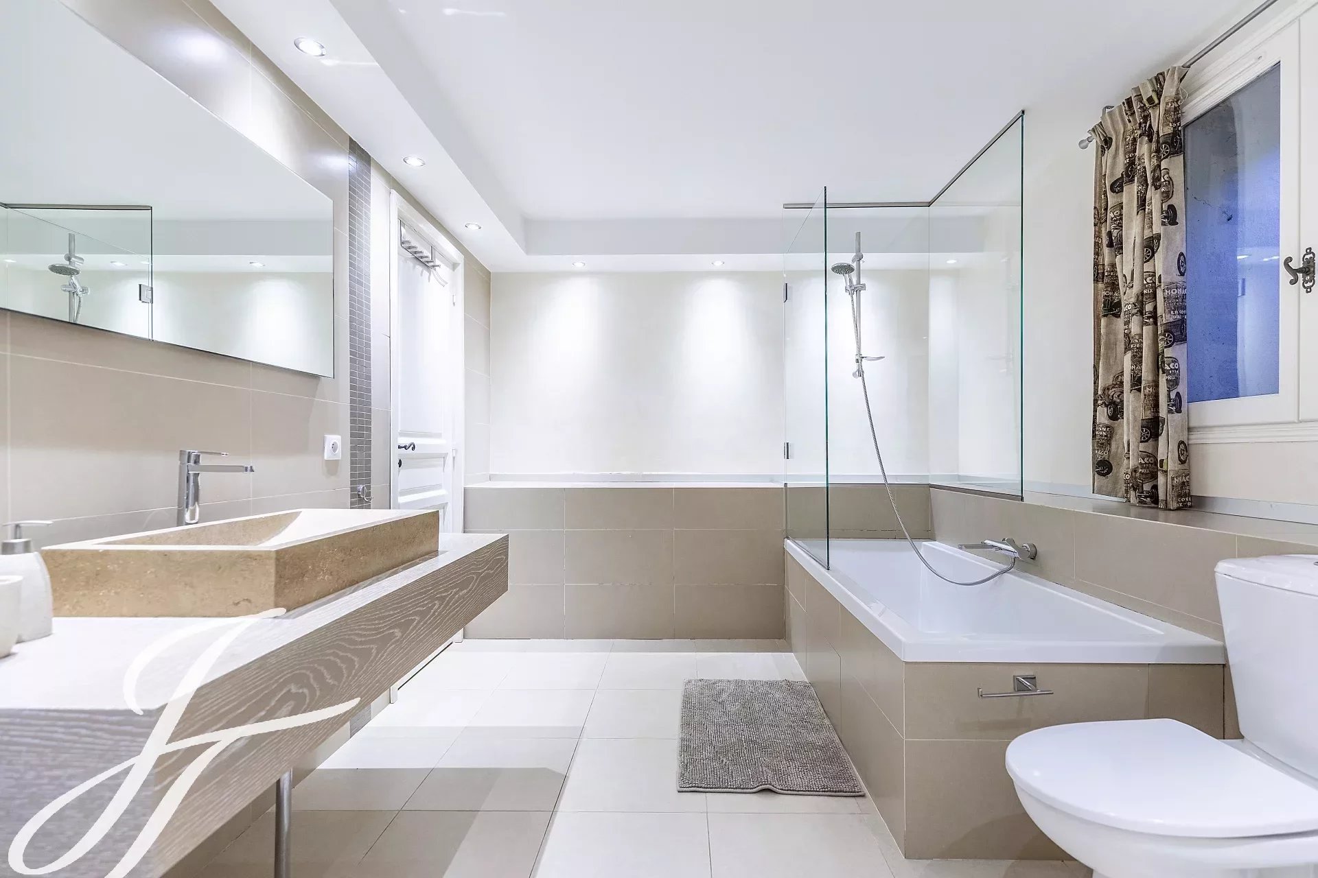 Master Suite (Bedroom N°1): Double bed, private balcony, and en-suite bathroom (bathtub, double vanity, WC)