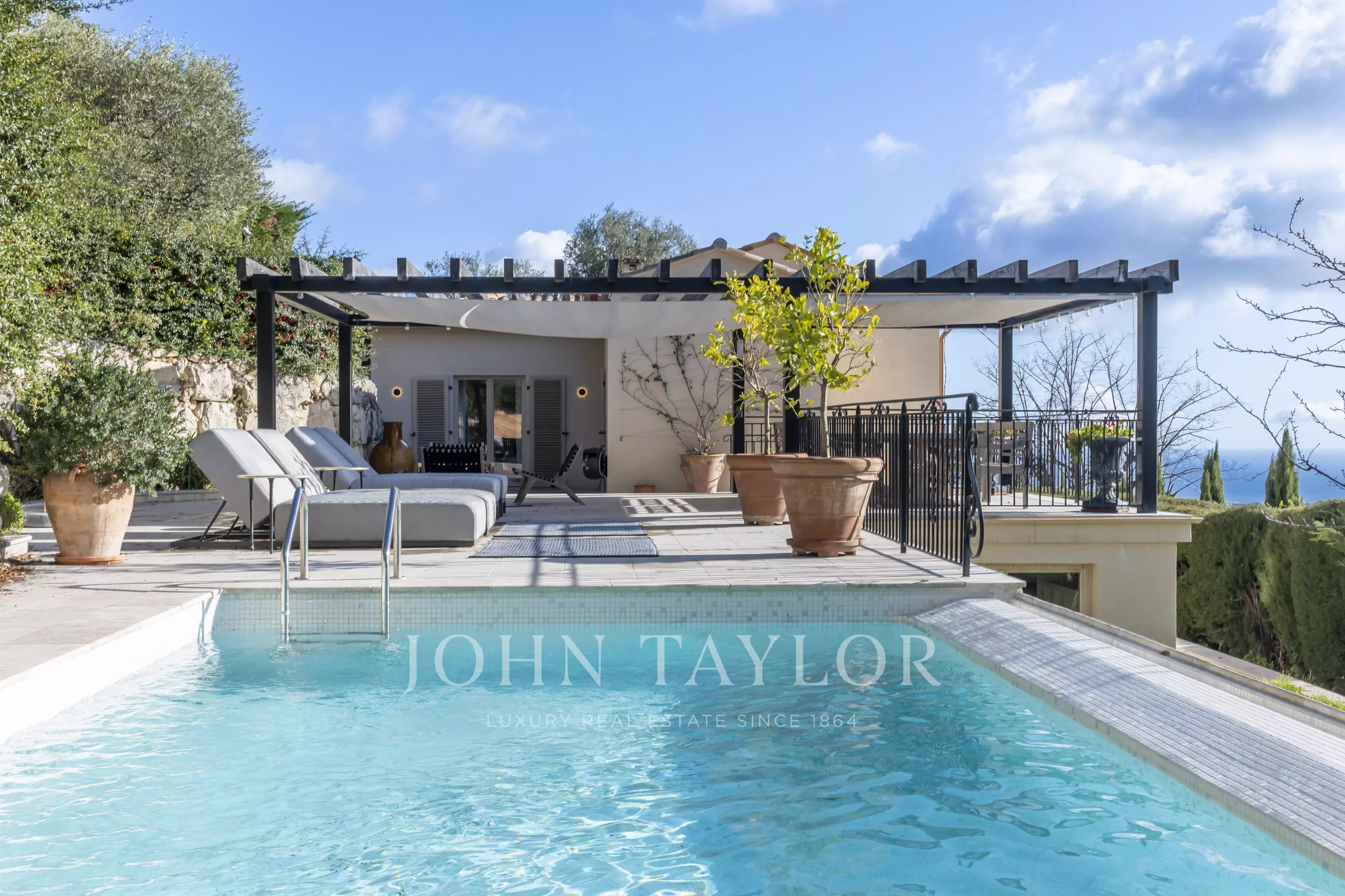 Located in the charming village of Tourrettes-sur-Loup, this property offers a peaceful, privileged setting, with unobstructed views of the sea and surrounding hills.
