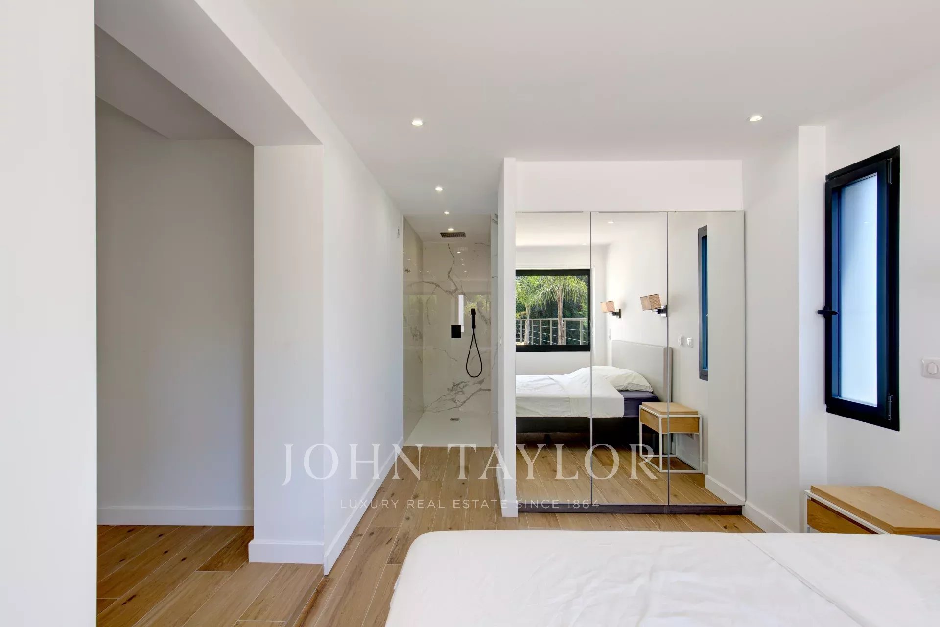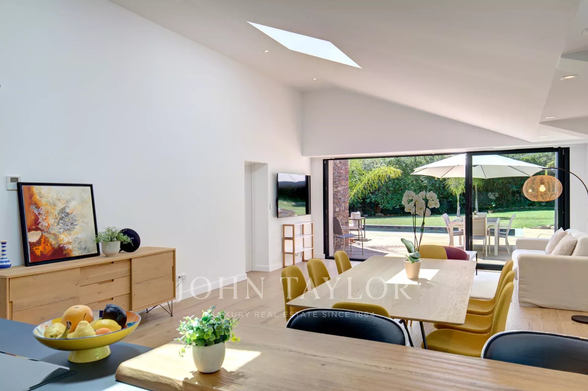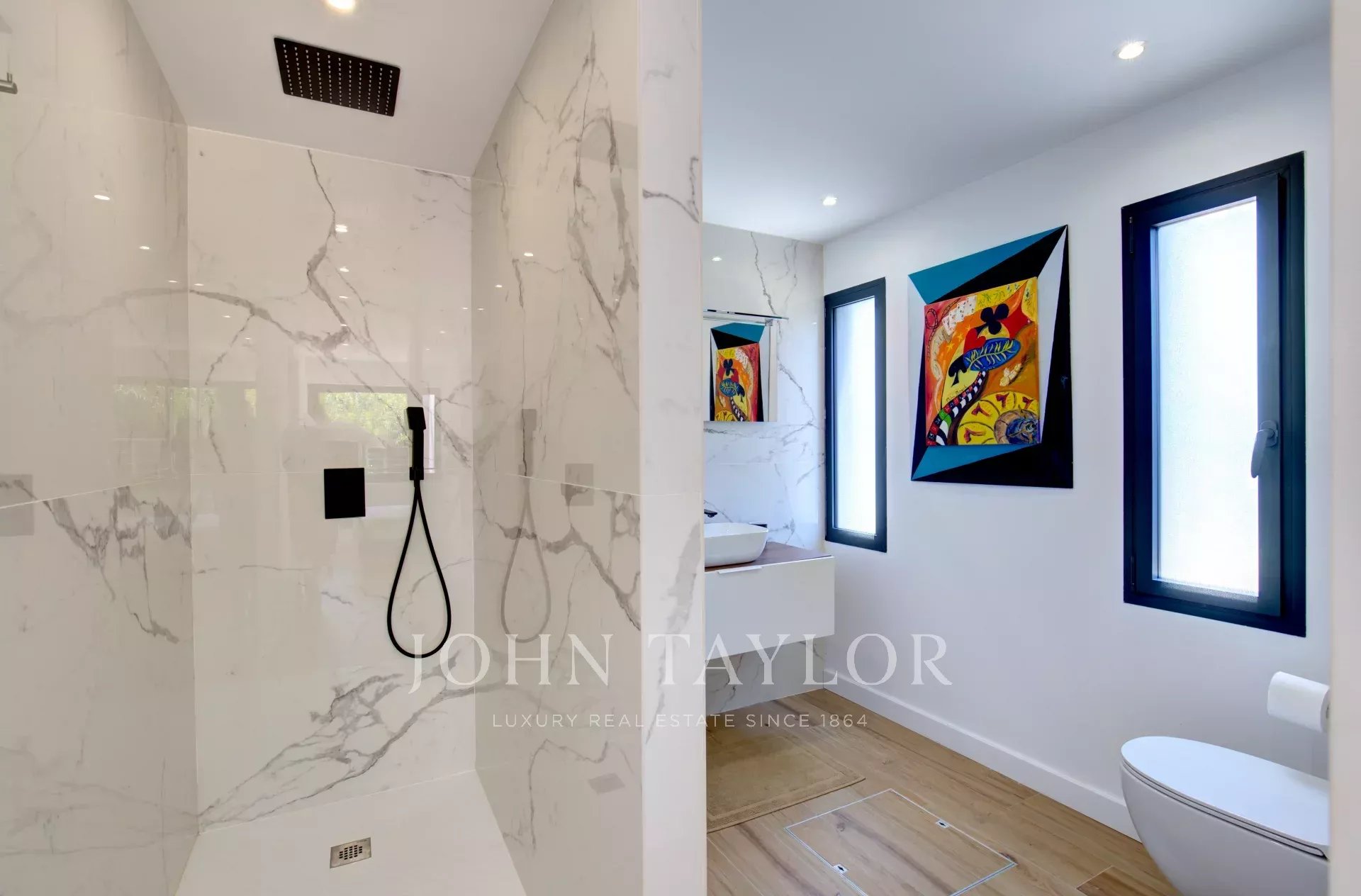 The ground floor features a large living room opening onto the outside, a fully-equipped open kitchen and two bedrooms with en suite shower rooms and dressing rooms.