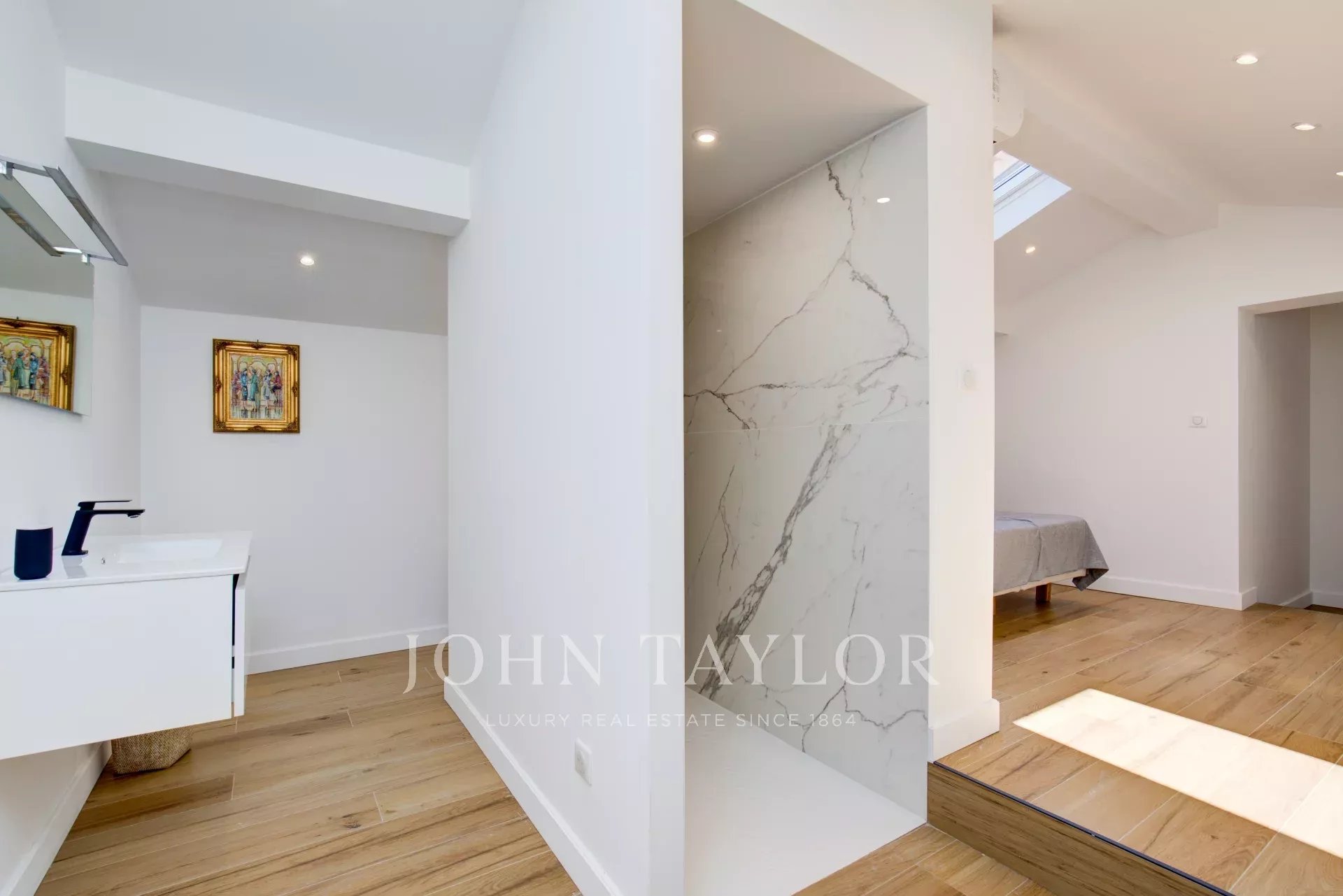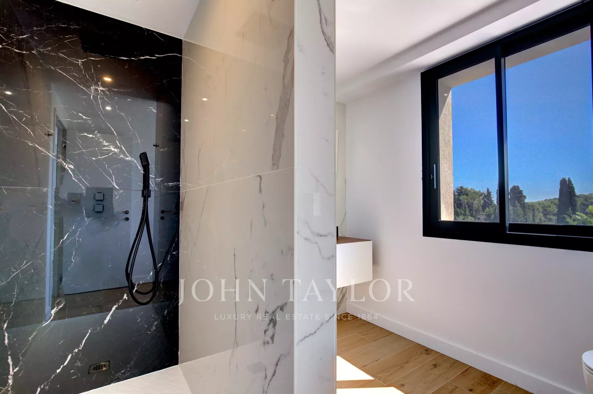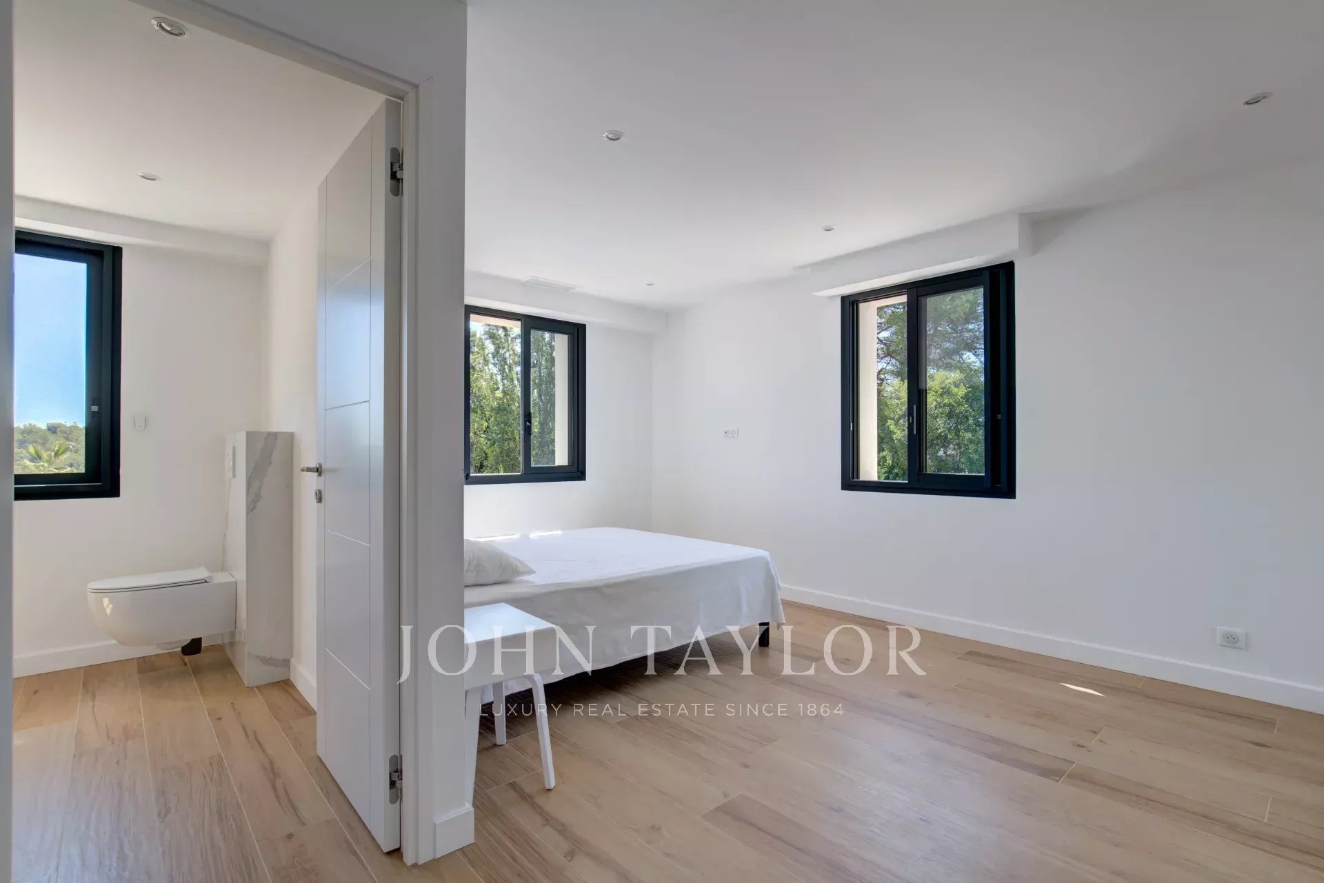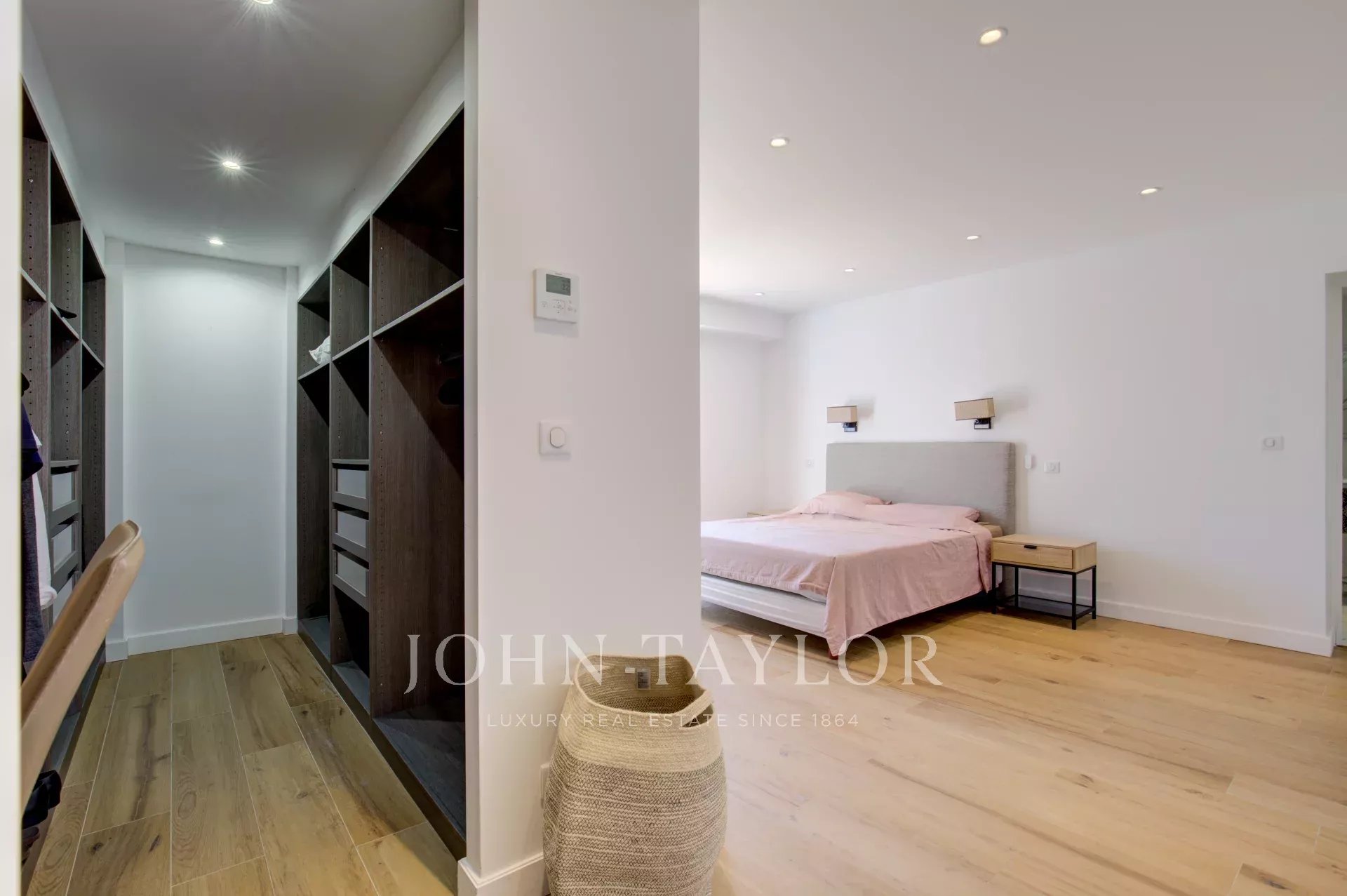 The ground floor features a large living room opening onto the outside, a fully-equipped open kitchen and two bedrooms with en suite shower rooms and dressing rooms.