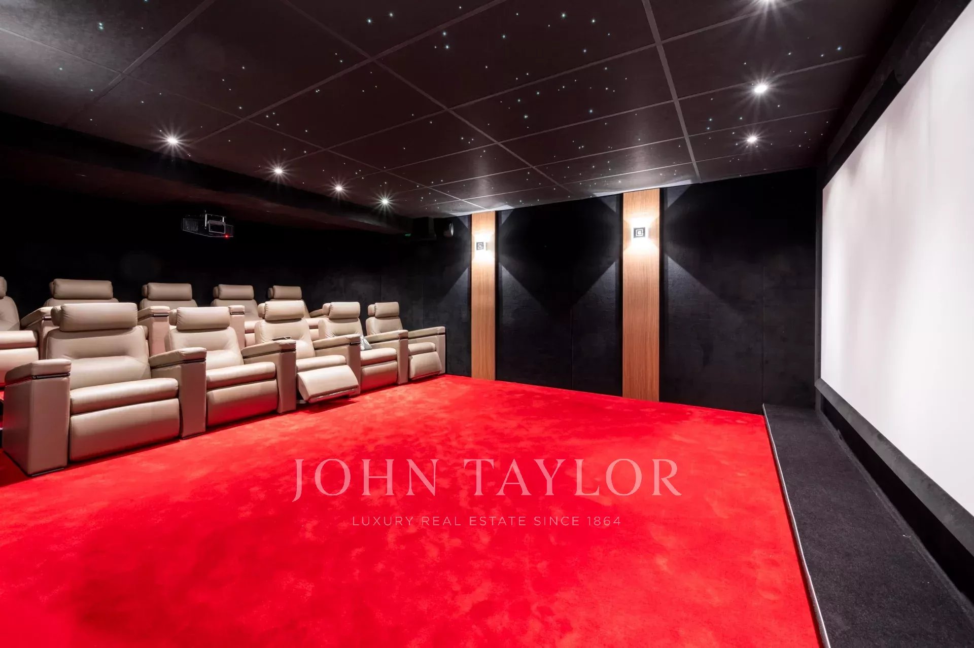 It comprises : Entrance hall, living room with central fireplace and access to a large terrace and flat garden planted with trees, fully equipped kitchen opening onto dining room with access to a lovely sheltered terrace, 5 en suite bedrooms, relaxation area (hamman, sauna and massage room, fitness room) and cinema room. Staff area with en suite bedroom and kitchenette.