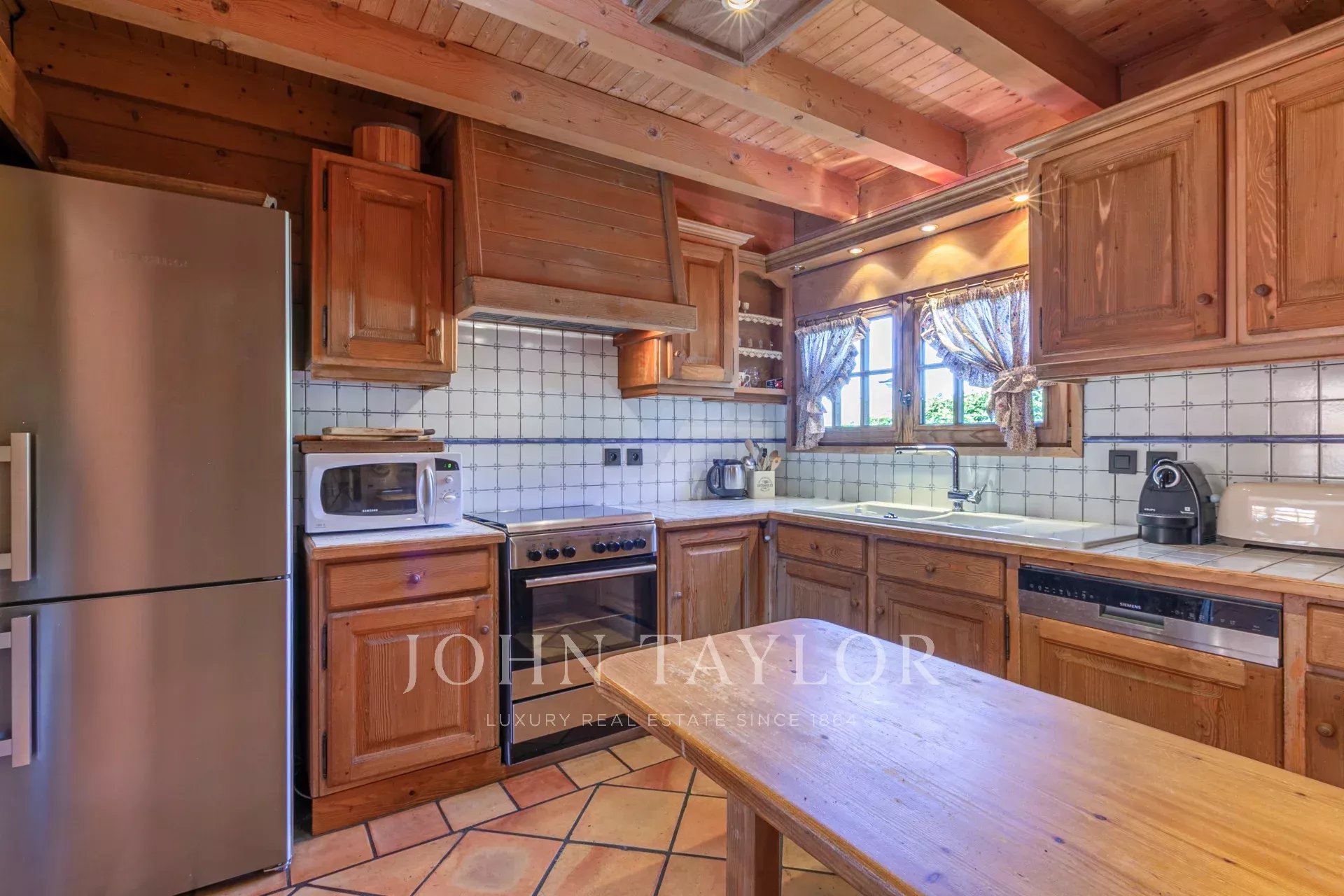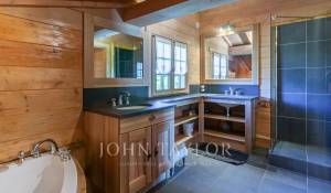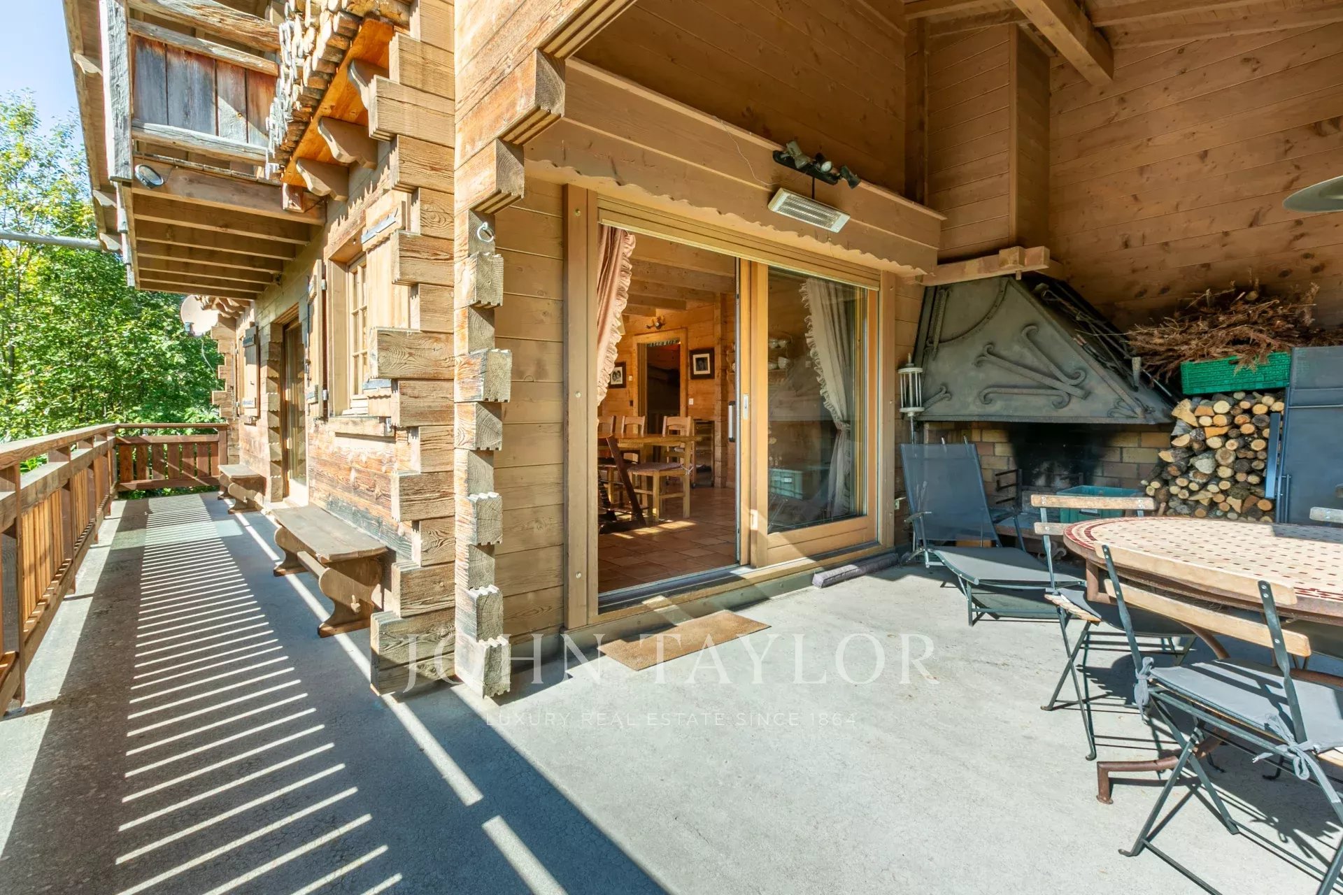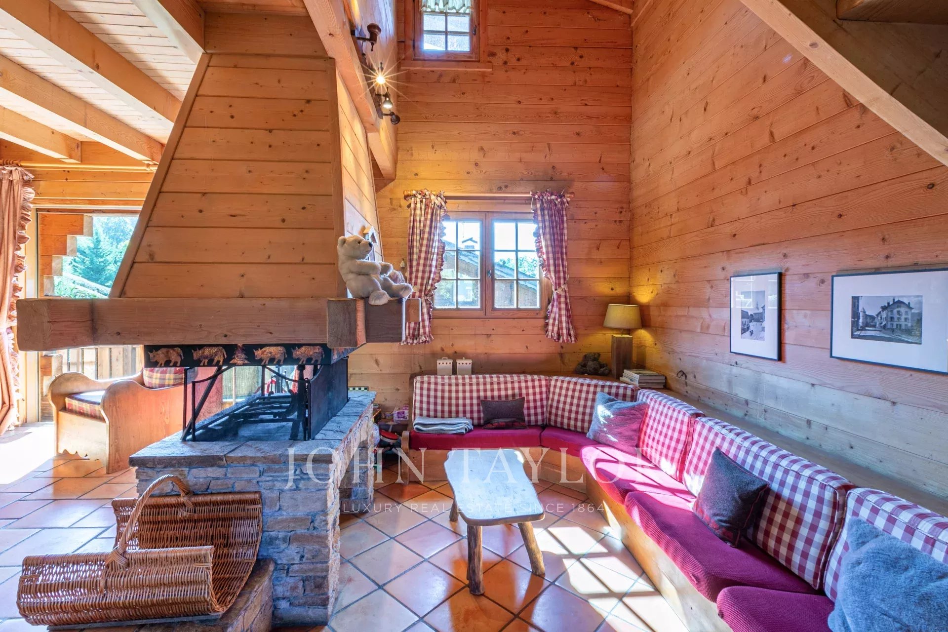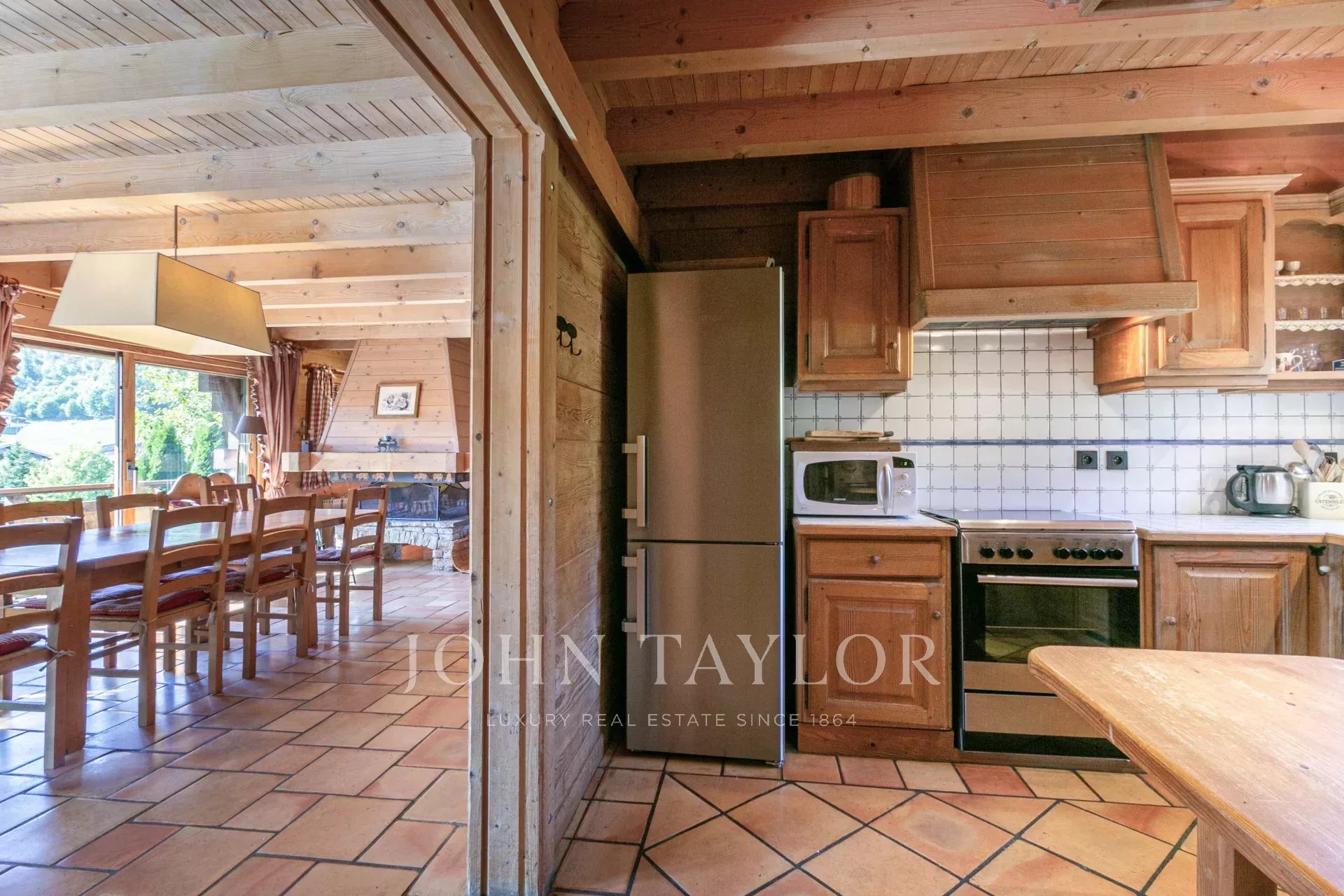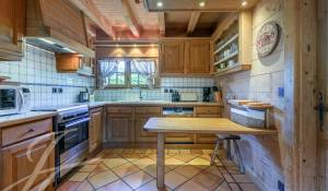 Entrance hall, double living room with central fireplace, fitted and equipped kitchen opening onto the dining room with access to a large terrace and garden, 5 bedrooms, 2 of which are en suite. A 1-space garage with large ski room.