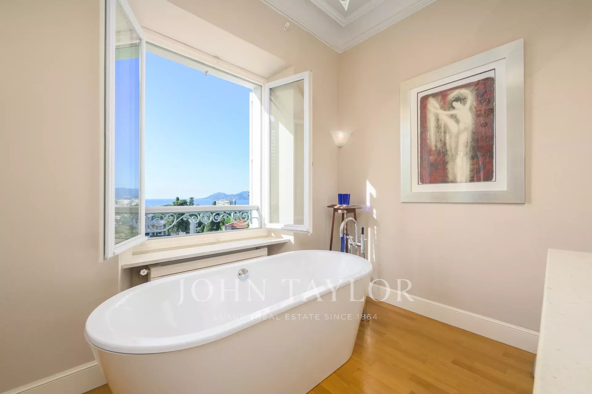 In a private and secure park, just 10 minutes from the famous Croisette, discover this rare and refined apartment occupying the entire top floor of an emblematic 1875 villa. This exceptional property combines the charm of a historic building with top-of-the-range modern amenities, and offers panoramic sea views over the Bay of Cannes and the Esterel Mountains.