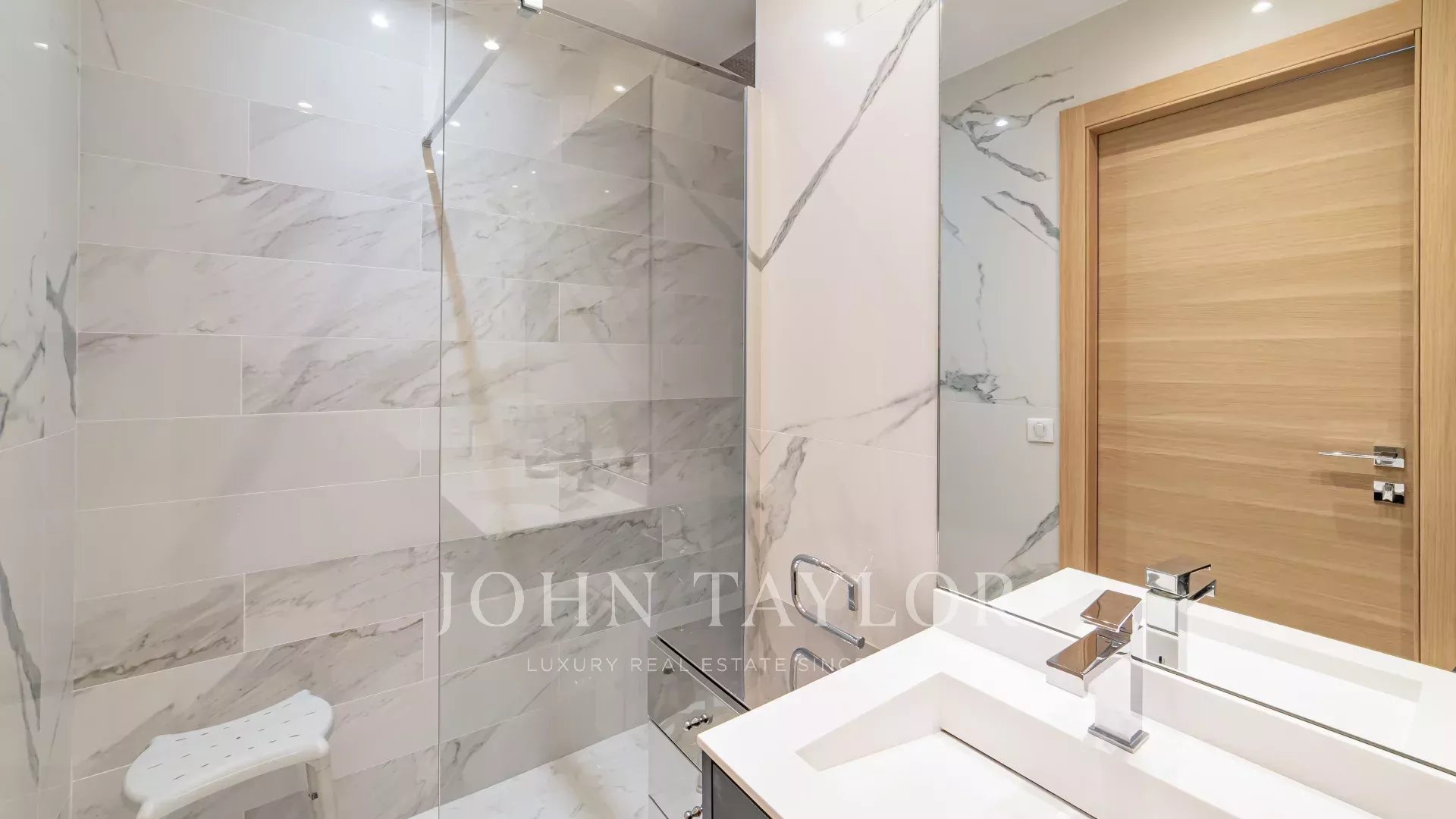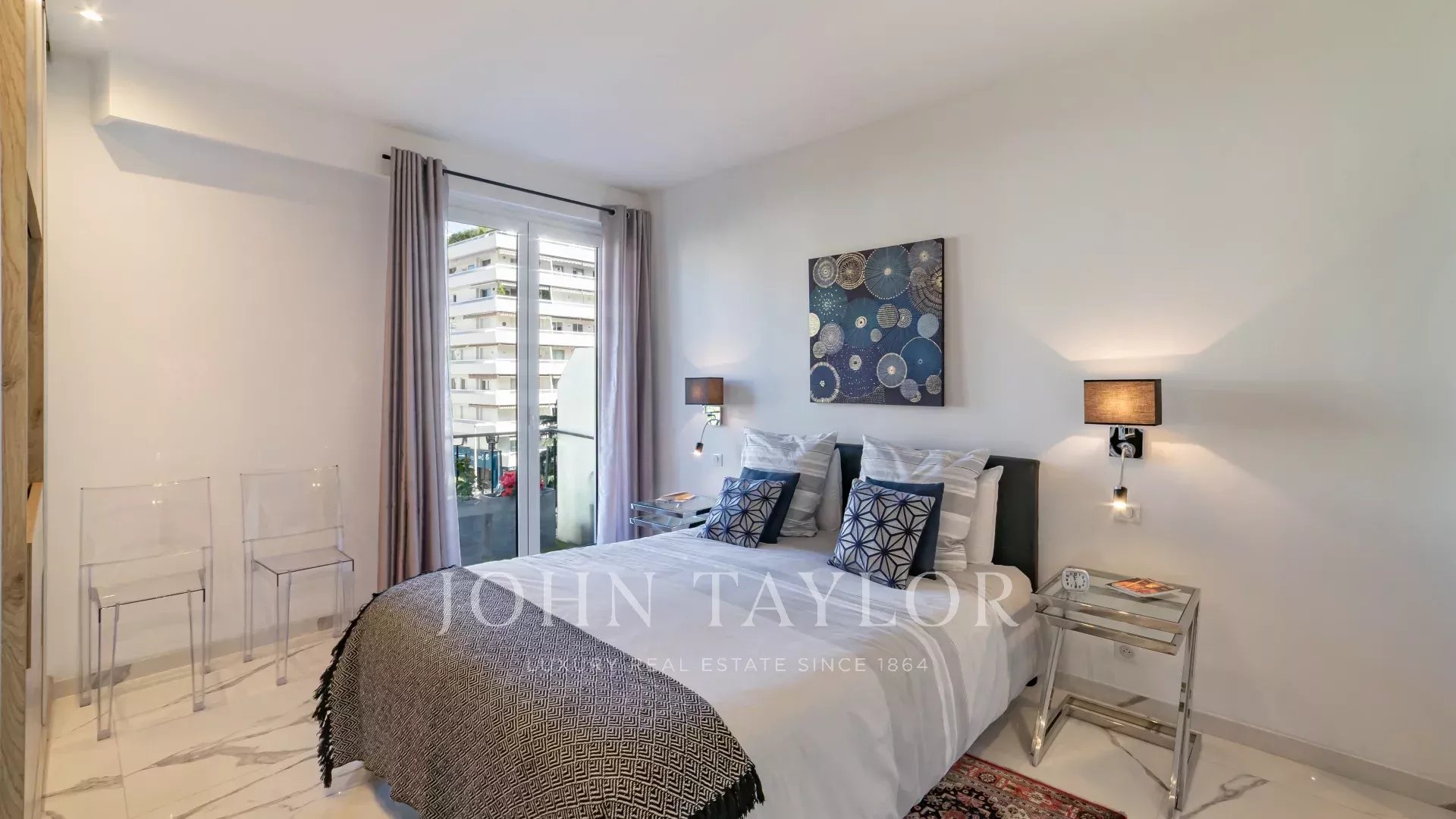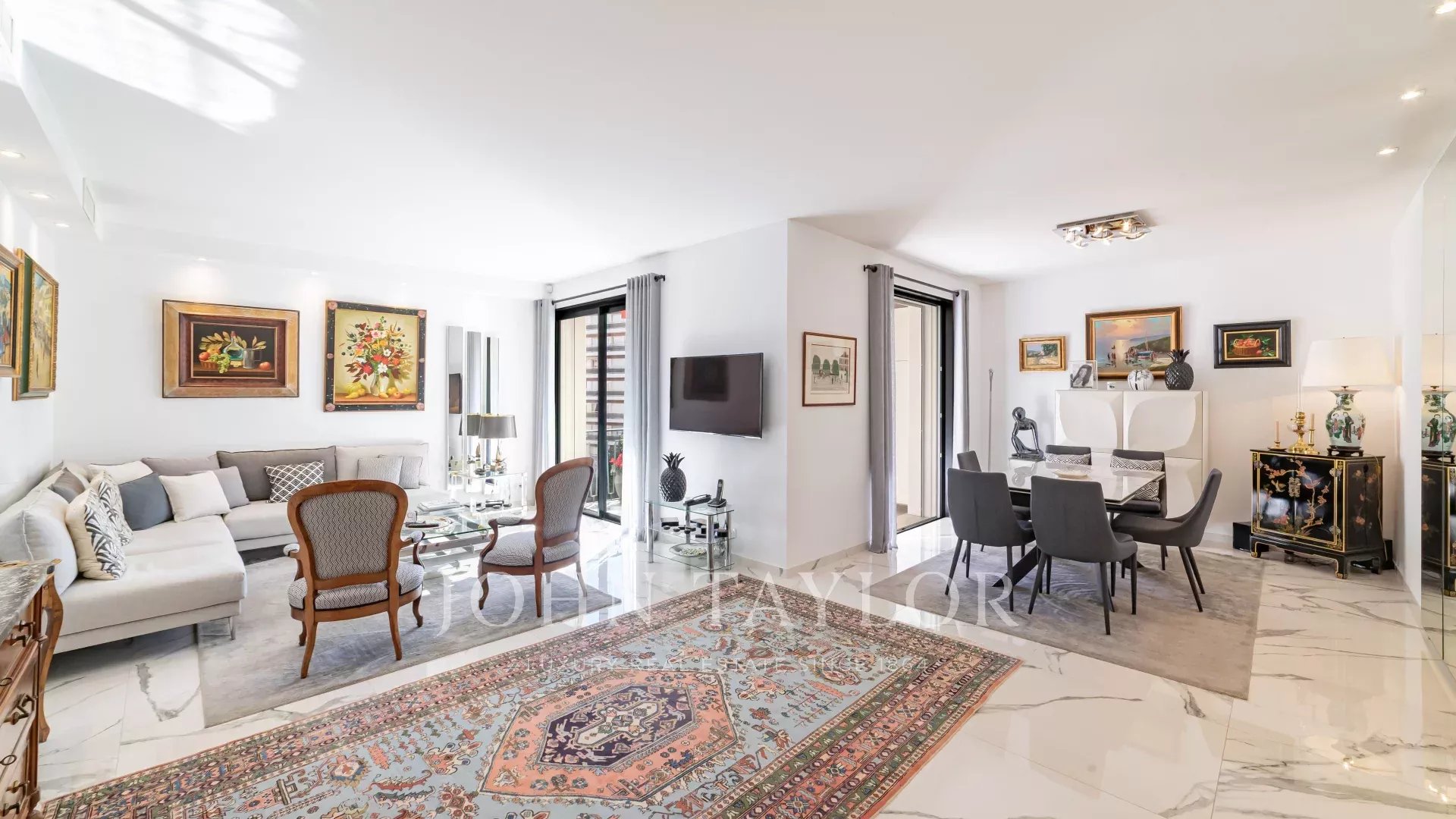 Situated in a luxurious residence between the Croisette and Rue d'Antibes, this stunning 110 sqm apartment with a terrace and balcony has been recently renovated. It features a spacious 41 sqm living room, a master bedroom with an en-suite shower room, two additional bedrooms, a separate shower room, an independent WC, and a fully equipped kitchen. In the basement a confortable size garage comes with this rare apartment.