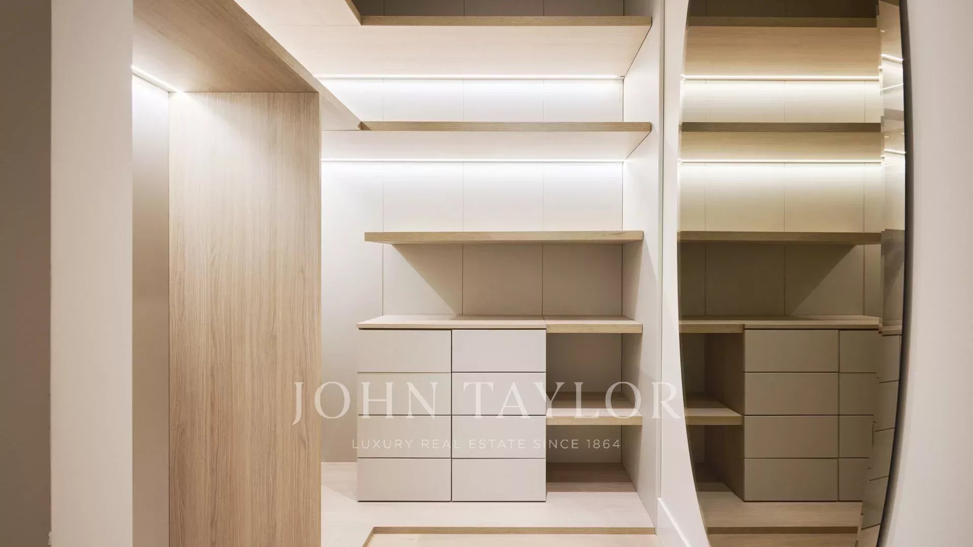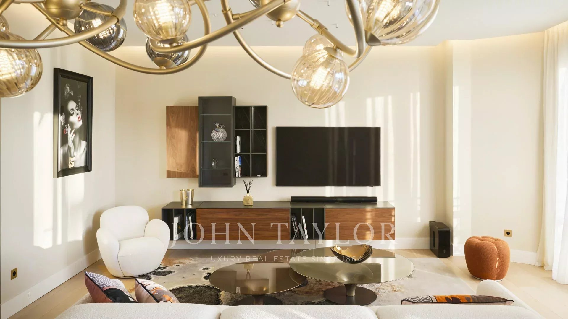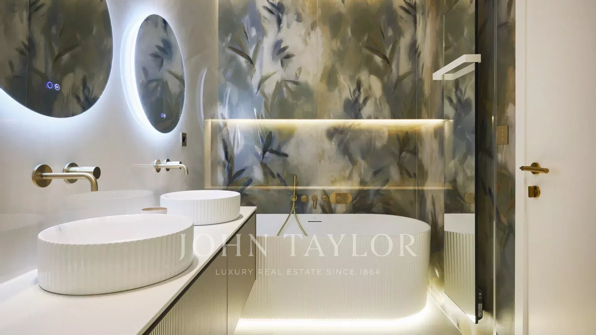 The apartment comprises an entrance hall, an open-plan kitchen opening onto a spacious living room and a bright dining room. It has two en suite bedrooms, each with its own shower room, a master bedroom with dressing room, shower and bath, as well as a guest toilet and laundry room.