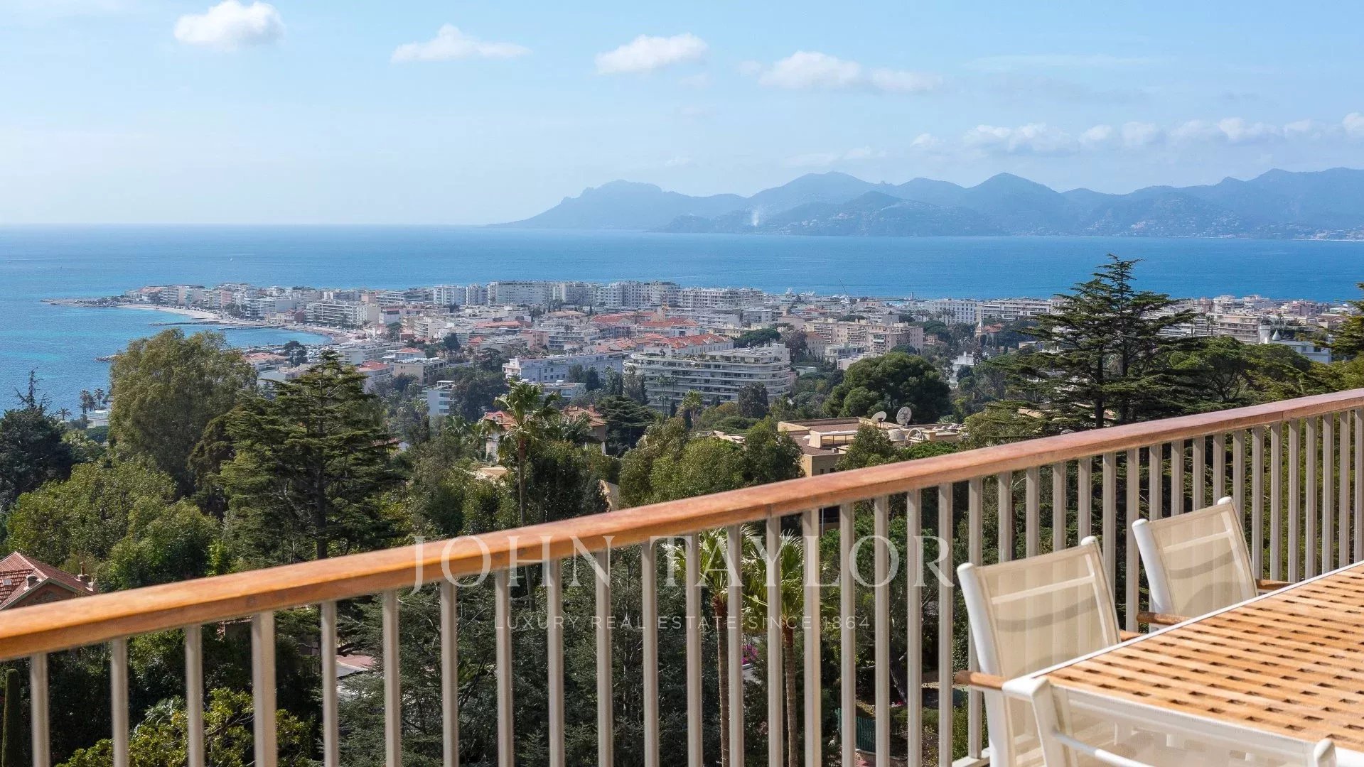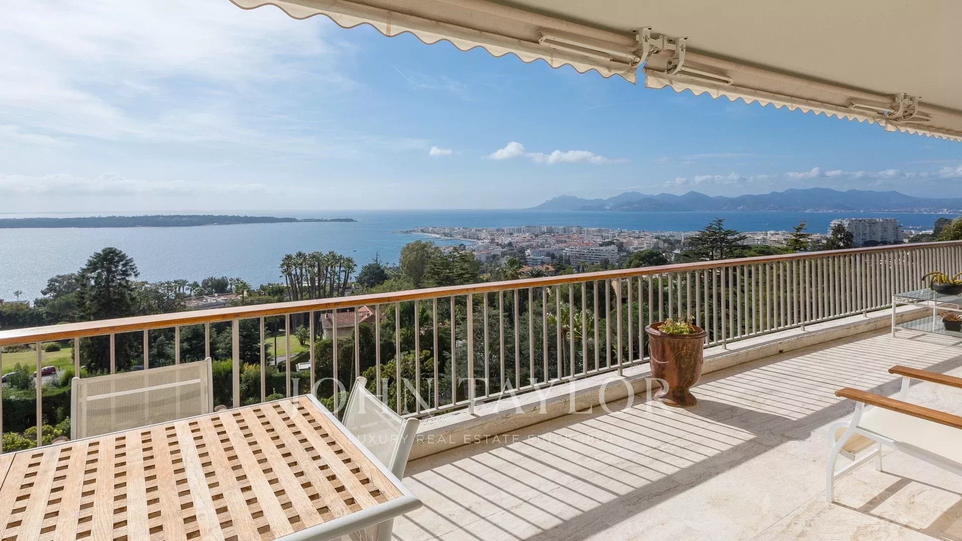 Located in a prestigious residence with swimming pool, tennis court, shuttle service and concierge, this sumptuous 190 m² corner apartment on a high floor offers panoramic views of the sea, the Lérins islands, the Bay of Cannes and the Esterel Mountains.