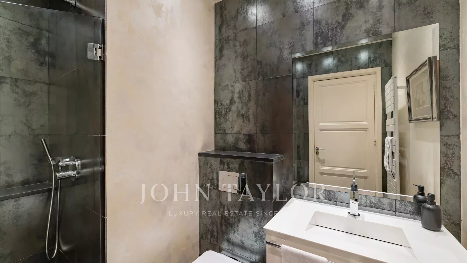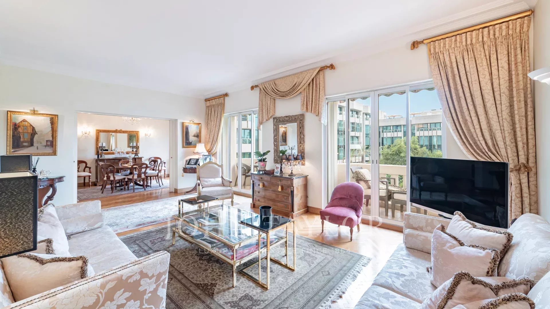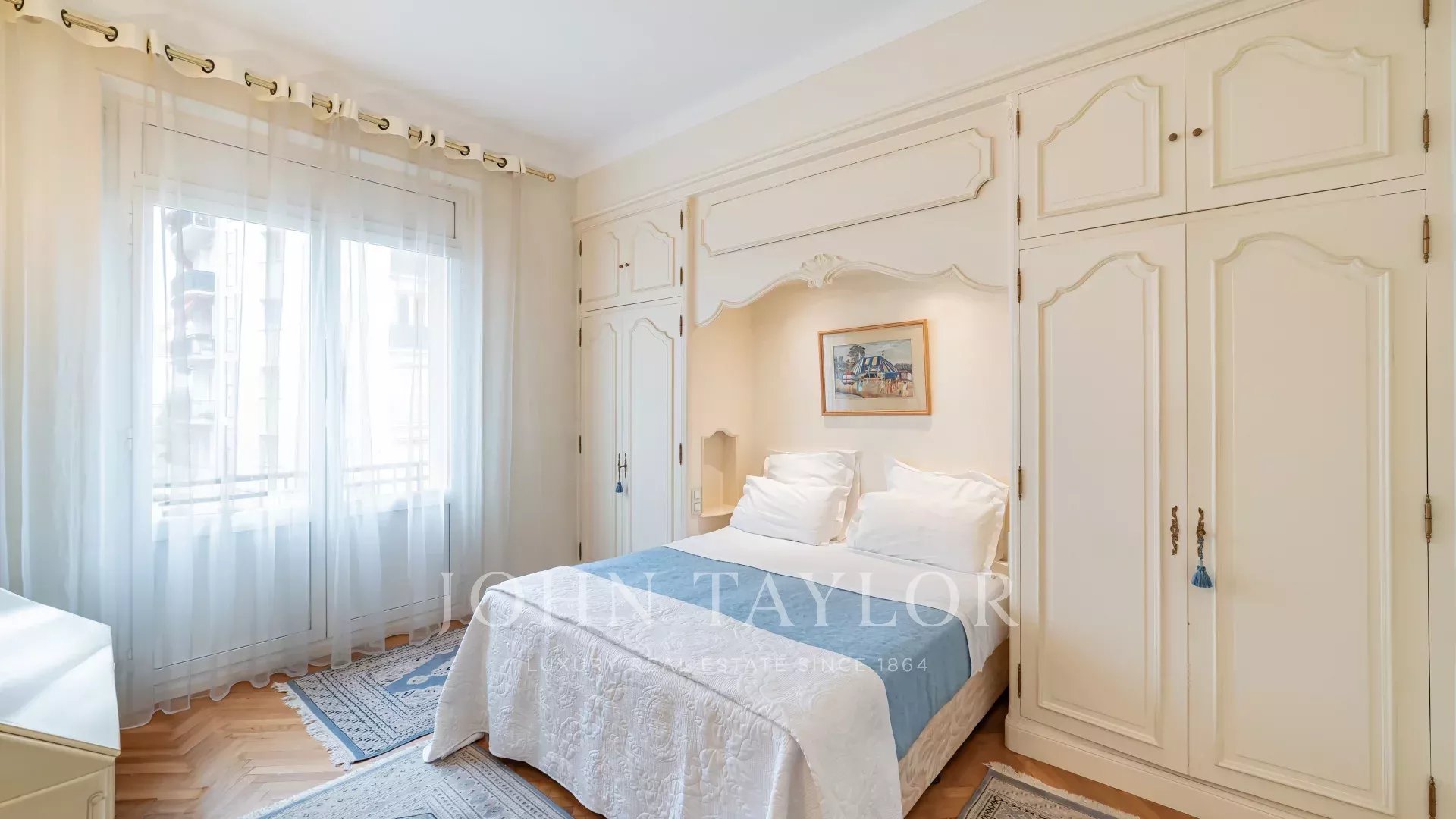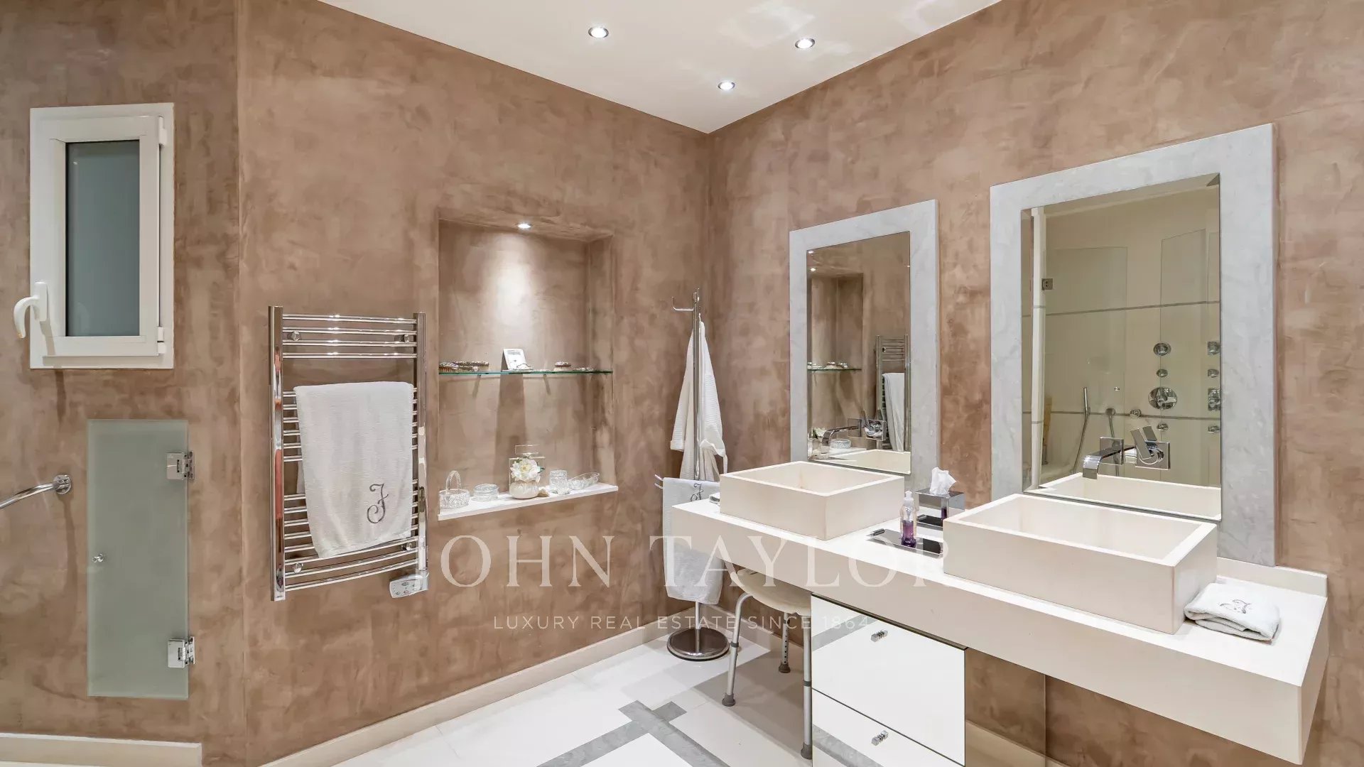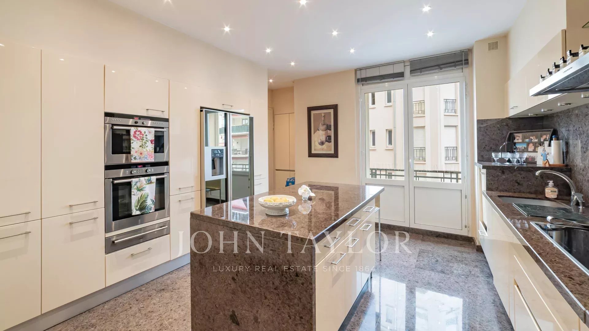 It comprises an entrance hall, a vast hall with dressing room leading to a luminous, south-facing double living room with large bay windows. The kitchen, in brown granite and fully equipped with top-of-the-range appliances, is complemented by a functional laundry area.
